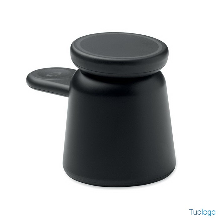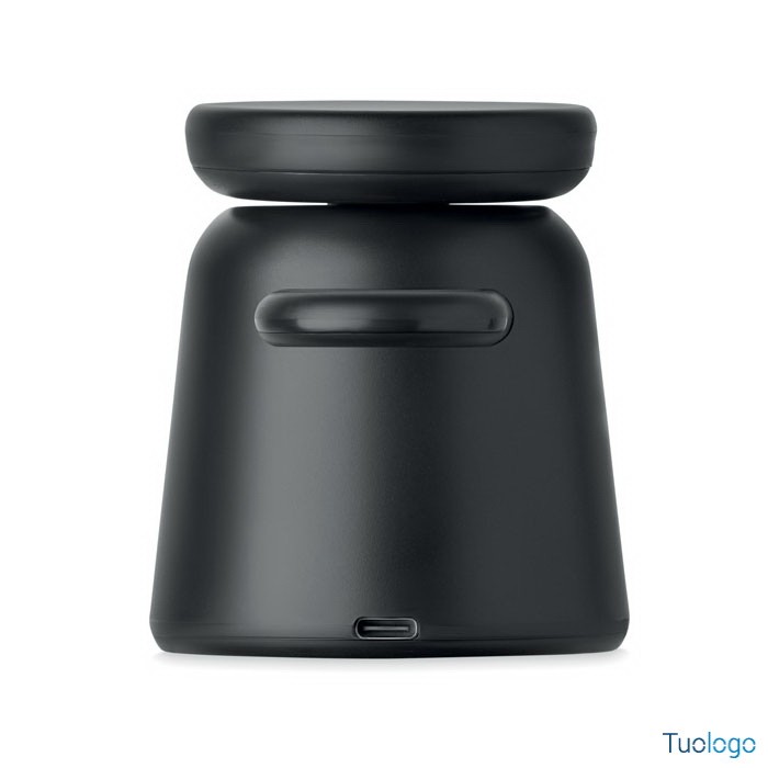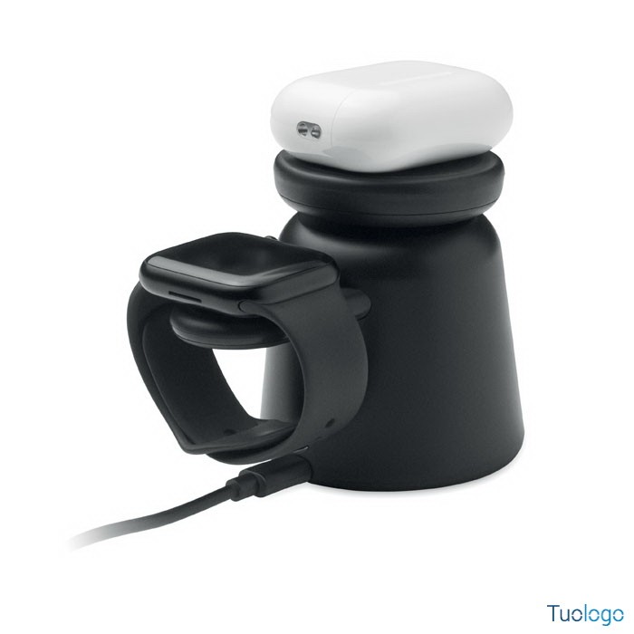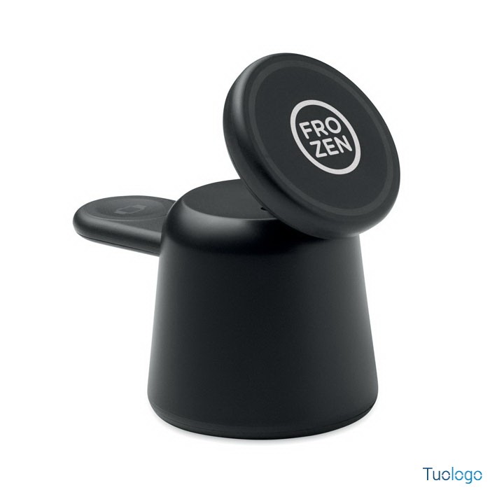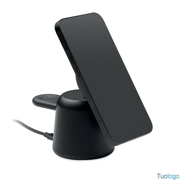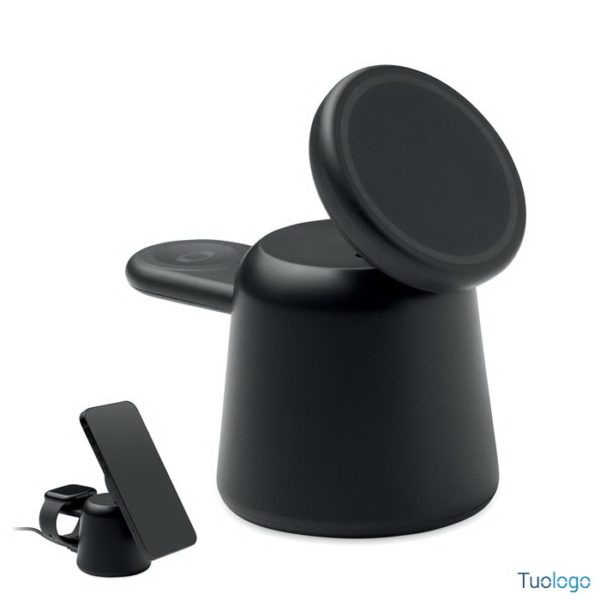 Stazione di ricarica Chester. Stazione di ricarica 3 in 1 in ABS con caricatore wireless magnetico da 15W per telefono e TWS con funzionalità di supporto del telefono e caricatore per smartwatch. Dimensioni: 10,2x7,1x12cm