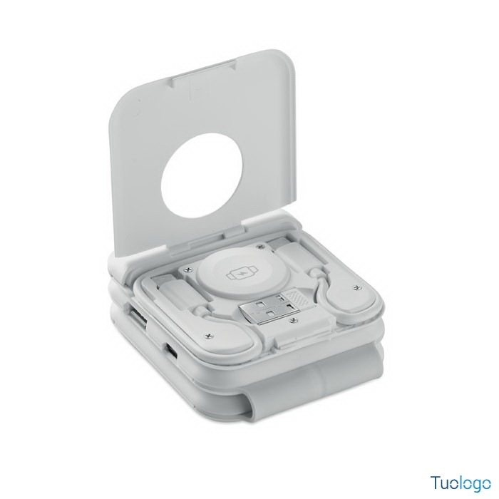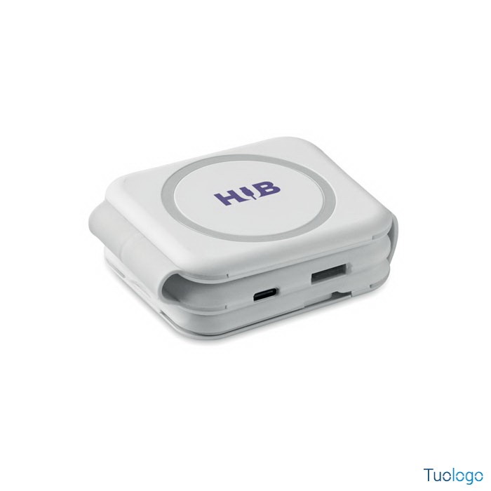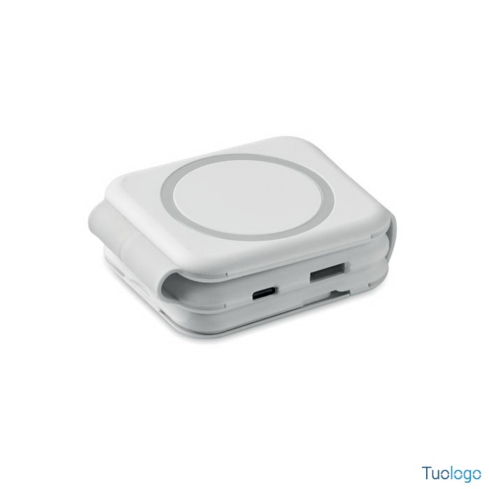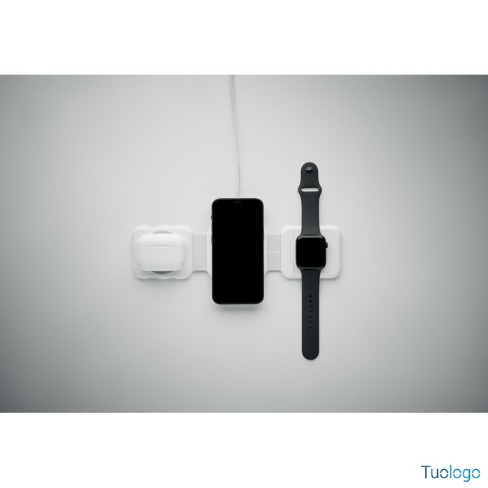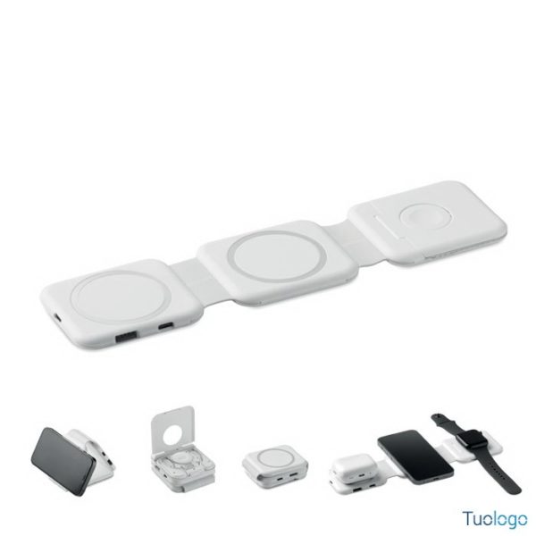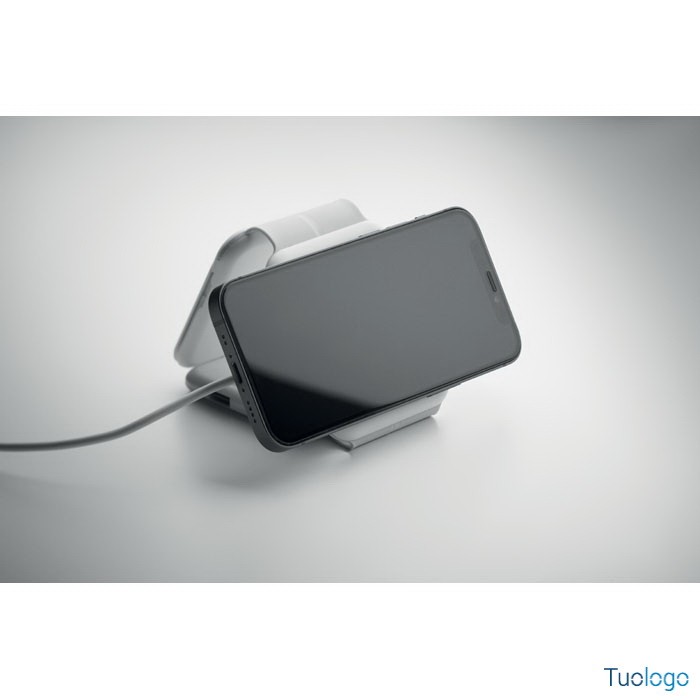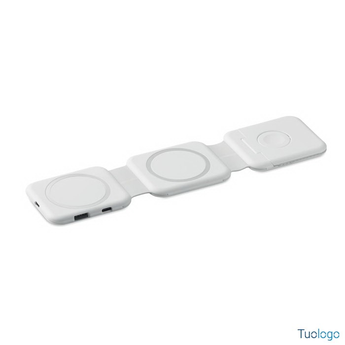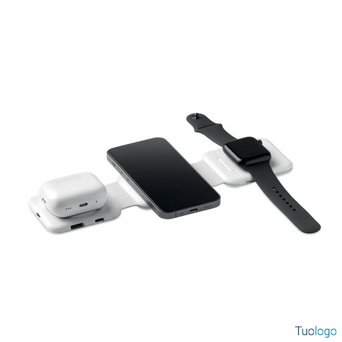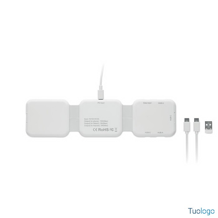 Stazione di ricarica magnetica wireless Vano. Stazione di ricarica magnetica wireless in ABS. 1 x 15W, 1 x 5W per TWS e 1 caricatore per Apple Watch 3W. Dimensioni: cm 6,5x26x0,86. 2 connettori Tipo-C e 2 USB-A. Ingresso cavo integrato: connettore da Type-C a USB-A.
