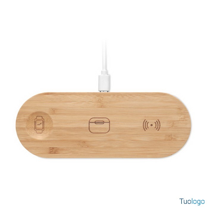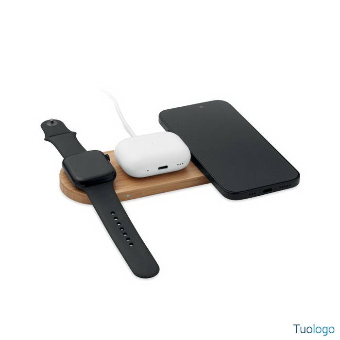Stazione di ricarica Manja. Stazione di ricarica 3 in 1 con custodia in bambù. Include un caricatore wireless da 15W, un caricatore per smartwatch, solo Apple®, e un caricatore TWS. Dimensioni: 16,8x6,4x0,8cm