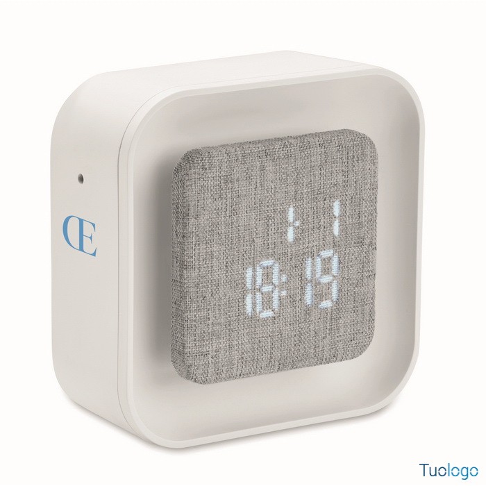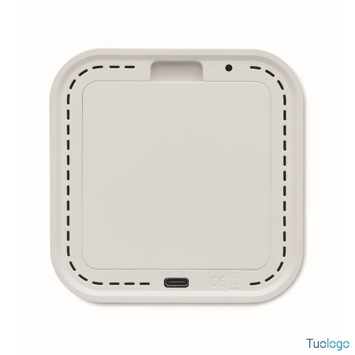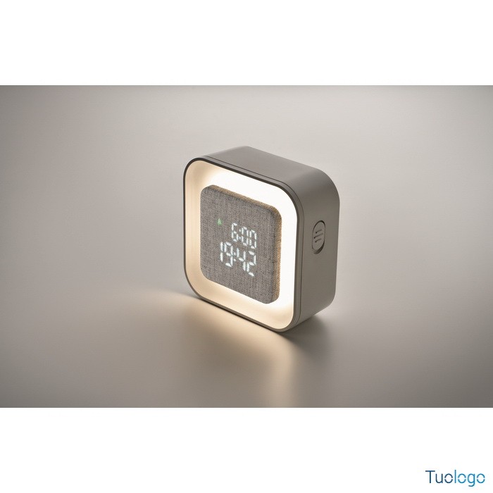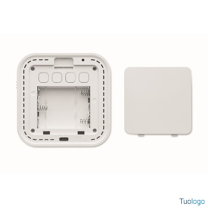 Sveglia Lecu. Sveglia a LED in ABS e RPET riciclato. Visualizzazione dell'anno solare solo in modalità sveglia. Include una luce ambientale regolabile. Dimensioni: cm 9,8X9,8X4.