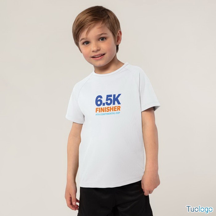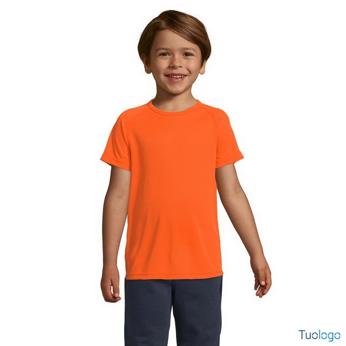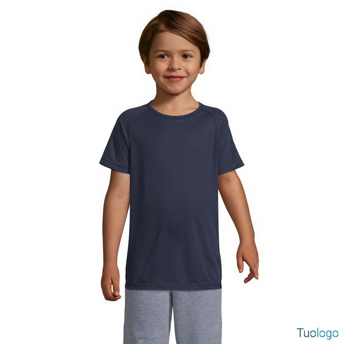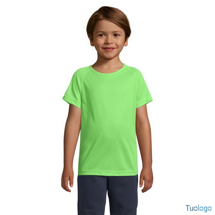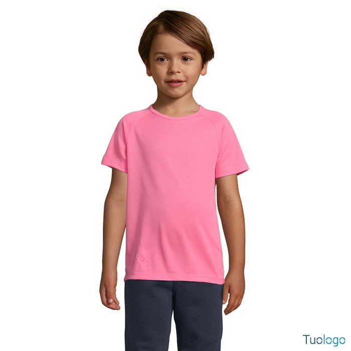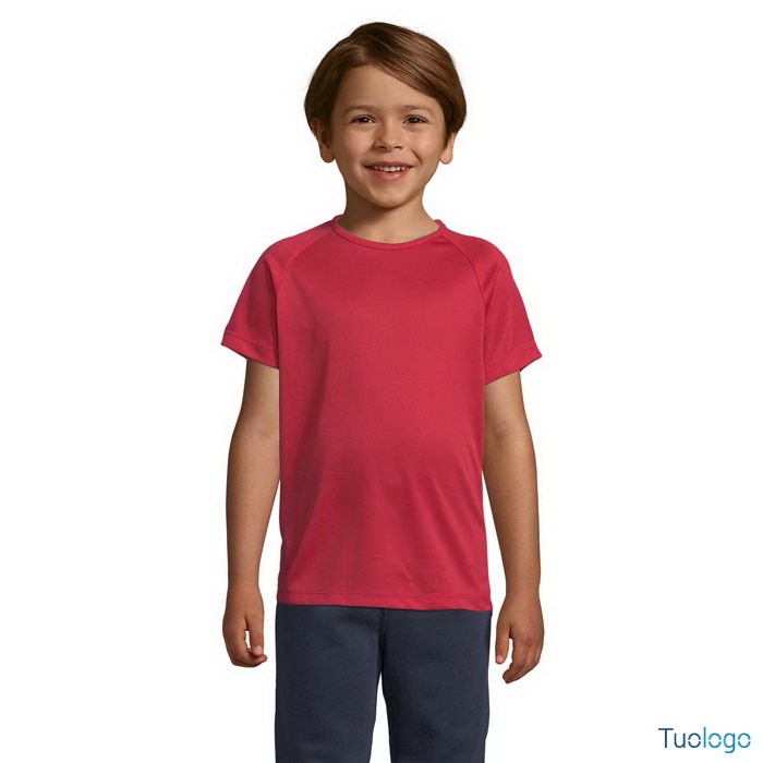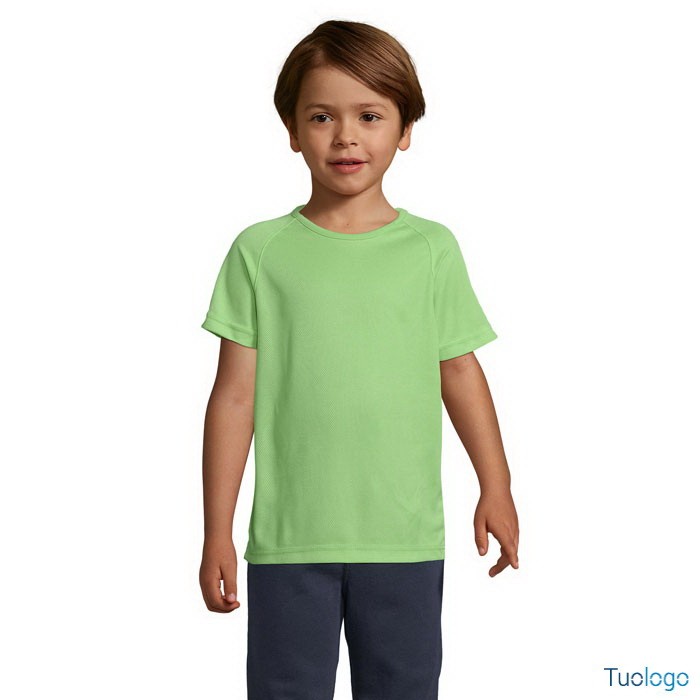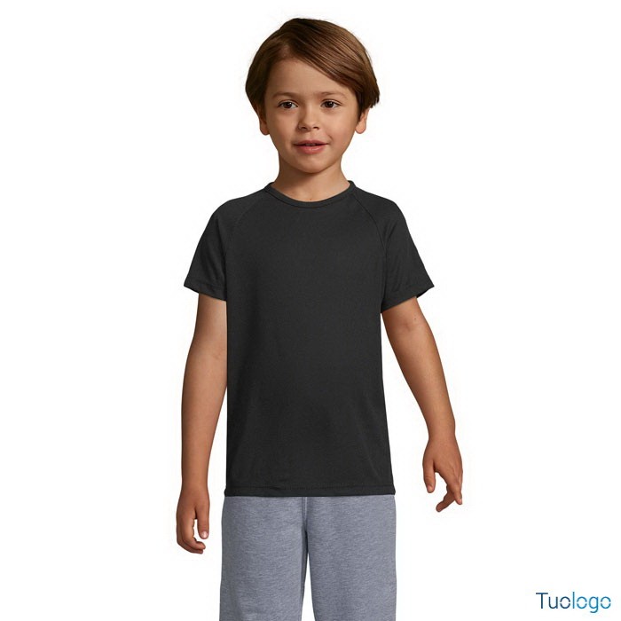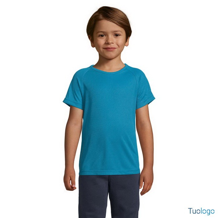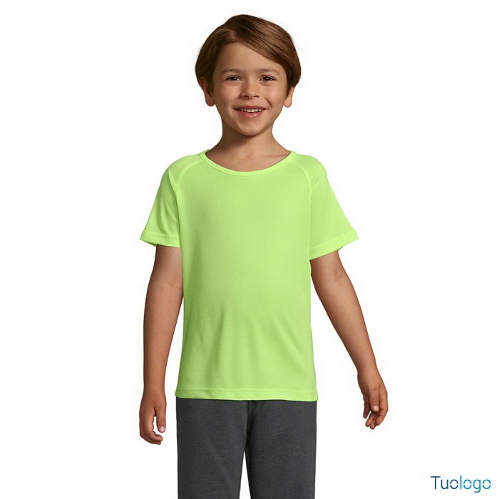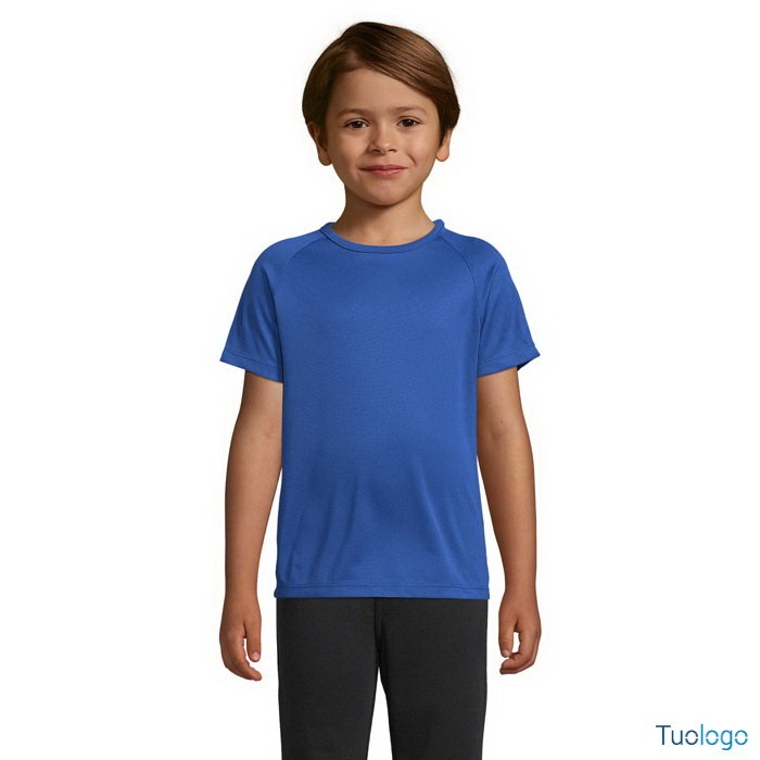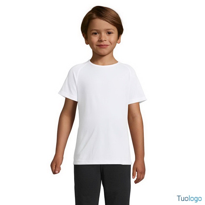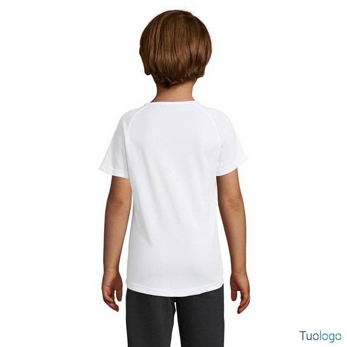 T-shirt bambino Sporty. SOLS. 100% poliestere effetto traspirante 140 gr, girocollo ribassato, maniche a taglio raglan, retro del capo più lungo e arrotondato. Stampa ad 1 colore inclusa.