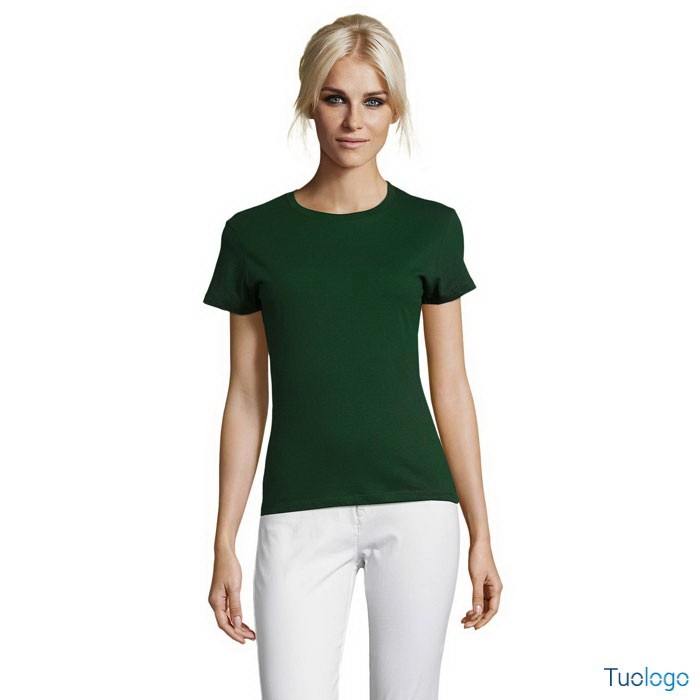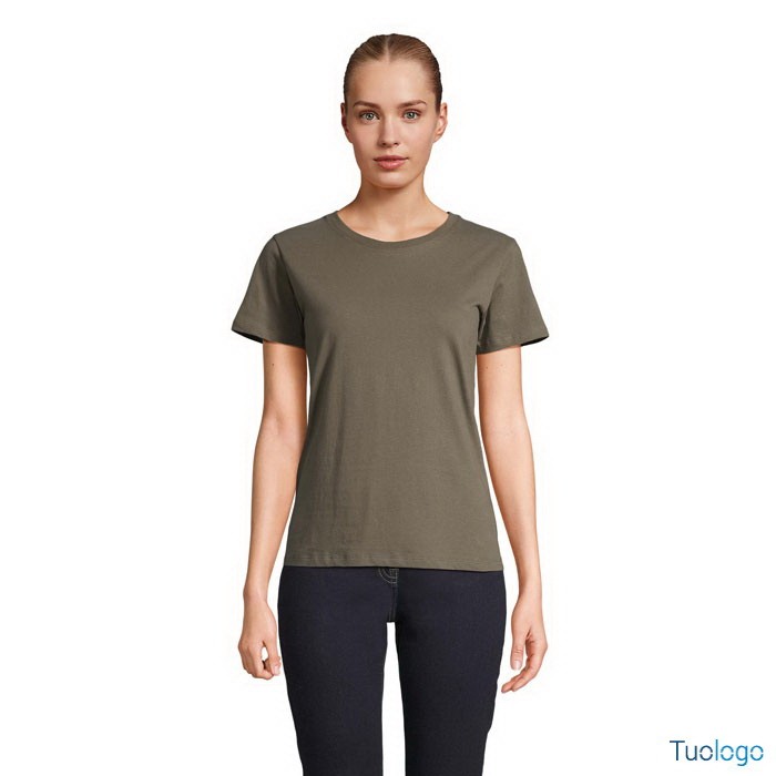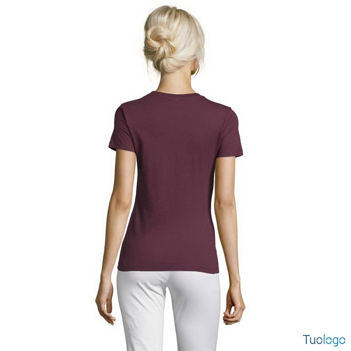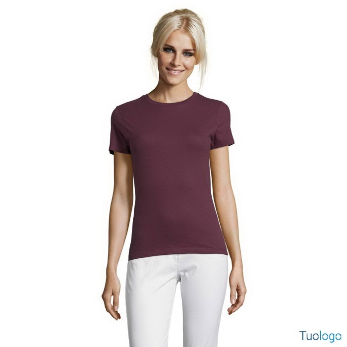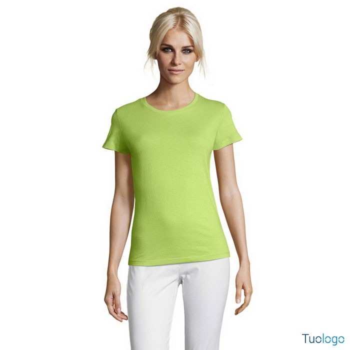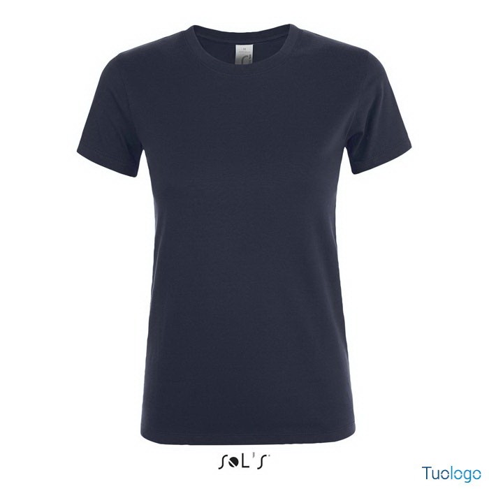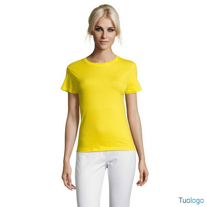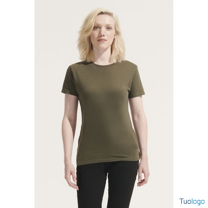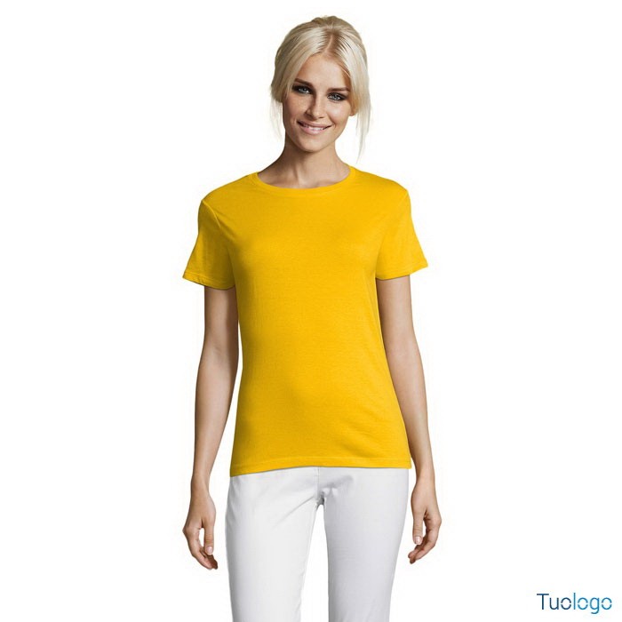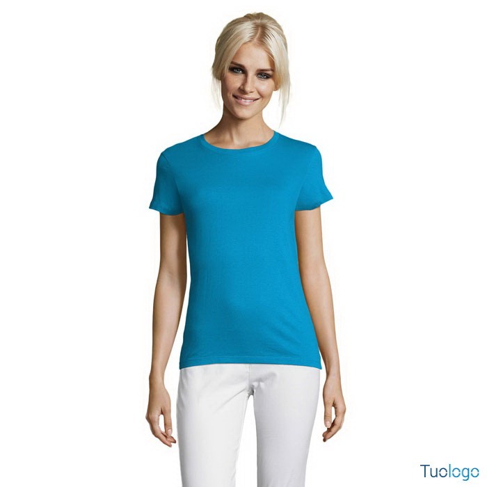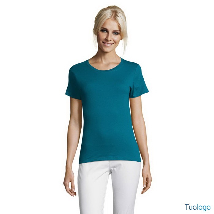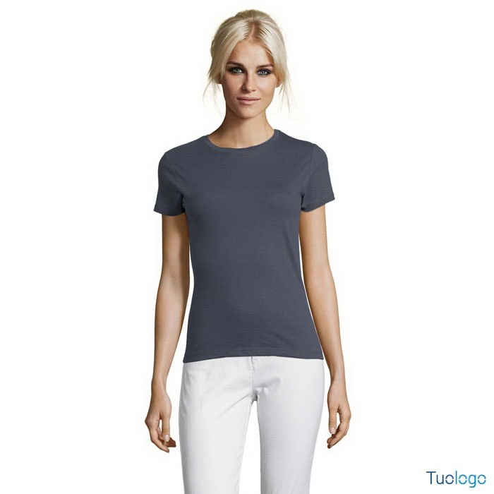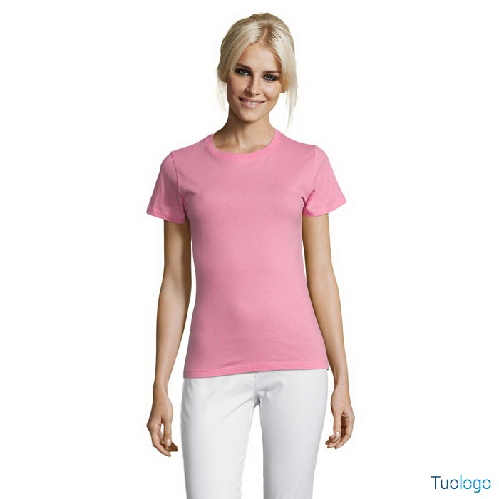 T-shirt donna Domino. SOLS. Manica corta, girocollo, cuciture laterali 100% cotone semipettinato ringspun jersey 150 gr. Cucitura del collo rinforzata e nastrata, collo a coste. Stampa ad 1 colore inclusa.