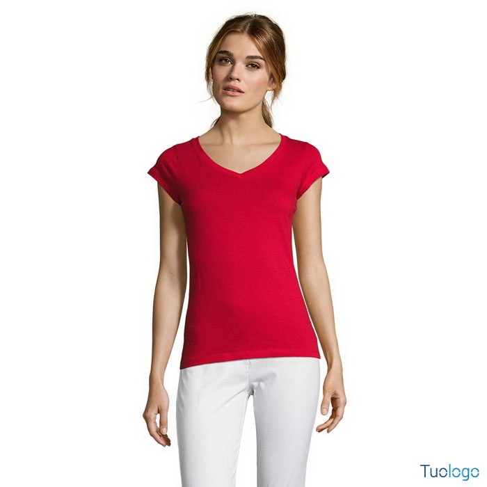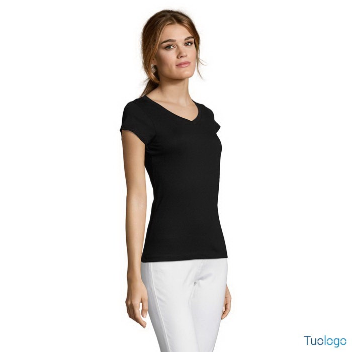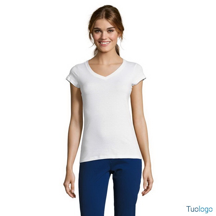 T-shirt donna scollo V Victory. SOLS. Tshirt 150g/m². 100% cotone semipettinato Ringspun, nastro di rinforzo sul collo, maniche corte, punto vita sfiancato, Scollo a V con bordo a costina con elastan. Stampa ad 1 colore inclusa.