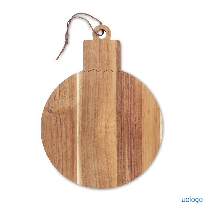 Tagliere Natalizio in legno acacia. Tagliere leggero a forma di pallina di Natale, con cordino in PU. Dimensioni: diam cm 19x26x0,9.