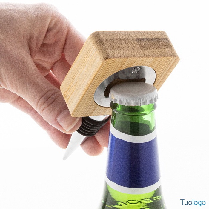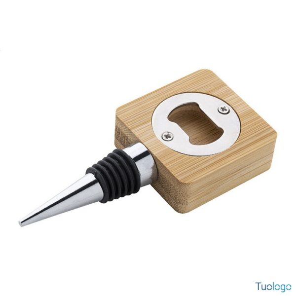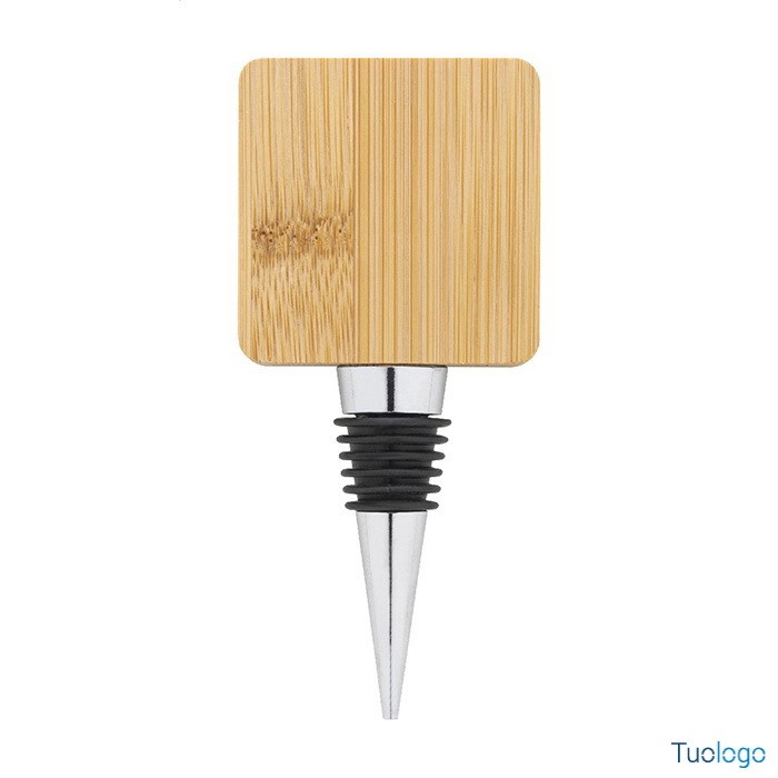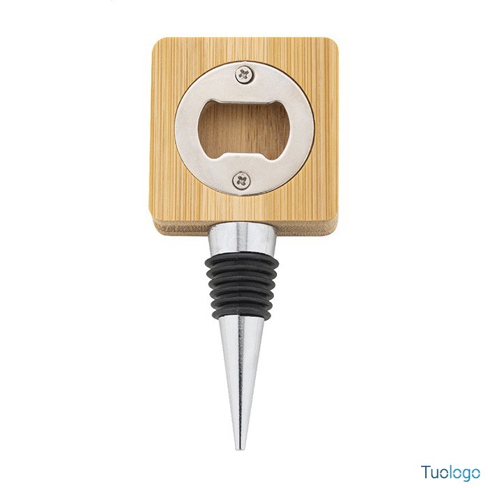 Tappo vino Zarza. Tappo da vino in metallo con struttura quadrata in bamboo ed apribottiglie. Dimensioni: cm 5,5x11,5x2.