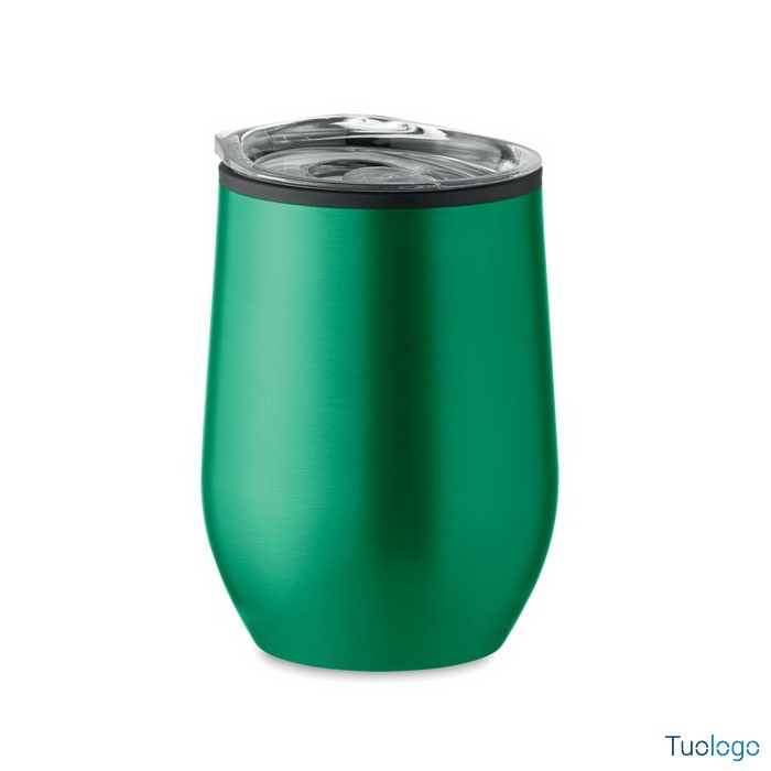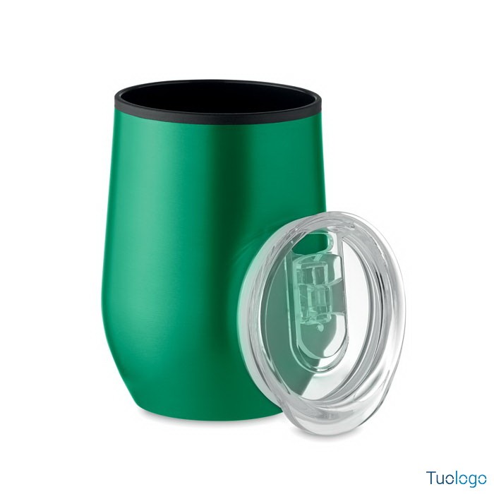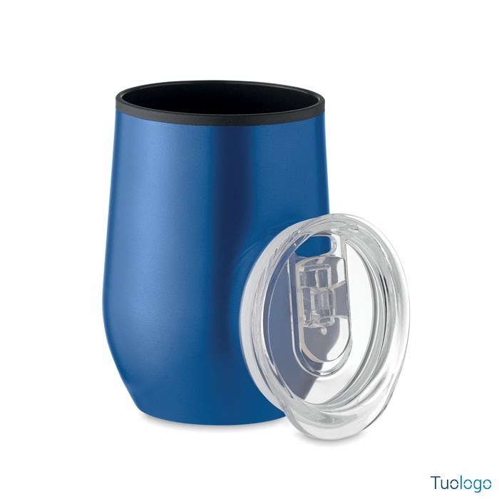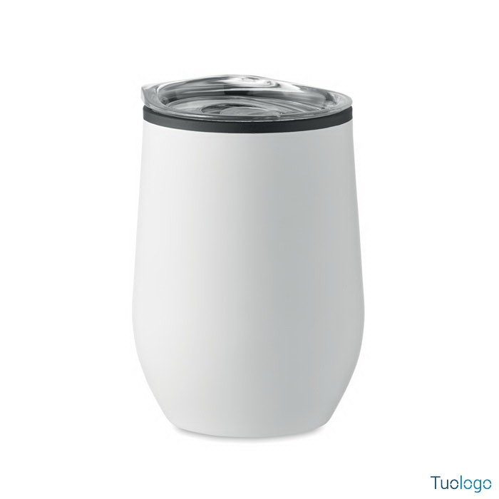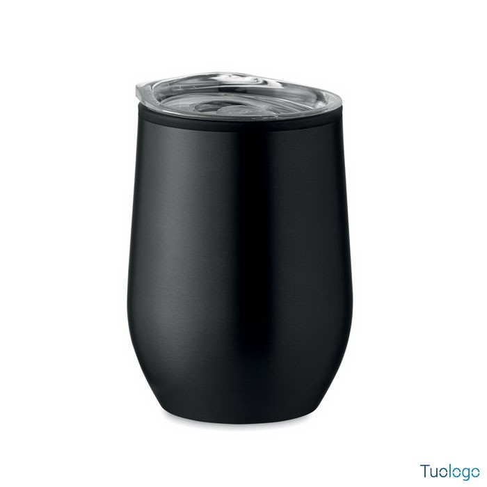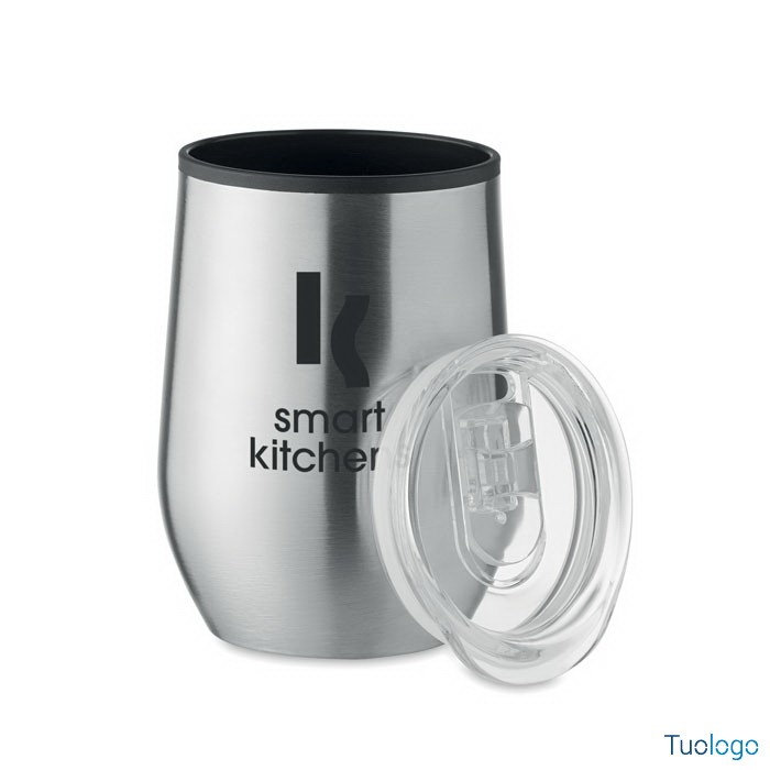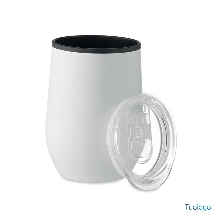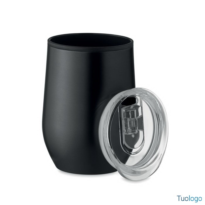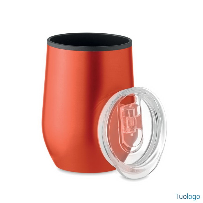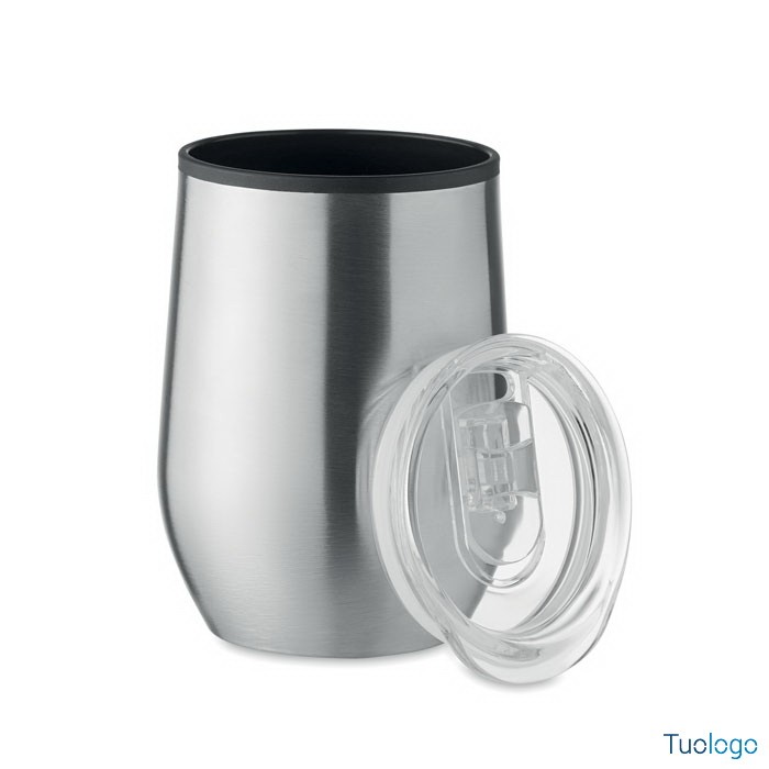 Tazza acciaio Moura. Tazza a doppia strato in acciaio inox con interno in PP e coperchio in PS trasparente. Capacità: 350 ml. Dimensioni: diam cm 8x12.