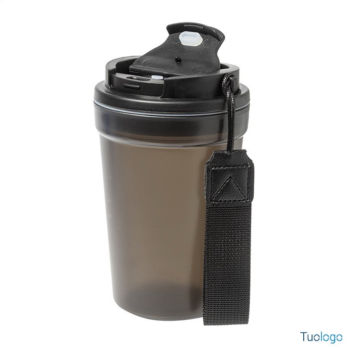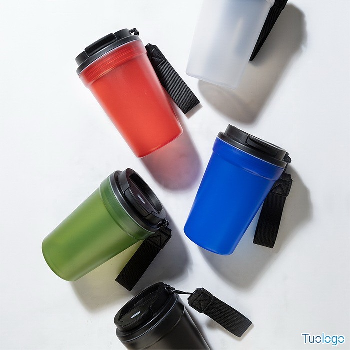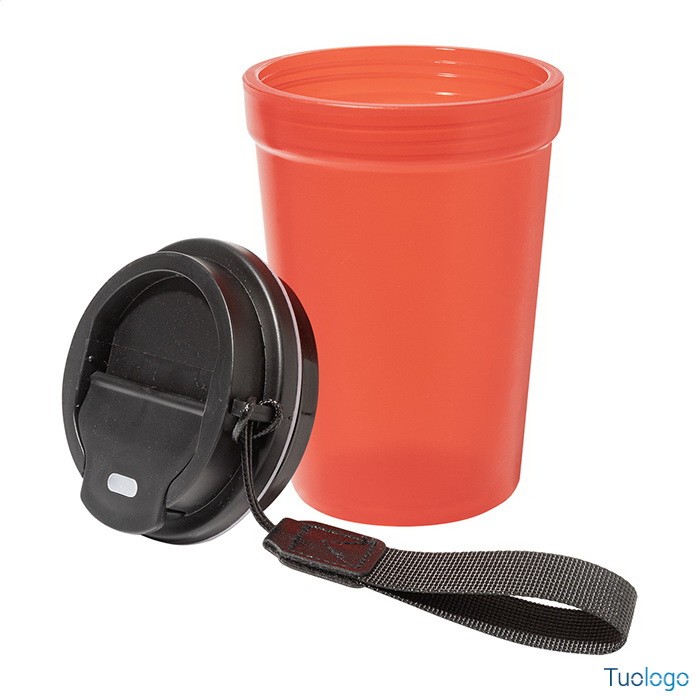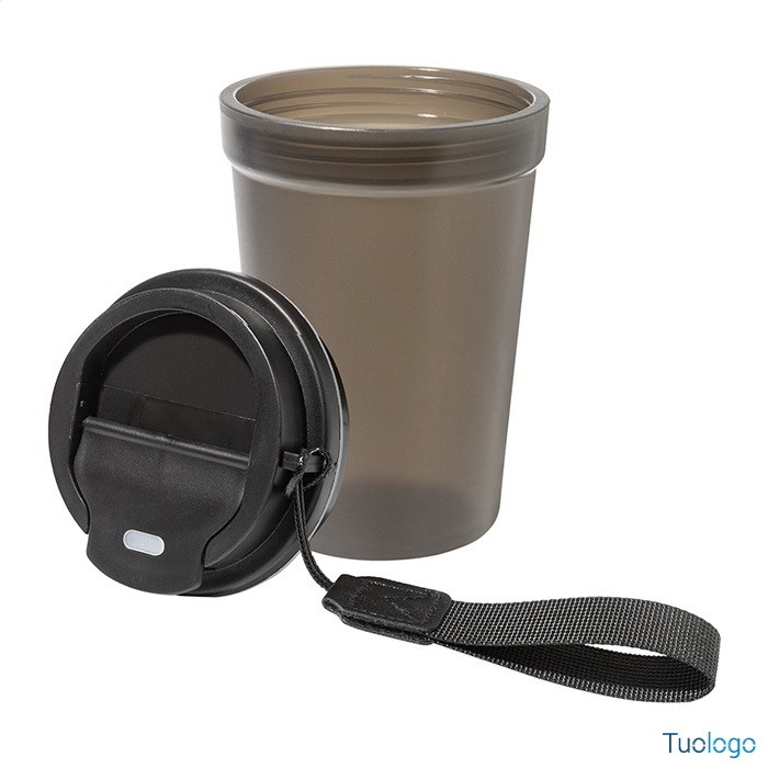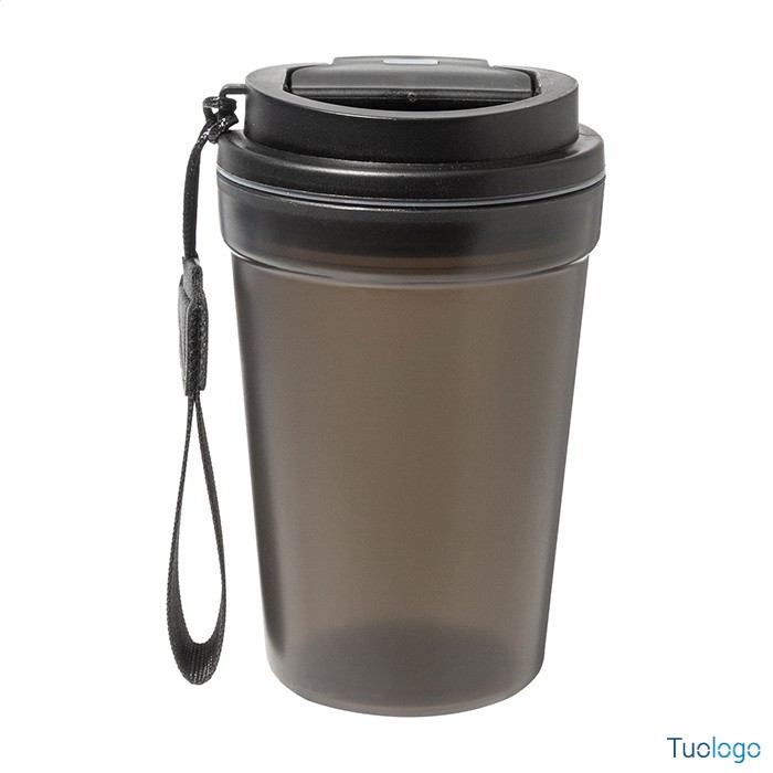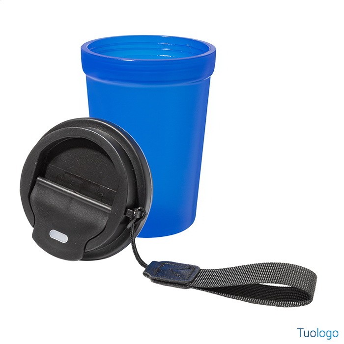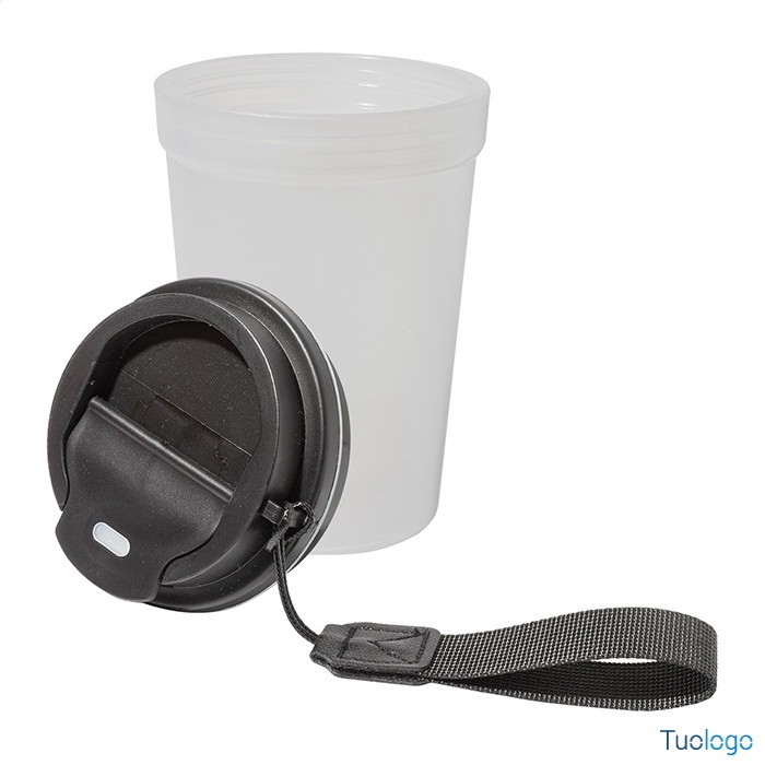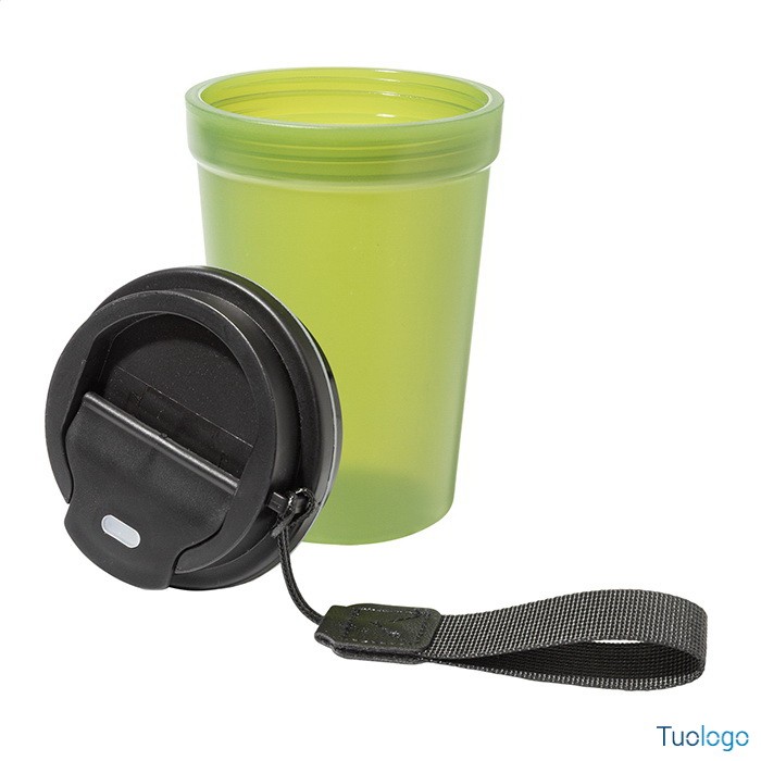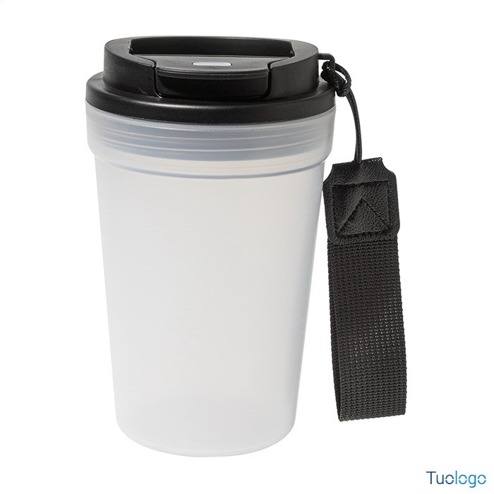 Tazza con coperchio 400ml Deià. Bicchiere da viaggio da 400ml in plastica PP a parete singola con finitura satinata, coperchio salvagoccia e fascetta in poliestere RPET. Dimensioni: diam cm 9x14.