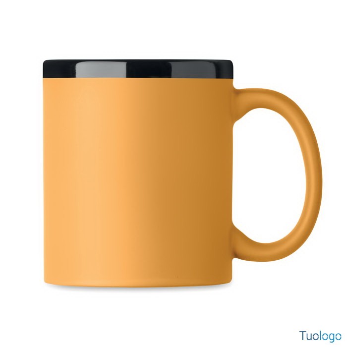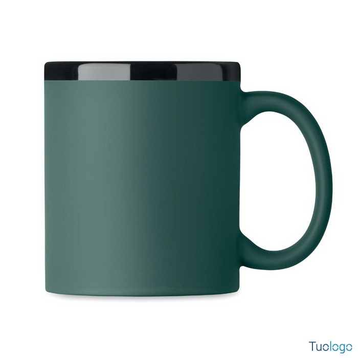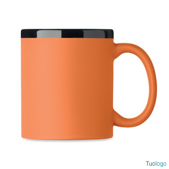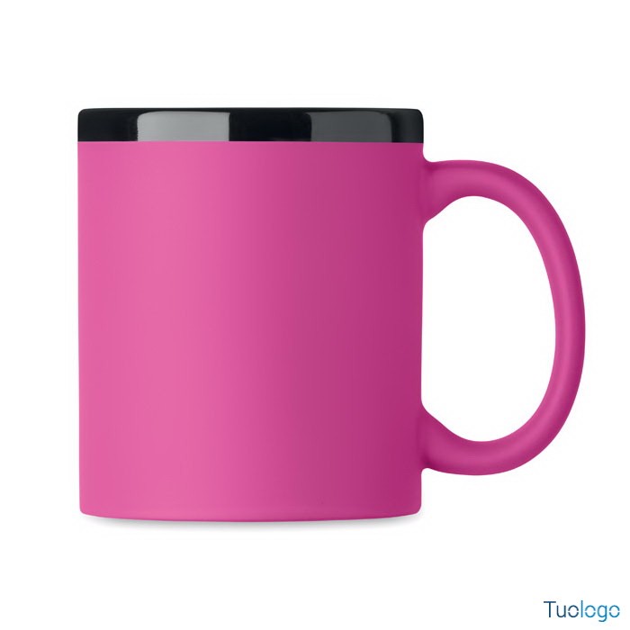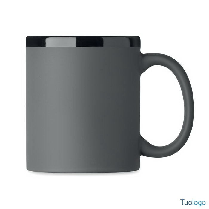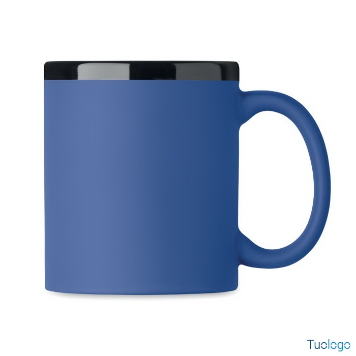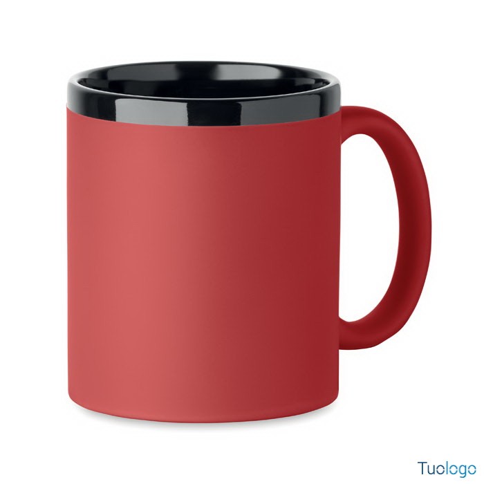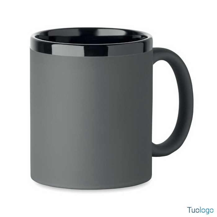 Tazza con rivestimento Tala. Tazza in ceramica con rivestimento soft touch e bordo interno nero. Per il laser. 300 ml. Confezionata singolarmente in scatola di cartone bianca. Dimensioni: 8,2x9,6cm