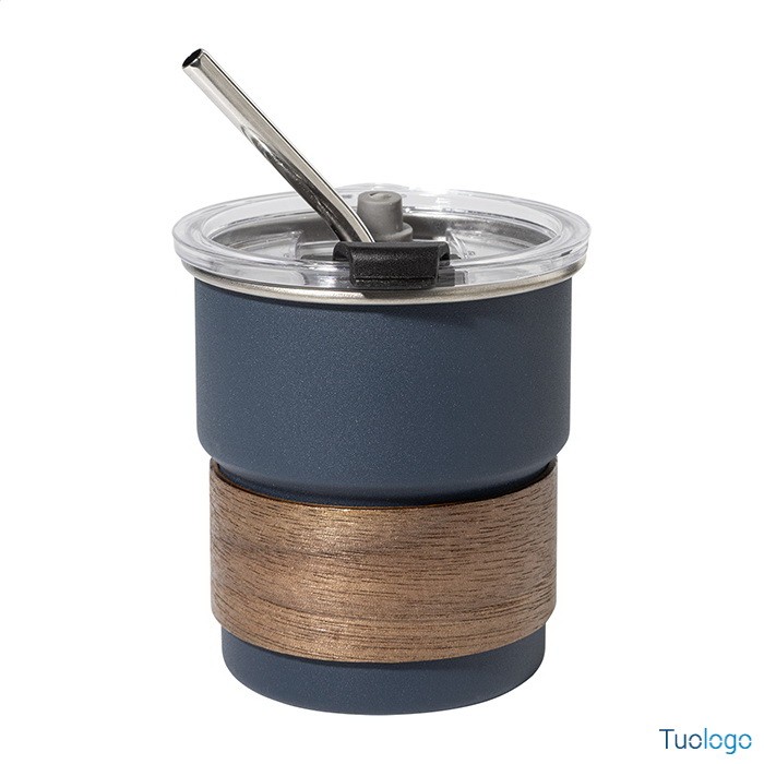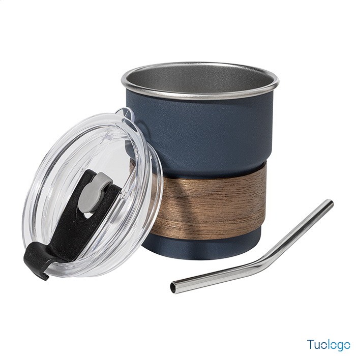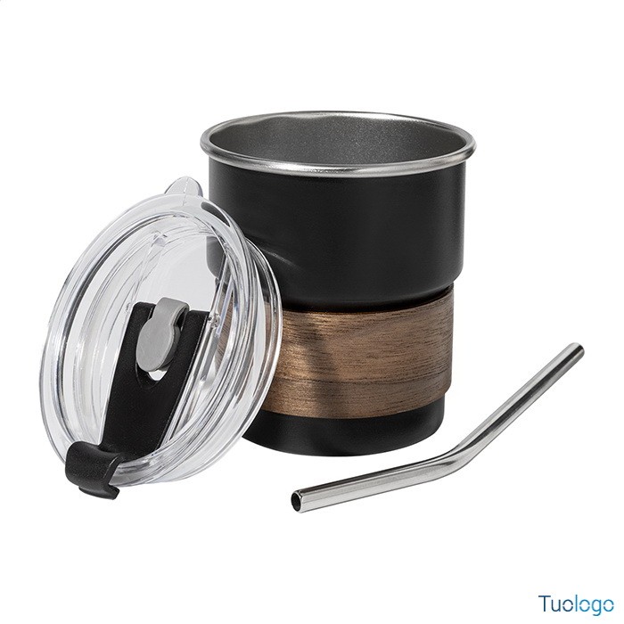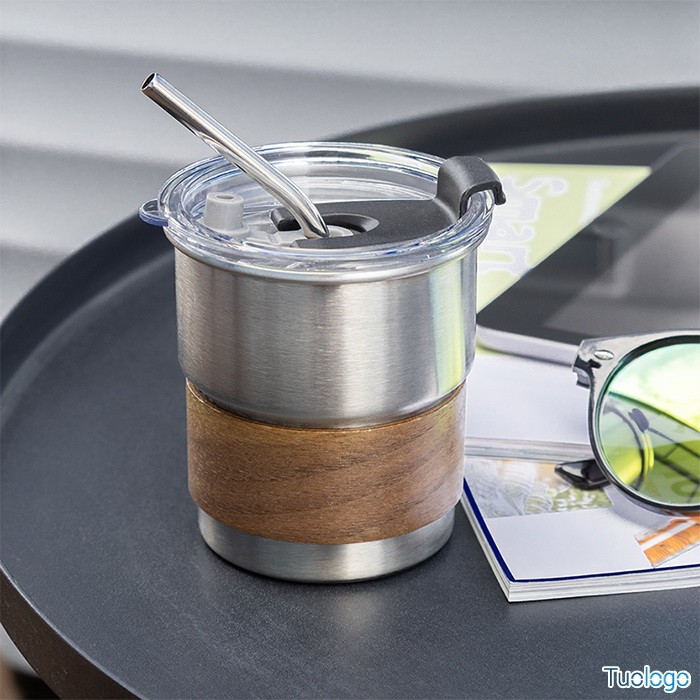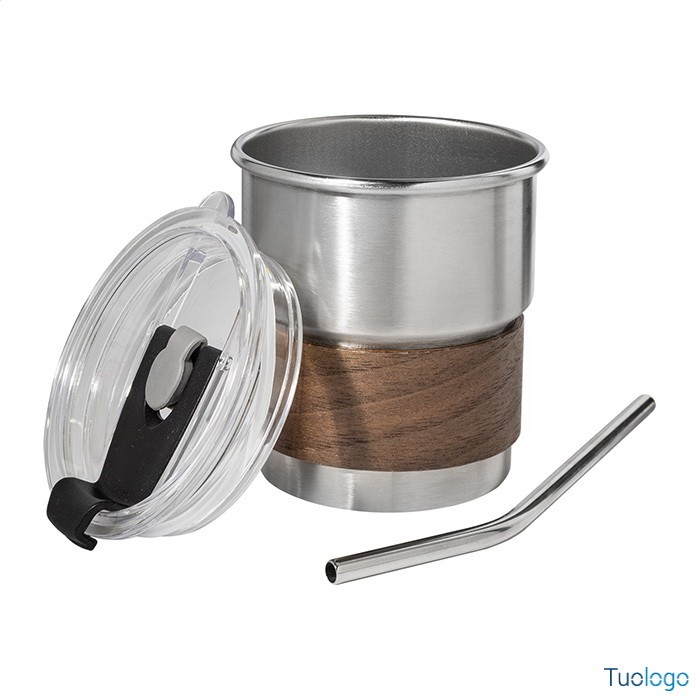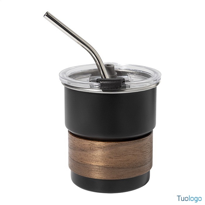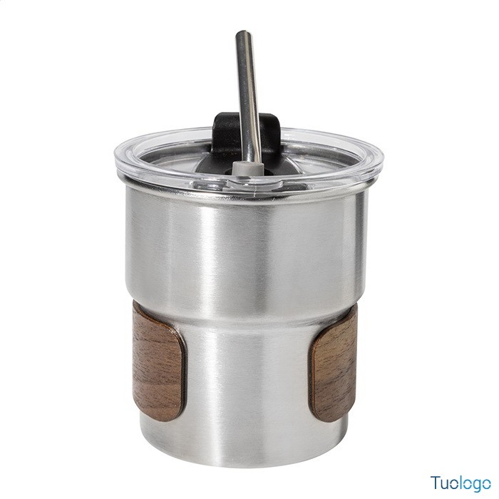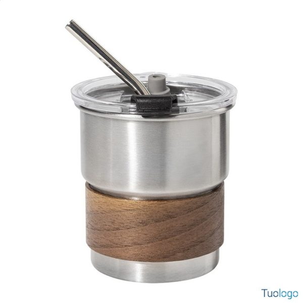 Tazza Feewa. Tazza in acciaio riciclato a parete singola da 260ml con presa in legno di noce, coperchio in plastica e cannuccia in acciaio riciclato. Dimensioni: cm 8x9.