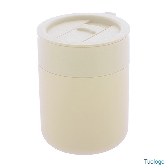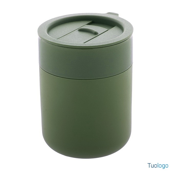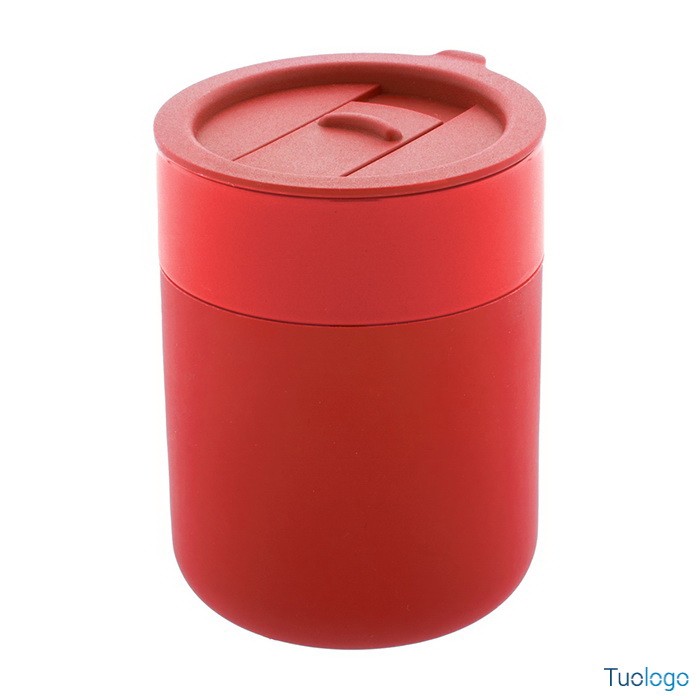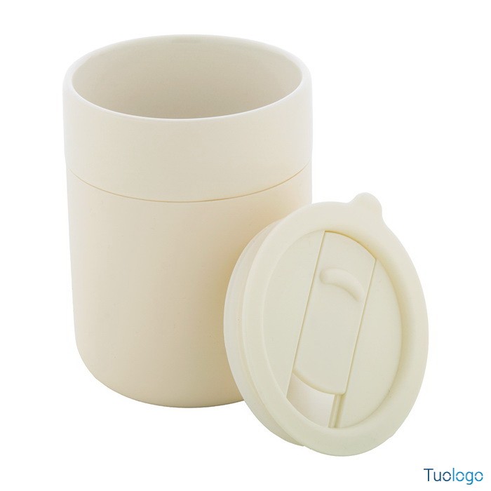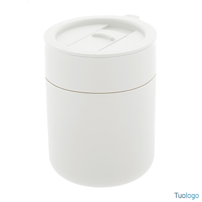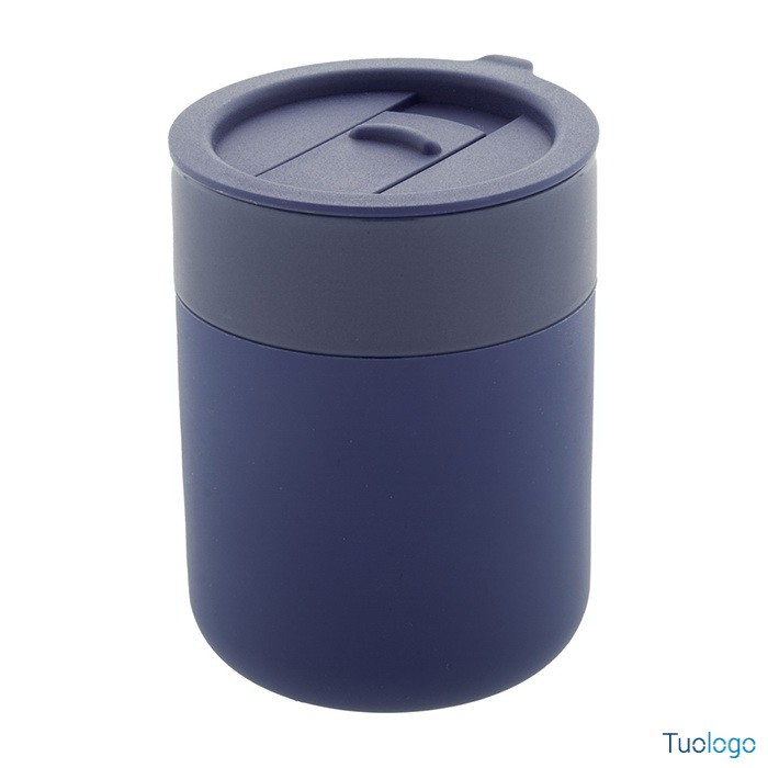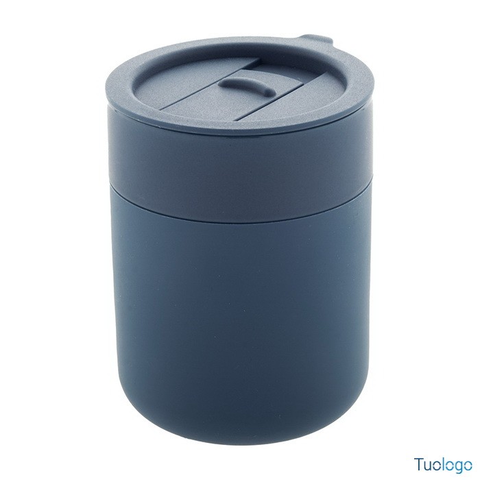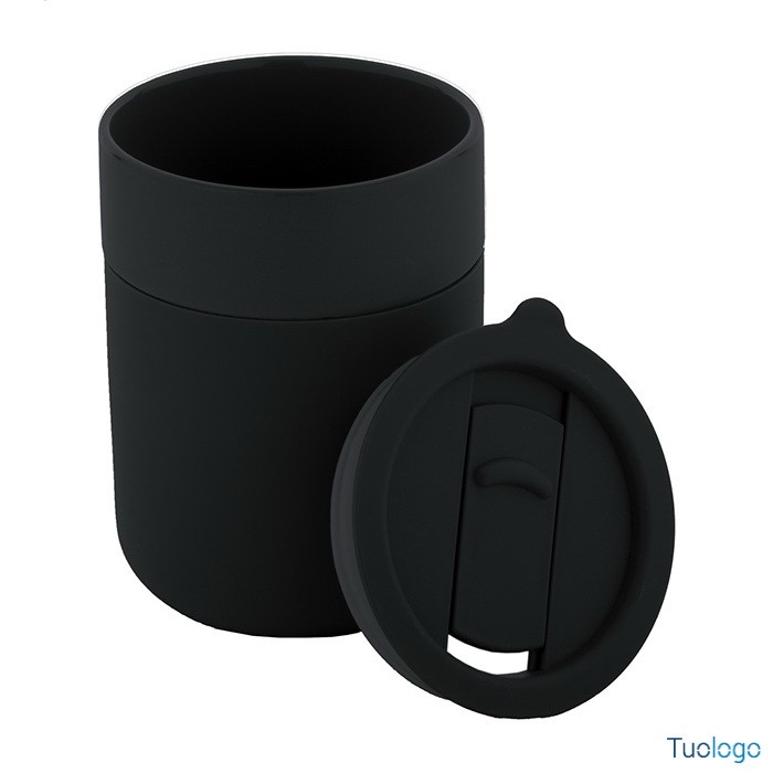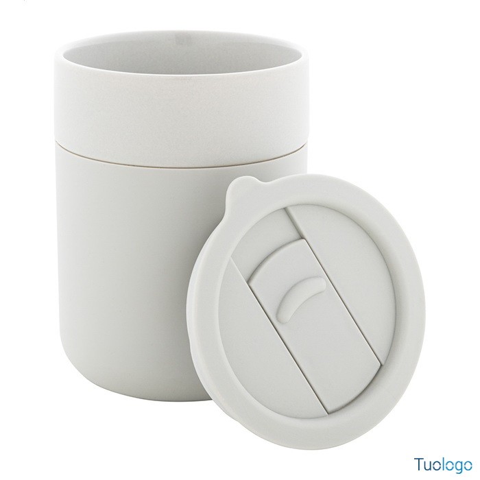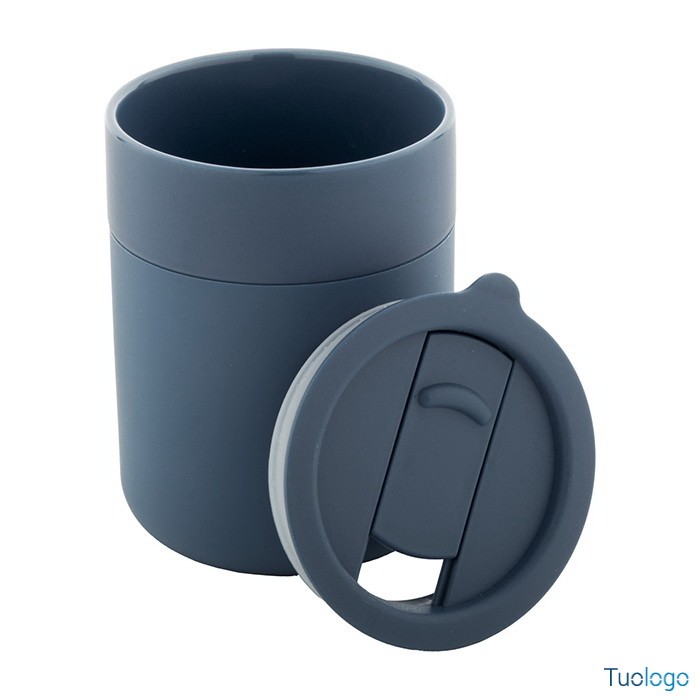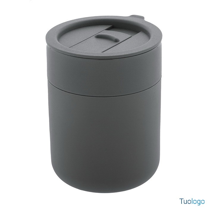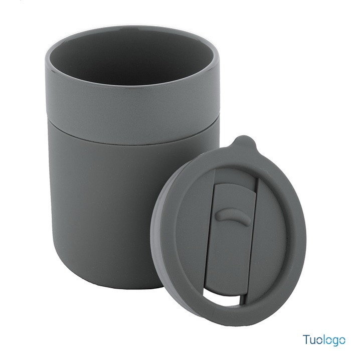 Tazza in ceramica Datia. Tazza asporto in ceramica rivestita con silicone e coperchio in plastica PP. Capienza 300 ml. Dimensioni: diam cm 8,0×10,8.