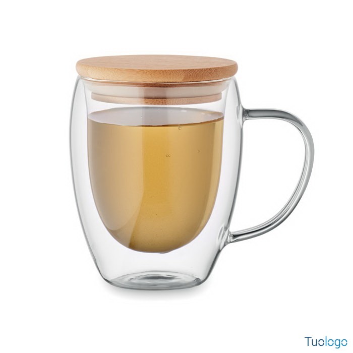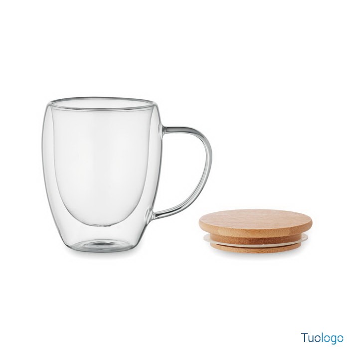 Tazza in vetro 300 ml Cella. Tazza in vetro borosilicato a doppio strato con manico e coperchio in bamboo. Capacità: 300 ml. Dimensioni: diam cm 8,5x11,5.