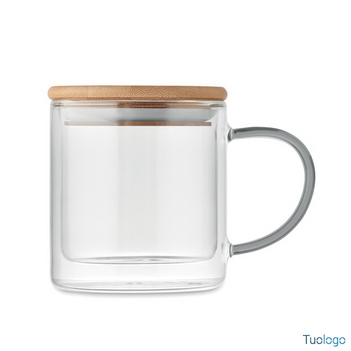 Tazza in vetro 400 ml Zevio. Tazza in vetro borosilicato a doppio strato con coperchio in bambù e manici colorati. Capacità: 400 ml. Dimensioni: diam cm 10x13.