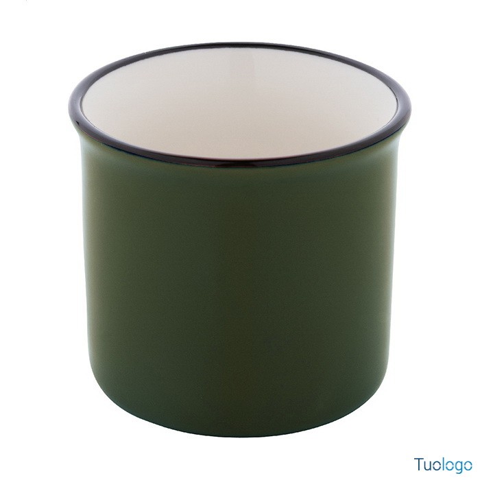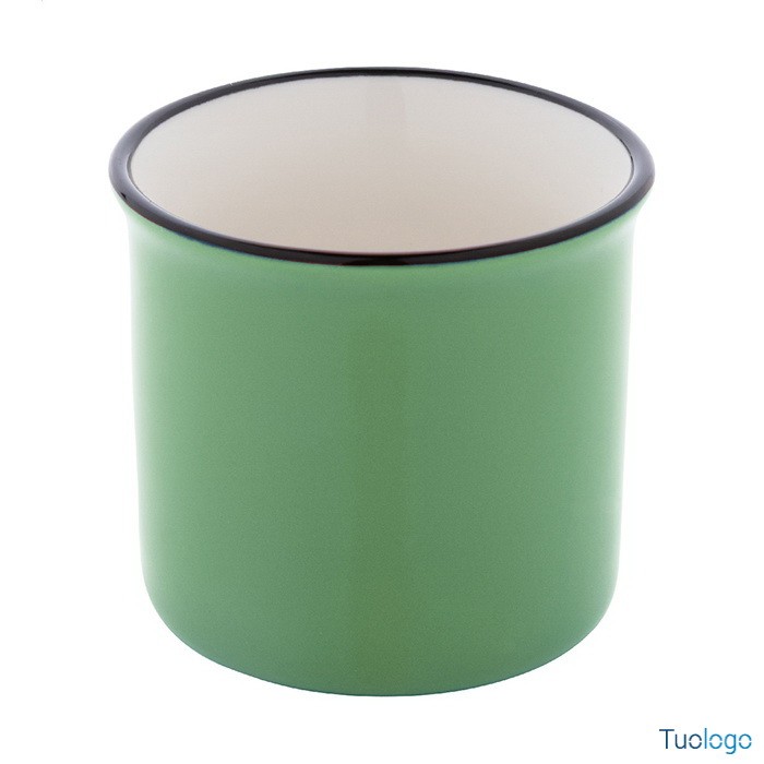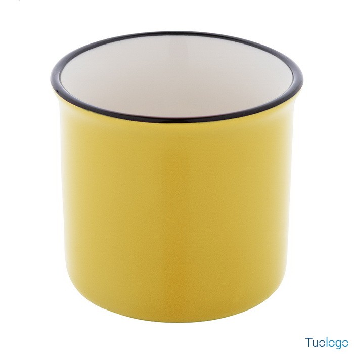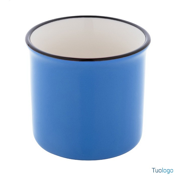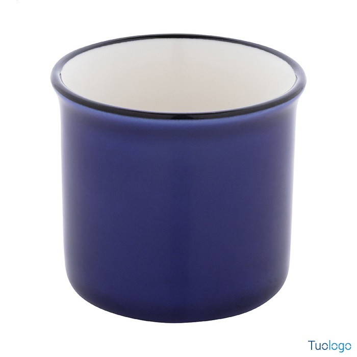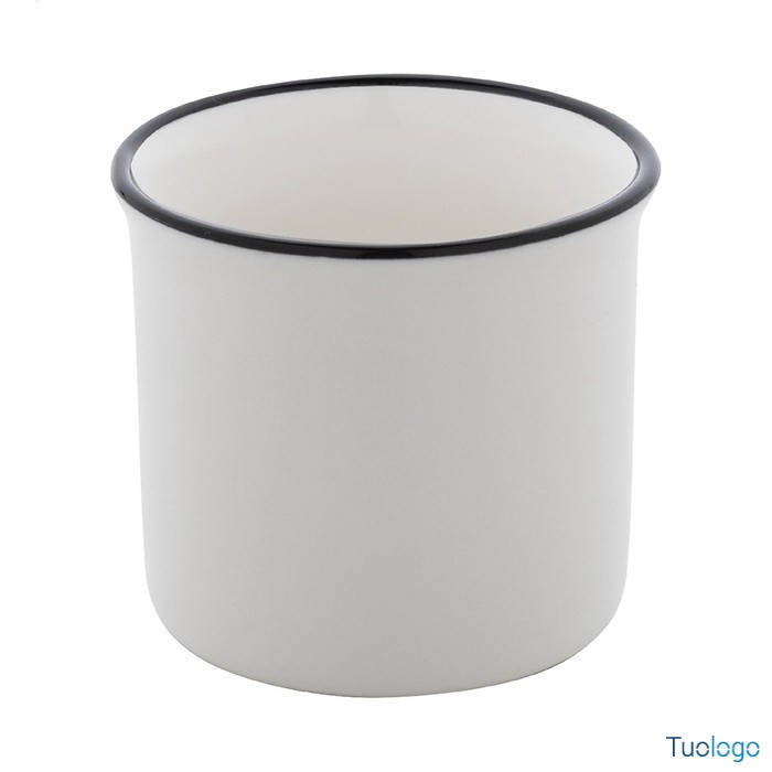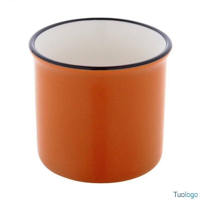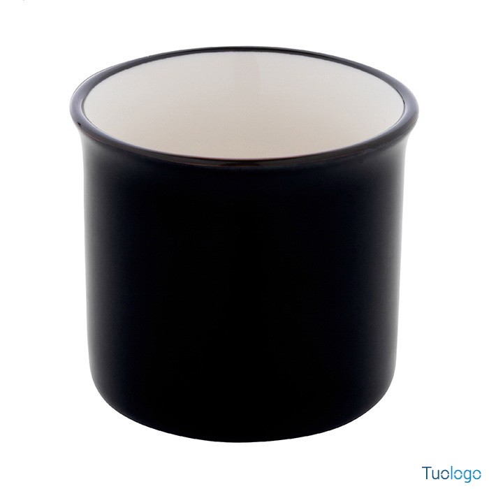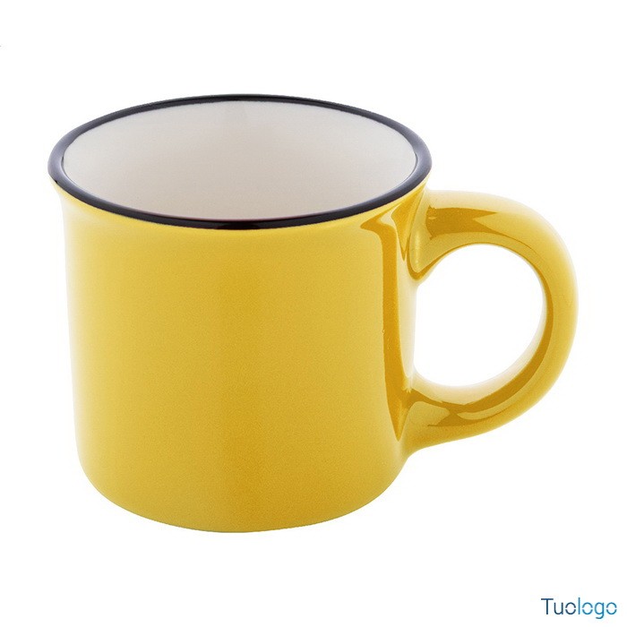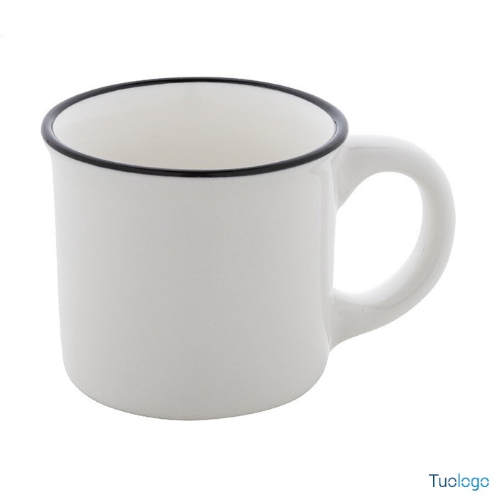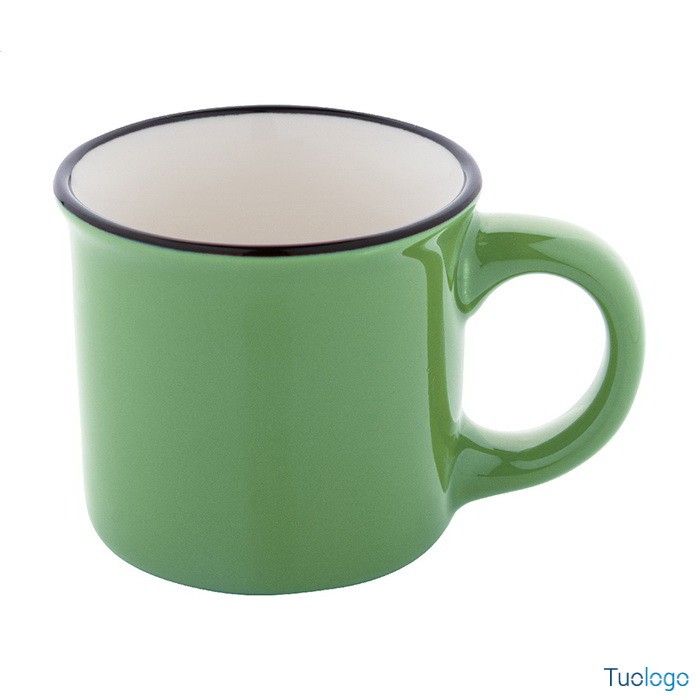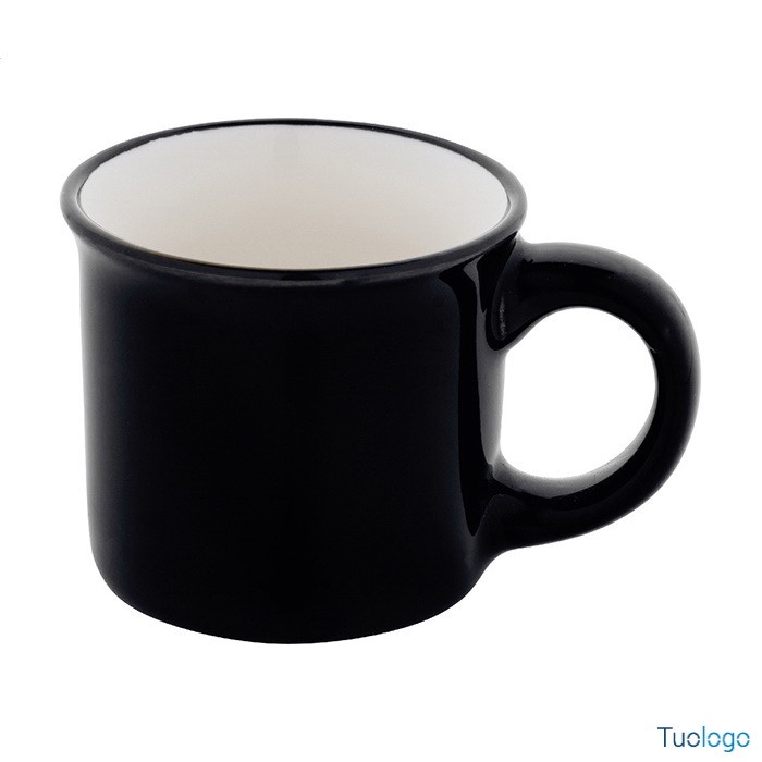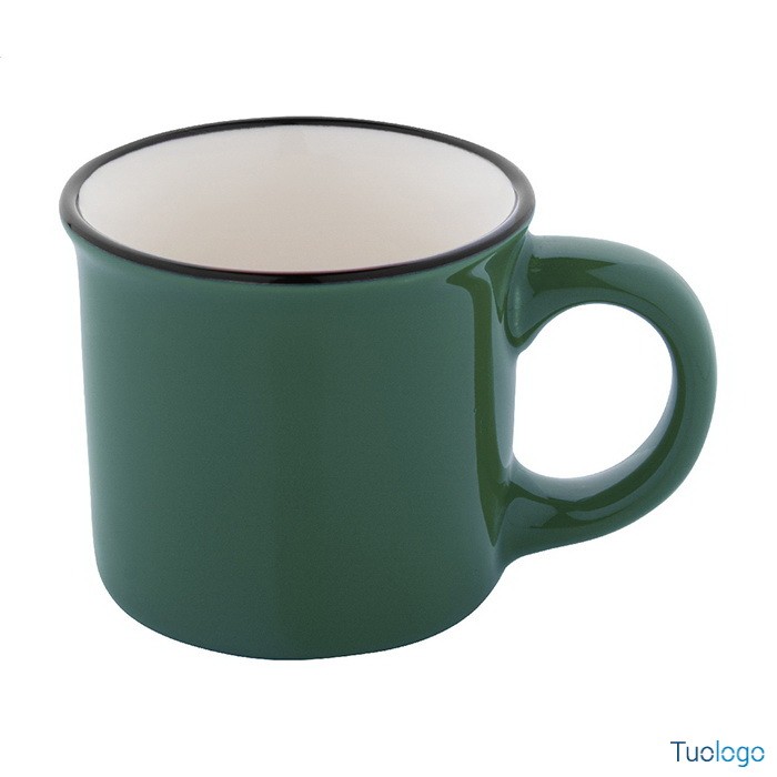 Tazza Khomu. Mini tazza in ceramica 90 ml. in stile vintage con bordo nero, interno bianco ed esterno colorato. Fornita in scatola di cartoncino kraft. Dimensioni: cm 6,3x5,2.