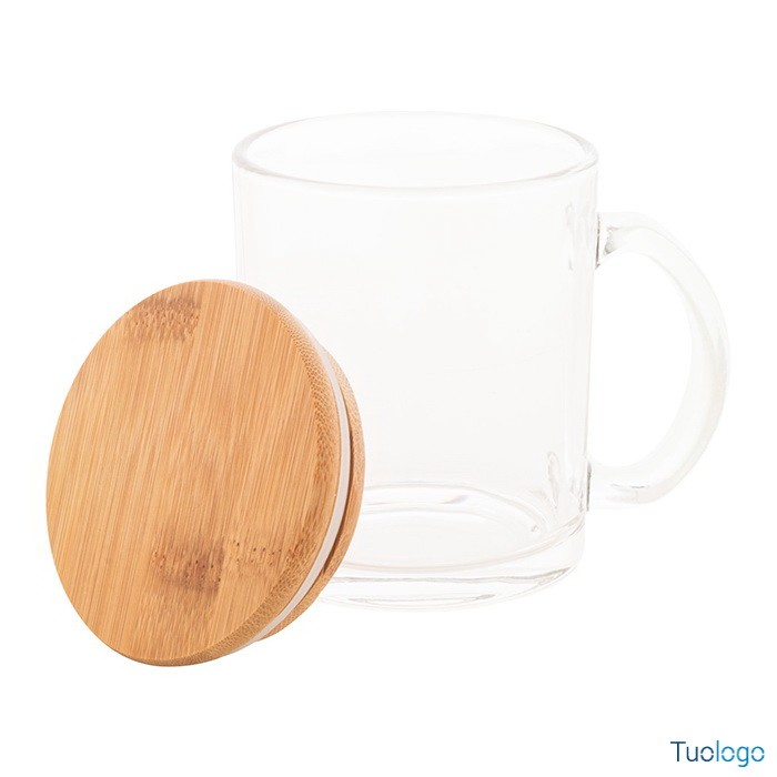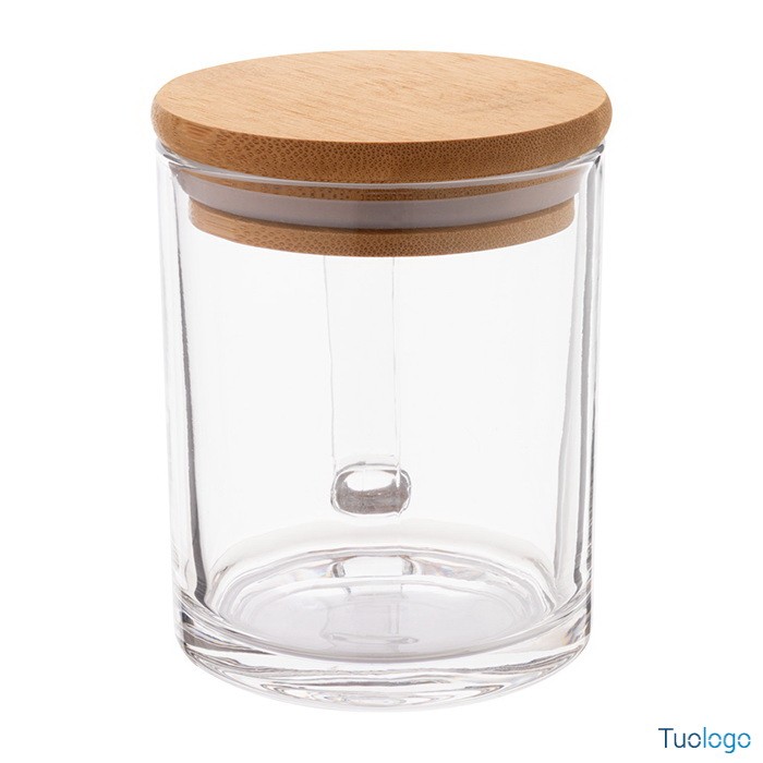 Tazza Strabos. Tazza da 300ml. in vetro riciclato con coperchio in bambù. Confezione in scatola di cartoncino kraft. Dimensioni: mm 80x103.