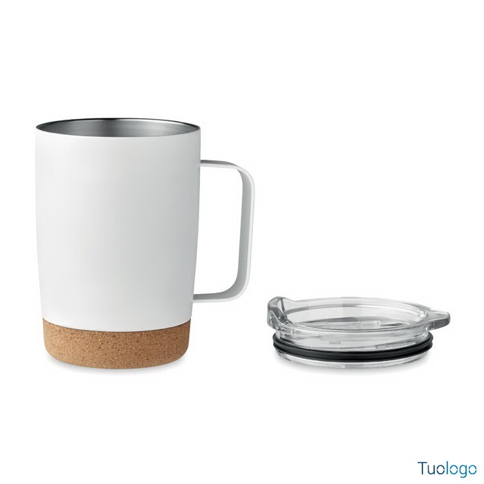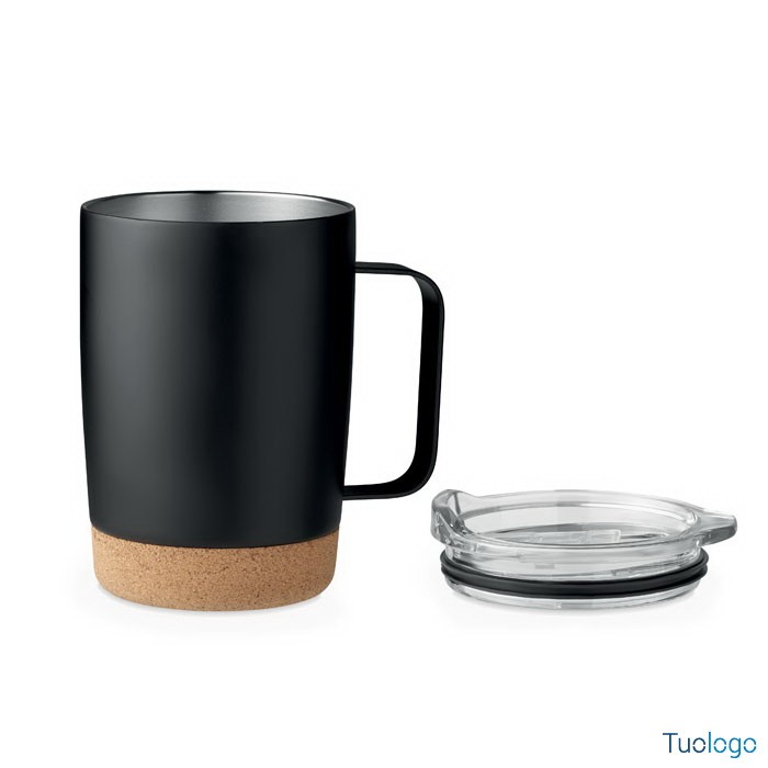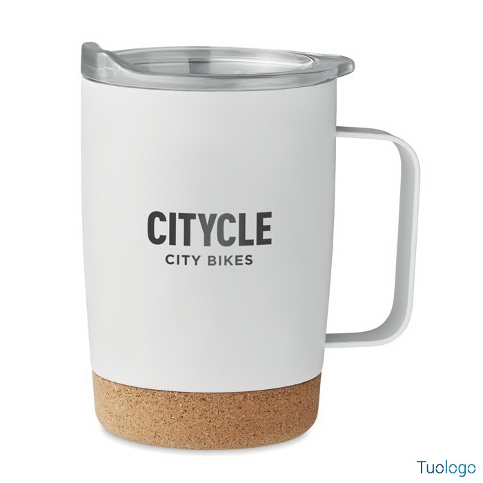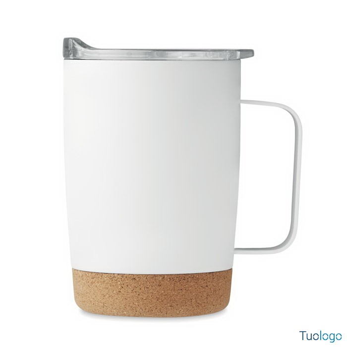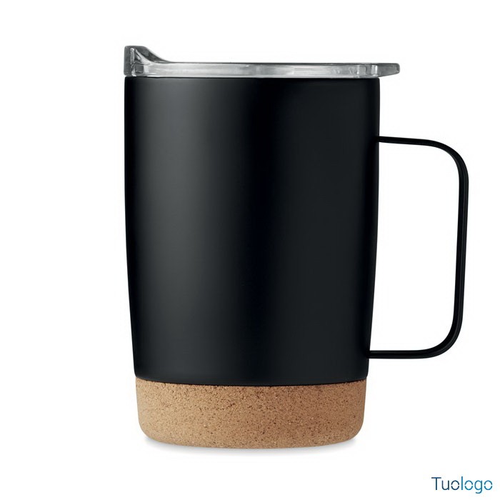 Tazza termica 300 ml Clusone. Doppio strato in acciaio inox con base in sughero e coperchio con foro scorrevole per bere. Dimensioni: cm 11,5x12,5.