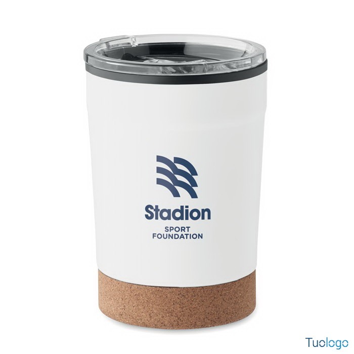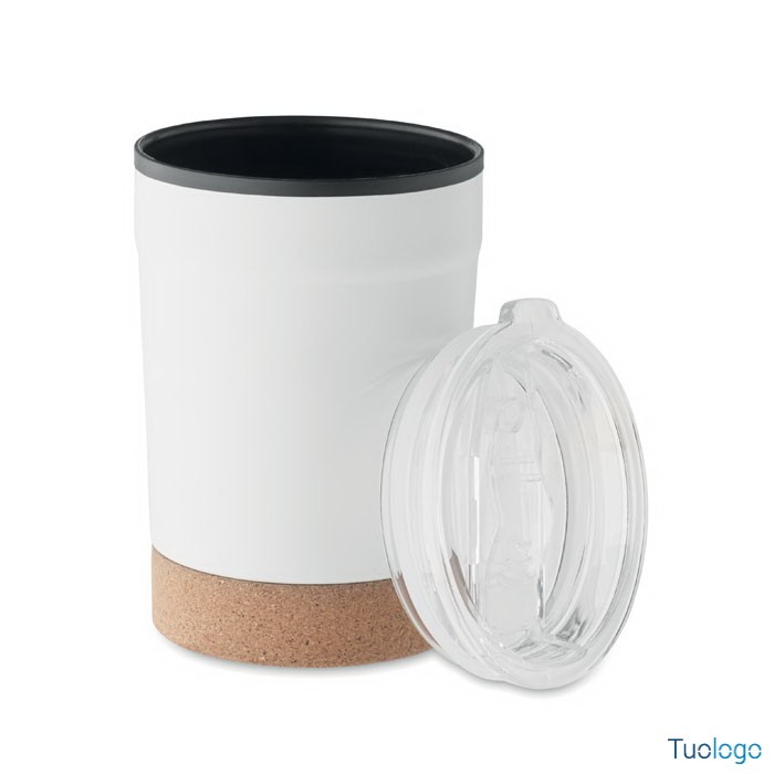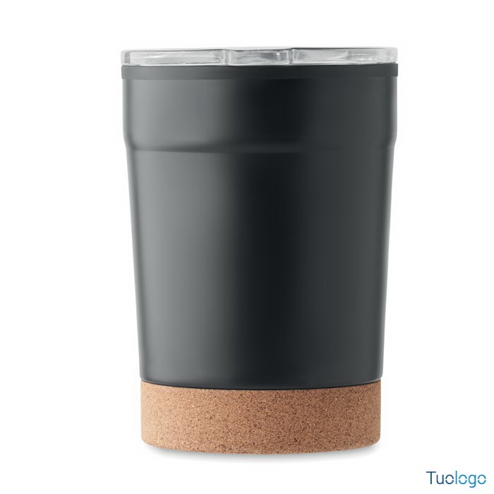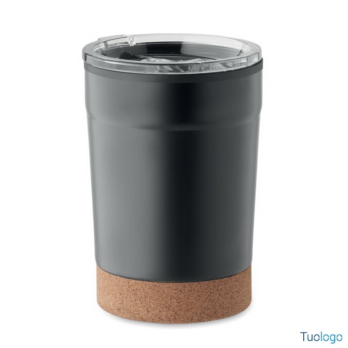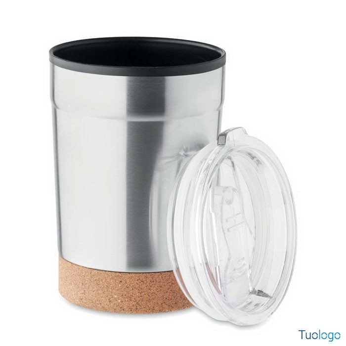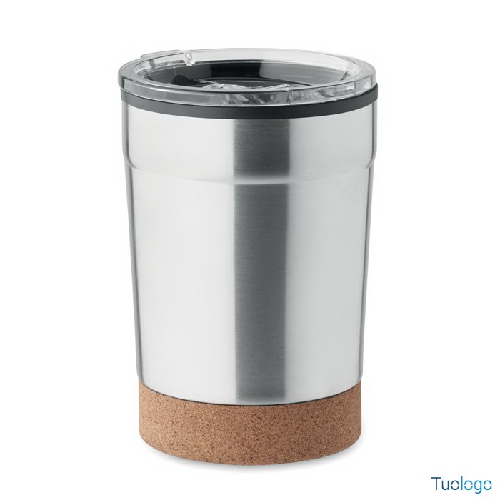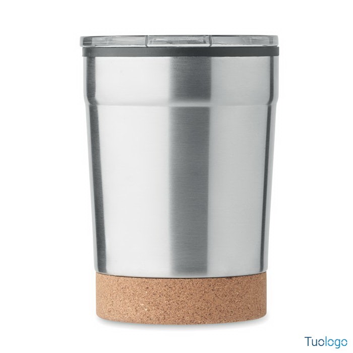 Tazza termica 300ml in acciaio Moglia. Bicchiere doppio strato in acciaio inox e interno in PP con base in sughero e foro di imboccatura scorrevole. Senza perdite. Capacità: 300 ml. Dimensioni: diam cm 8,5x12.
