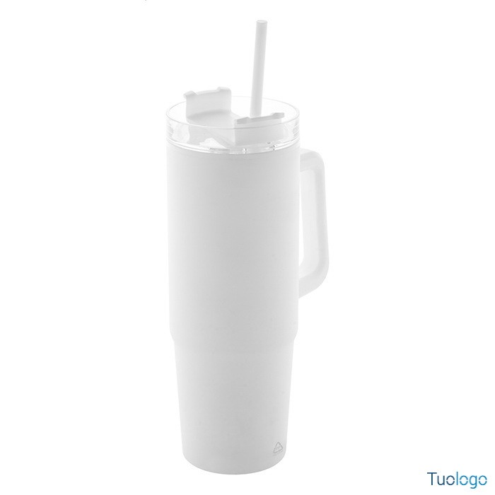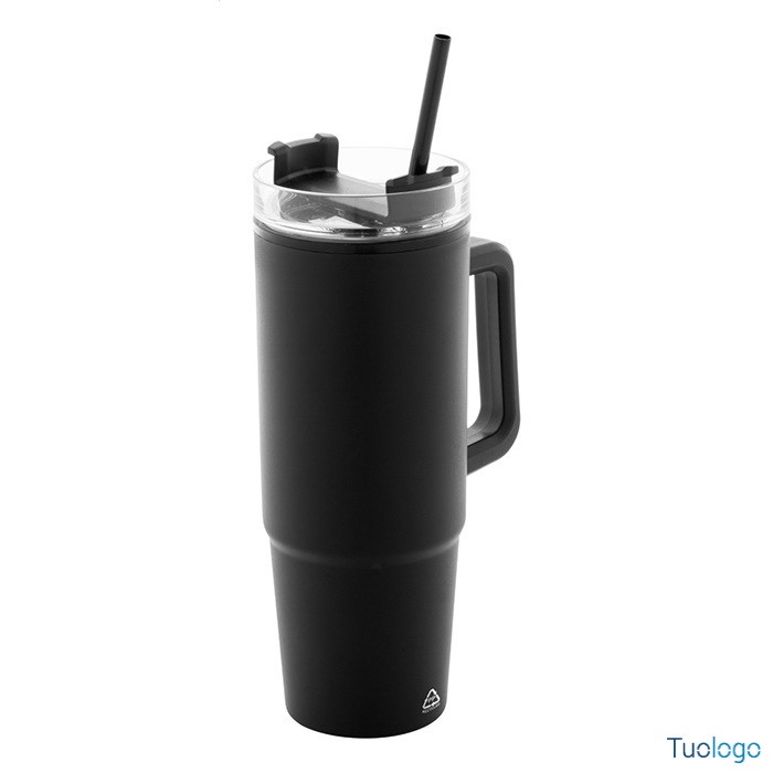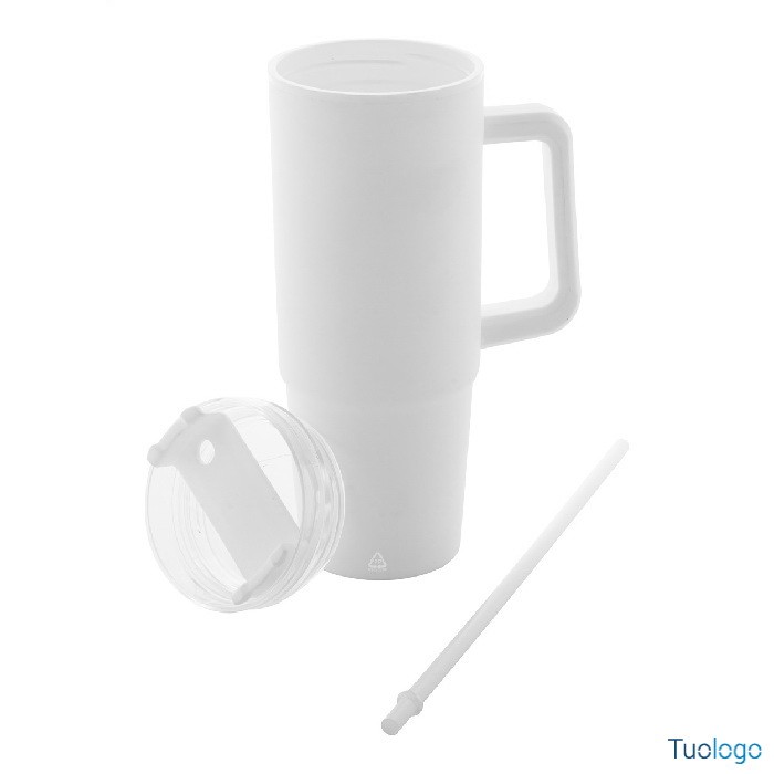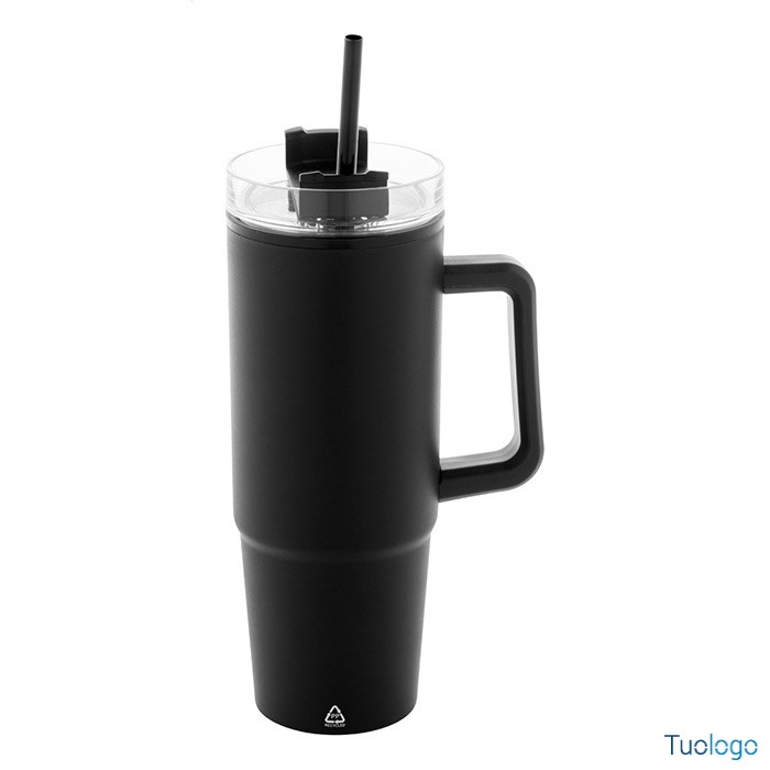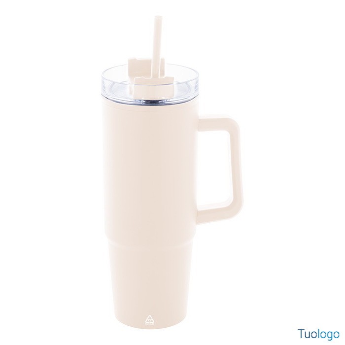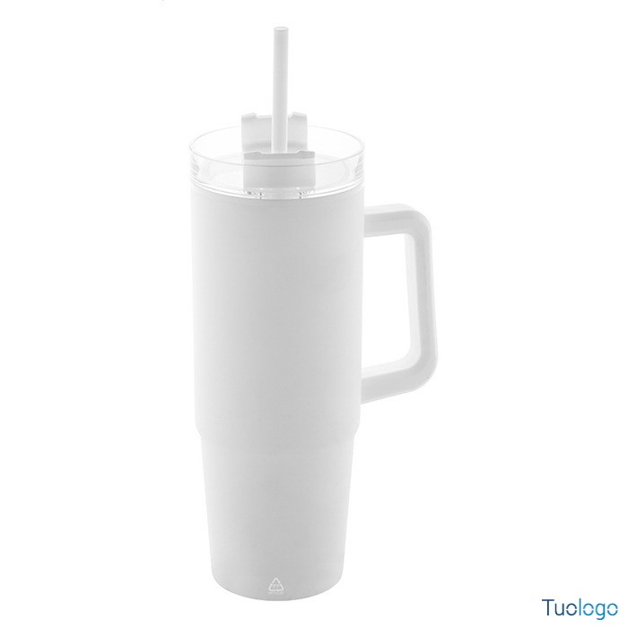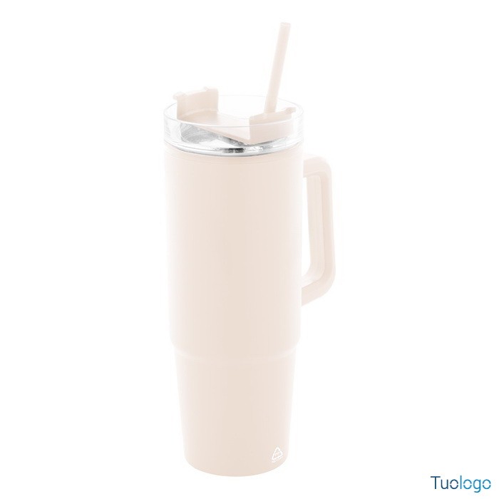 Tazza termica Begun. Tazza termica in plastica PP riciclata a doppia parete con struttura termica sottovuoto. Coperchio, erogatore e cannuccia. Capacità 900 ml. Dimensioni: diam cm 9,0×24,0.