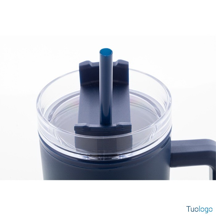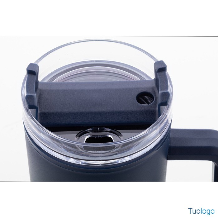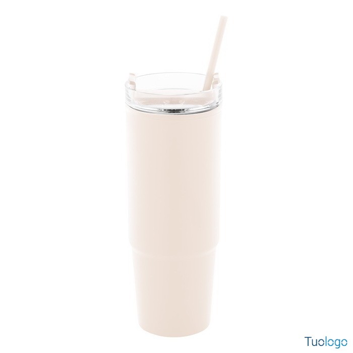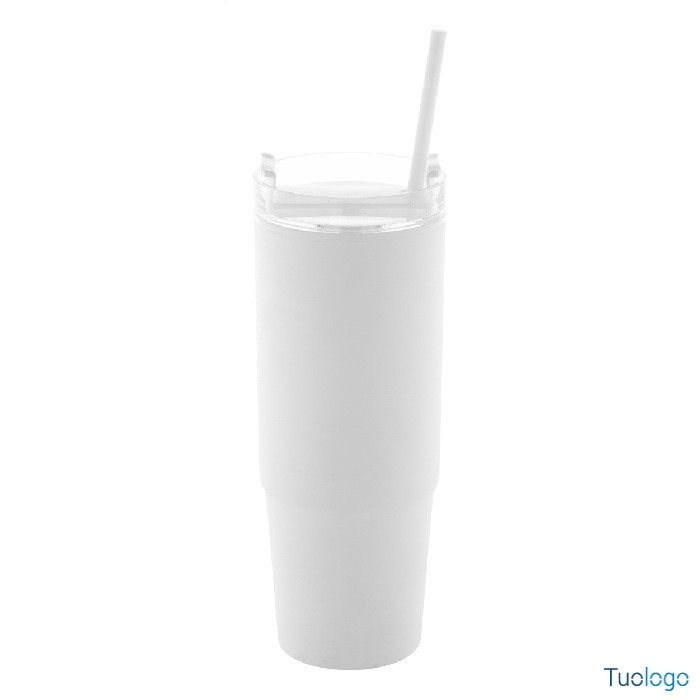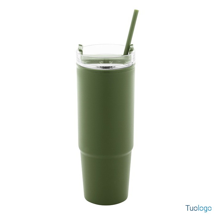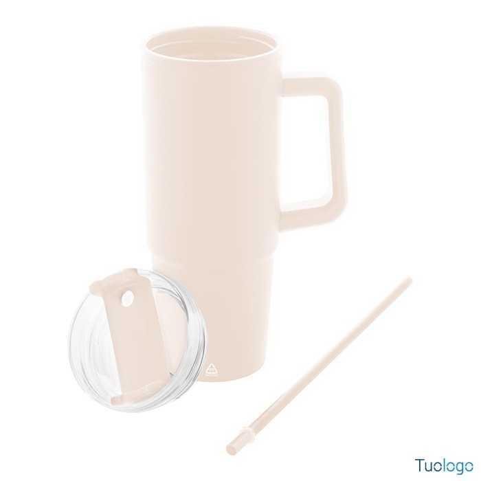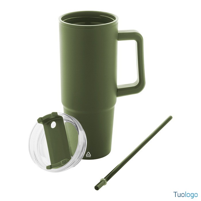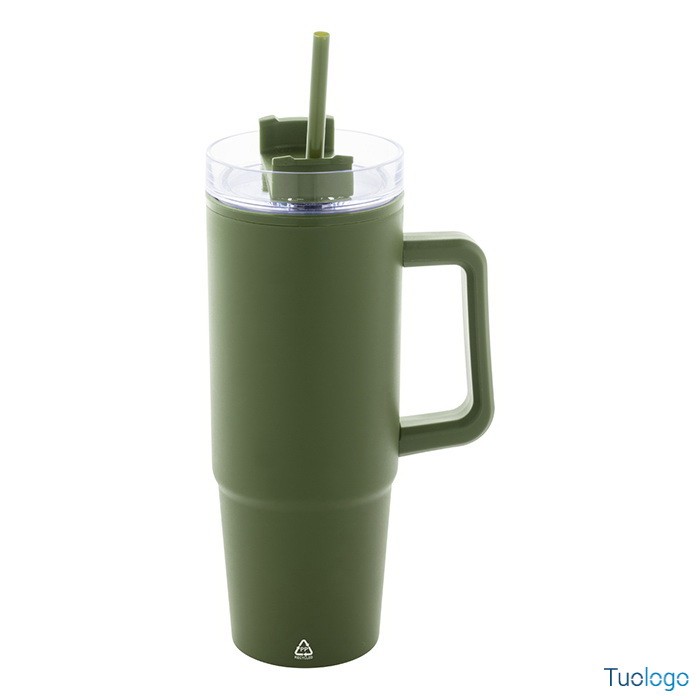 Tazza termica Begun. Tazza termica in plastica PP riciclata a doppia parete con struttura termica sottovuoto. Coperchio, erogatore e cannuccia. Capacità 900 ml. Dimensioni: diam cm 9,0×24,0.