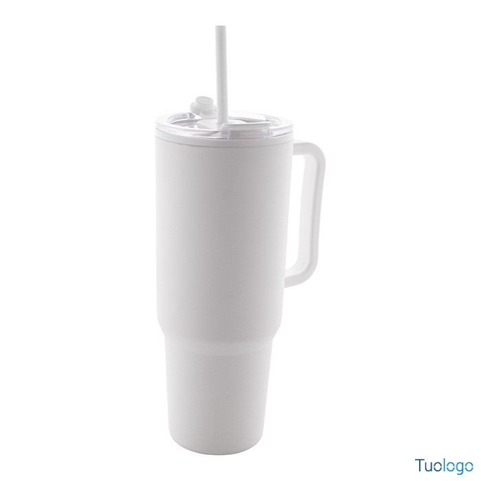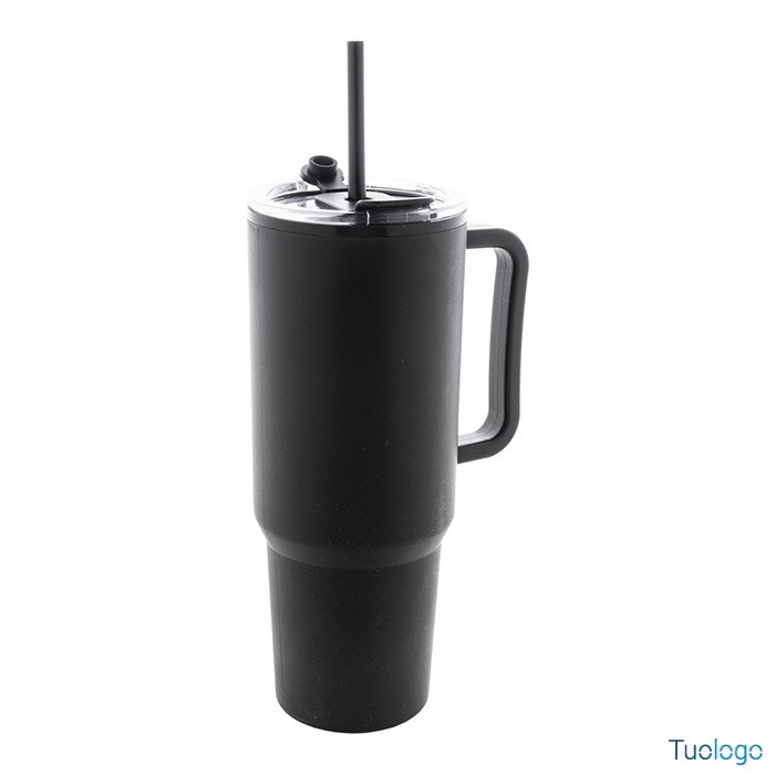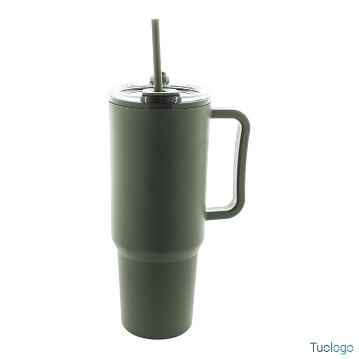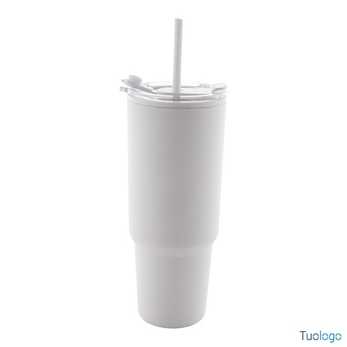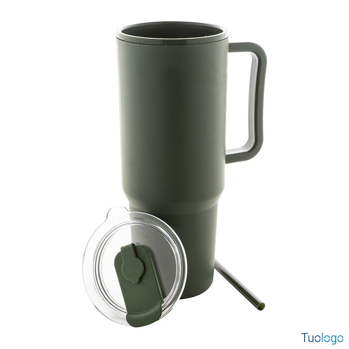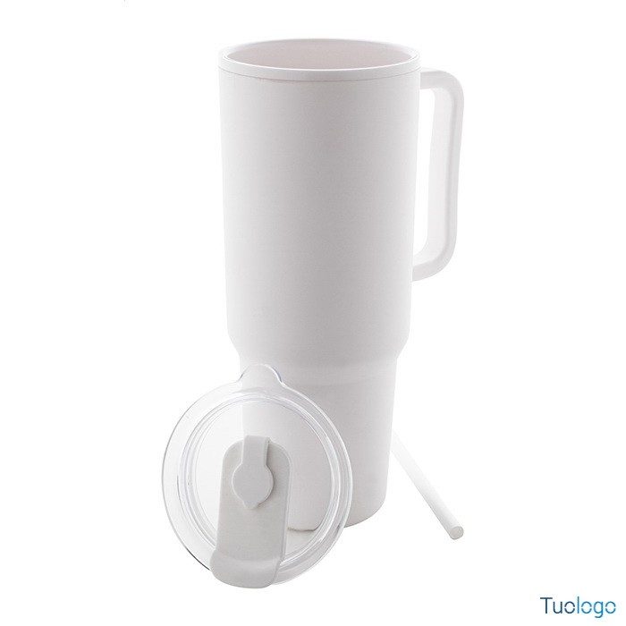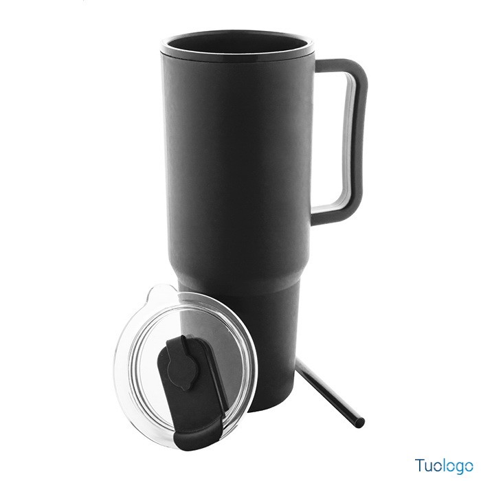Tazza termica Deori. Tazza termica isotermica in plastica PP a doppia parete. Coperchio in PS e cannuccia in PP. Capacità 1100 ml. Dimensioni: diam cm 10×25.