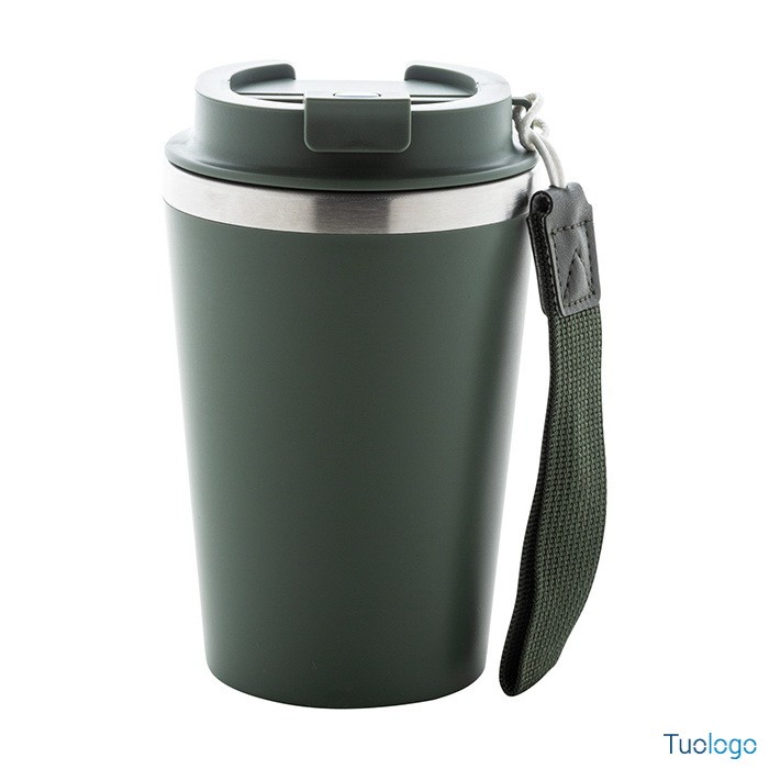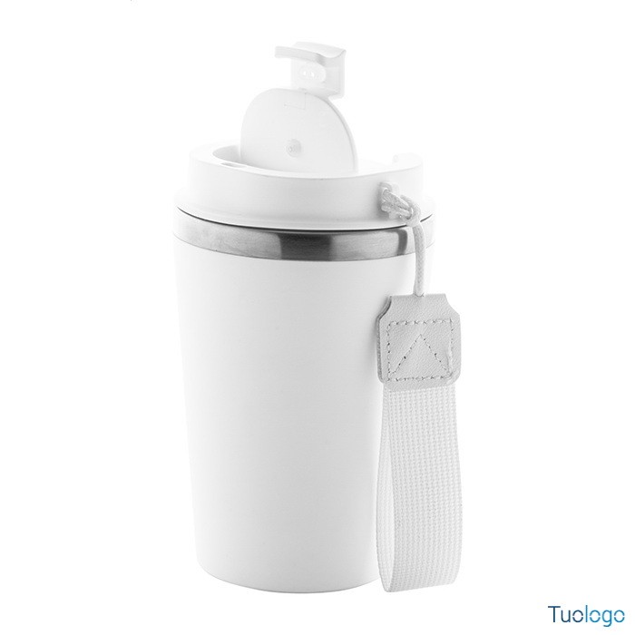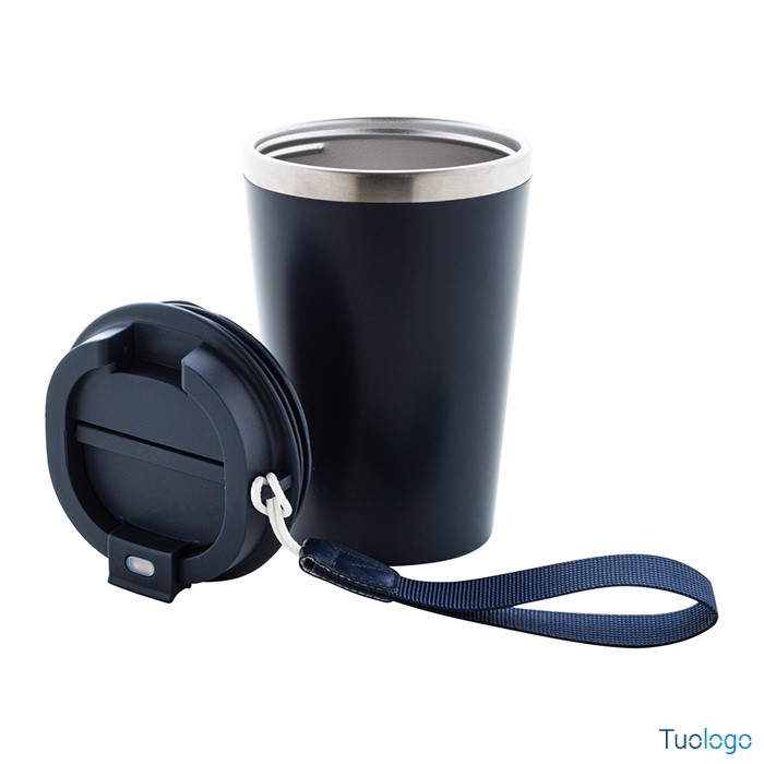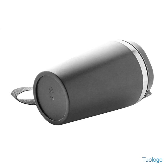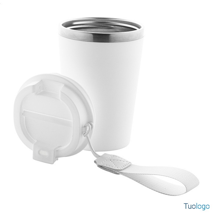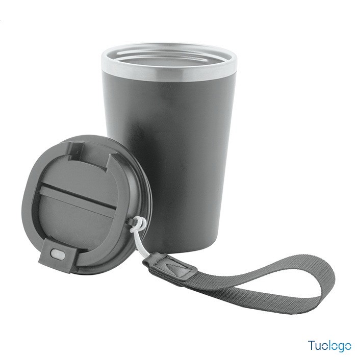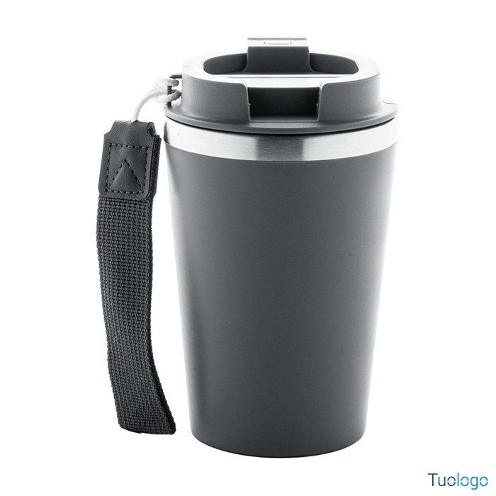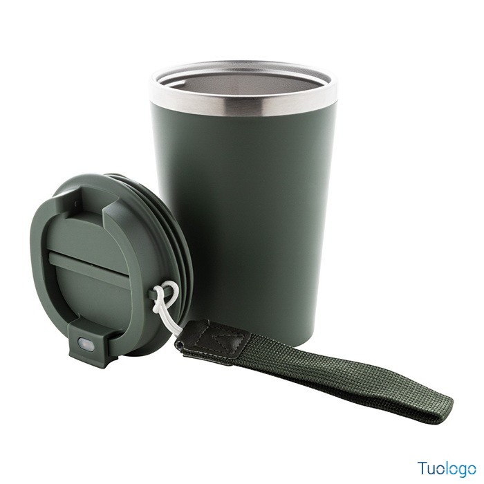Tazza termica Guna. Bicchiere termico a doppia parete in acciaio riciclato. Coperchio erogatore in PP. Completo di laccetto in RPET. Capienza: 350 ml. Dimensioni: diam cm 8,5×14,0.