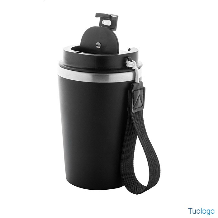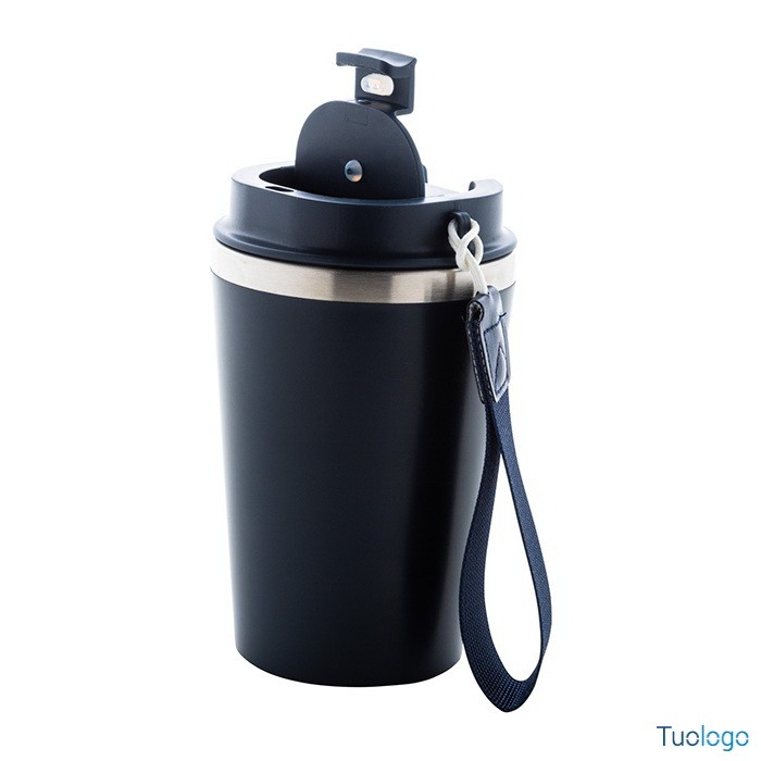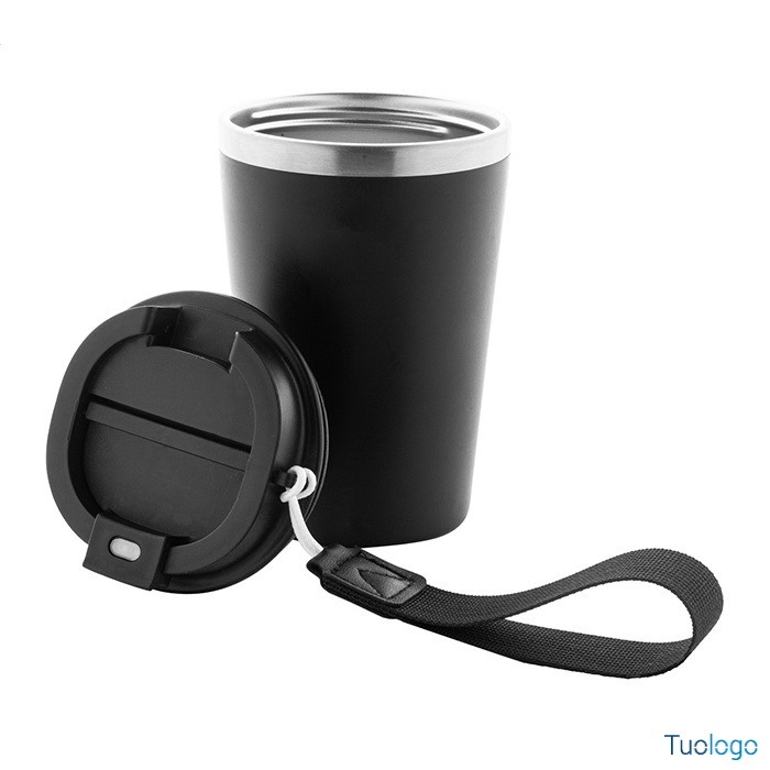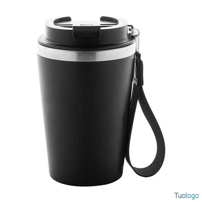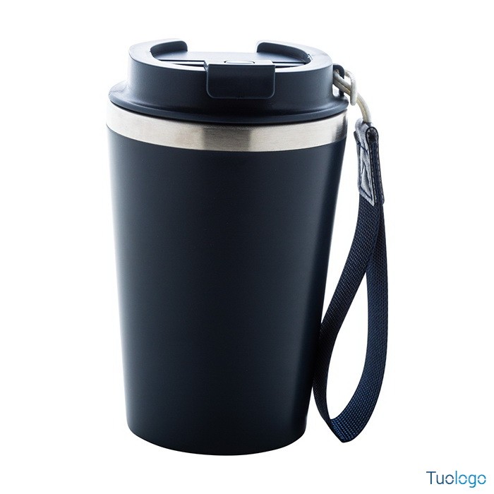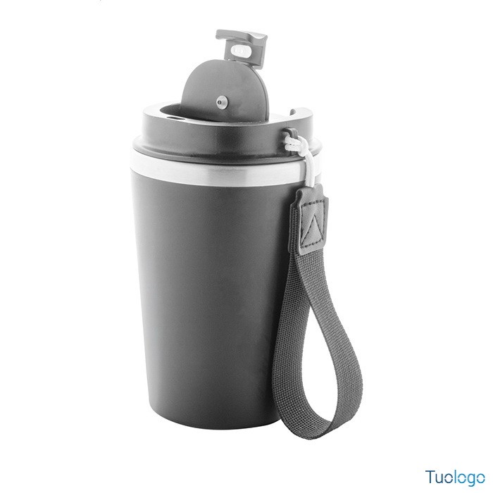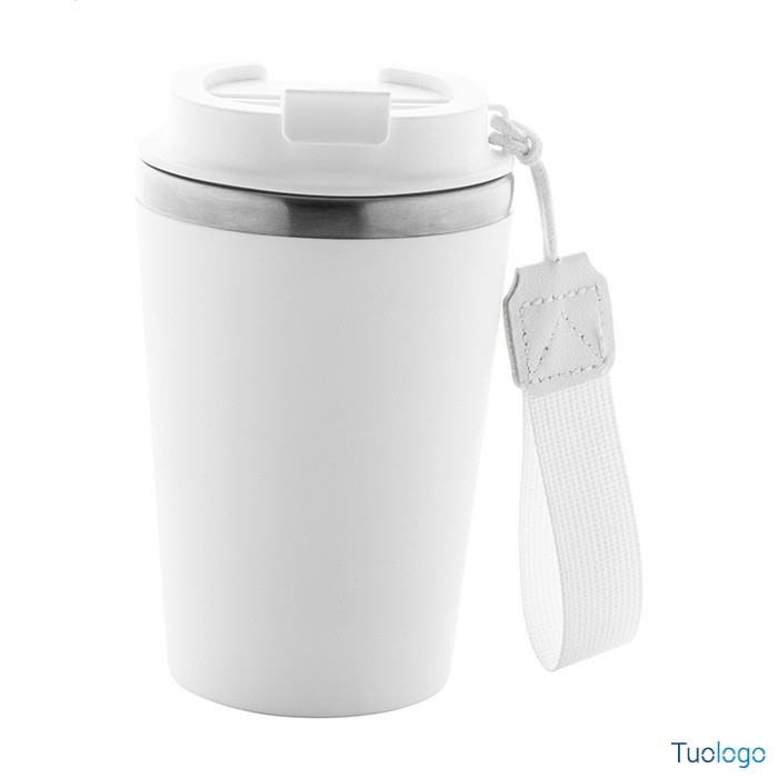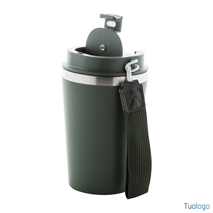 Tazza termica Guna. Bicchiere termico a doppia parete in acciaio riciclato. Coperchio erogatore in PP. Completo di laccetto in RPET. Capienza: 350 ml. Dimensioni: diam cm 8,5×14,0.