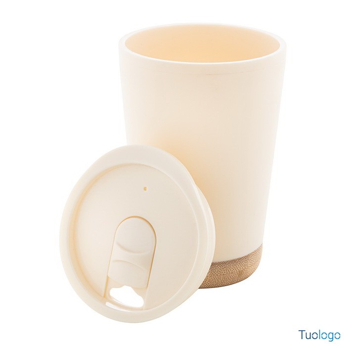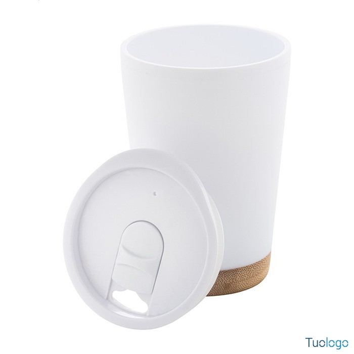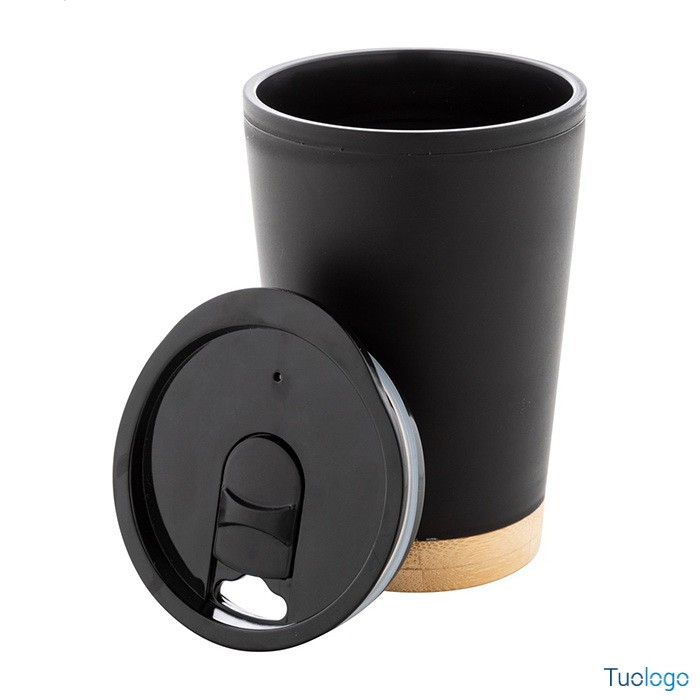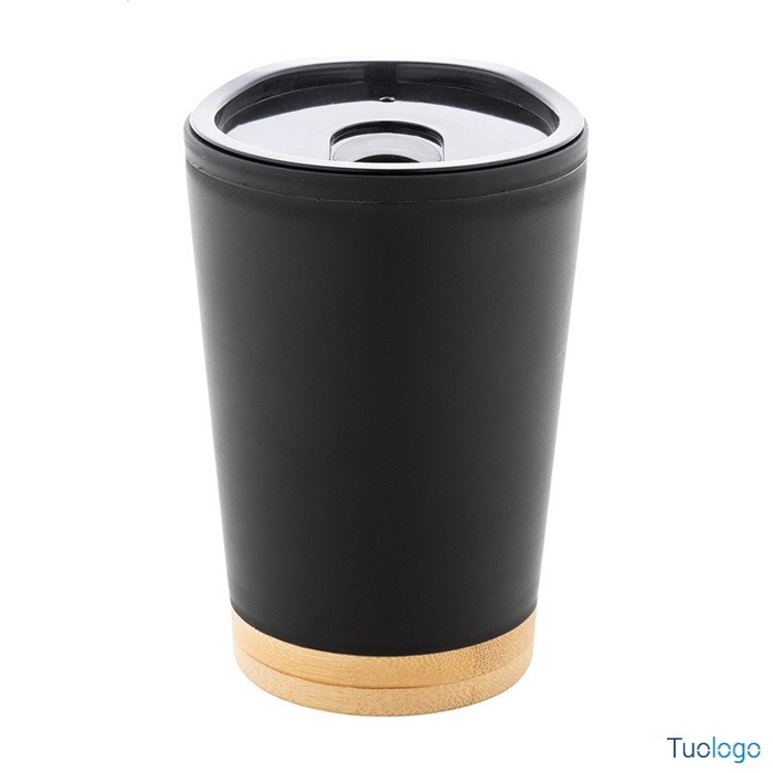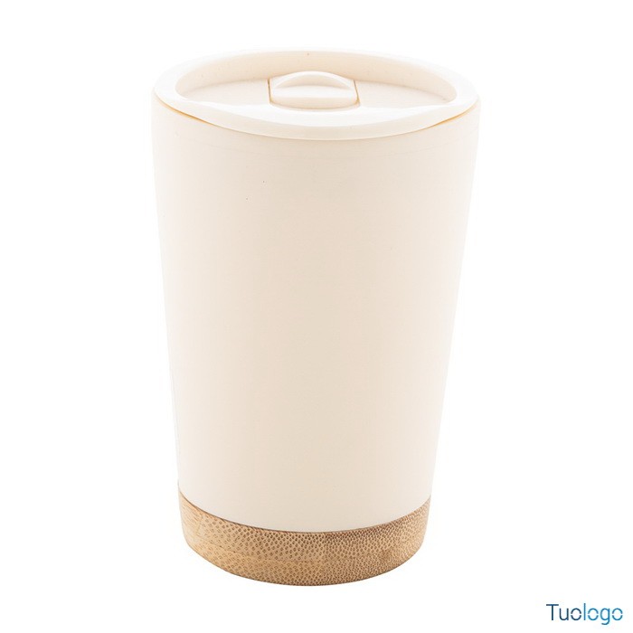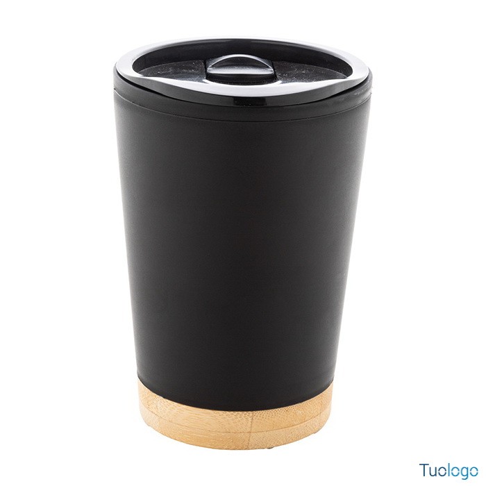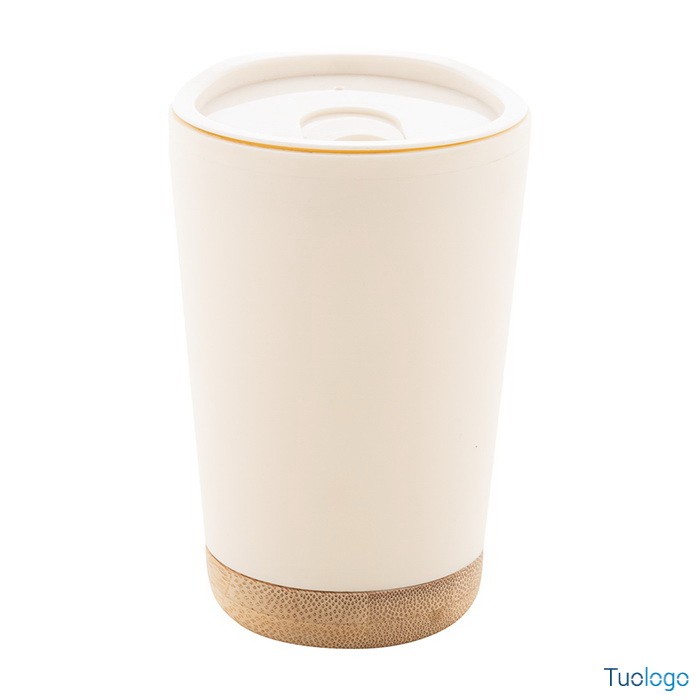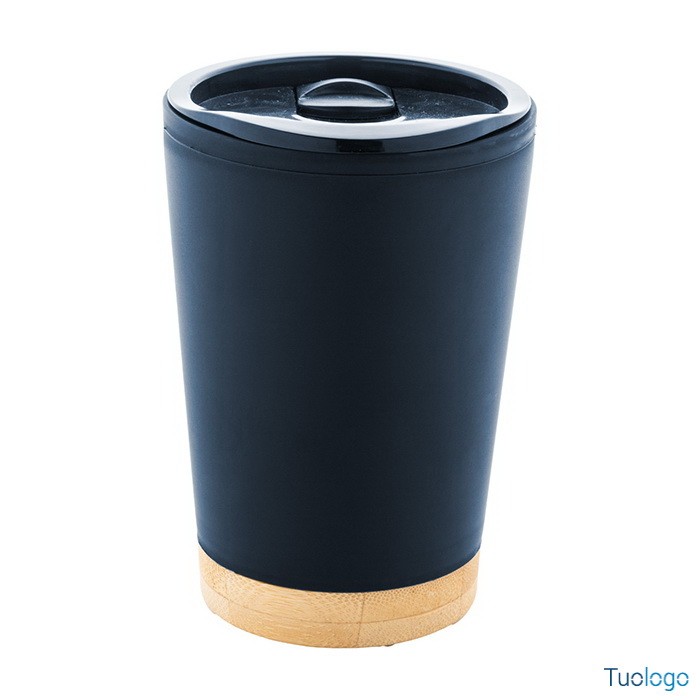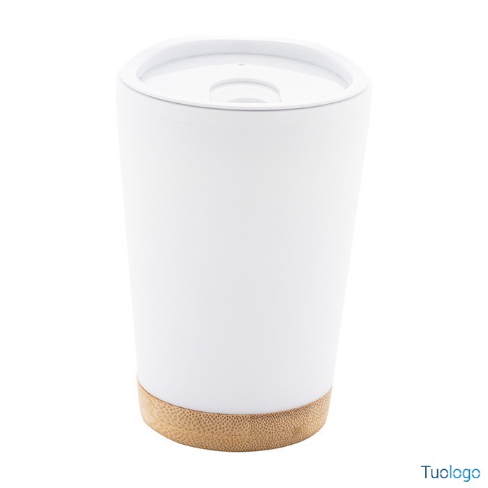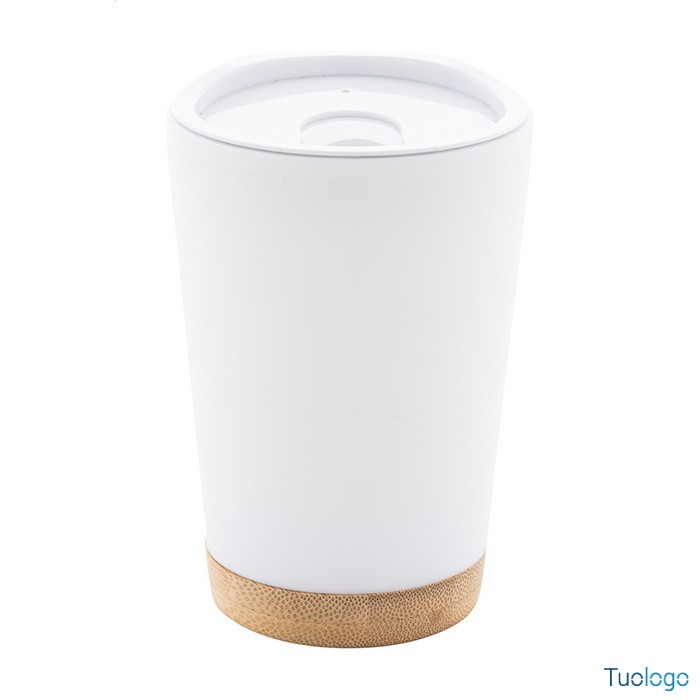 Tazza termica Jawar. Bicchiere termico in plastica PP a doppia parete, con coperchio erogatore e base in bamboo. Capienza: 260 ml. Dimensioni: diam cm 8,5×12.