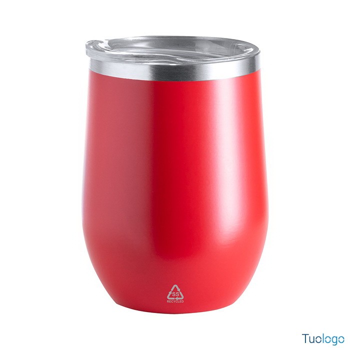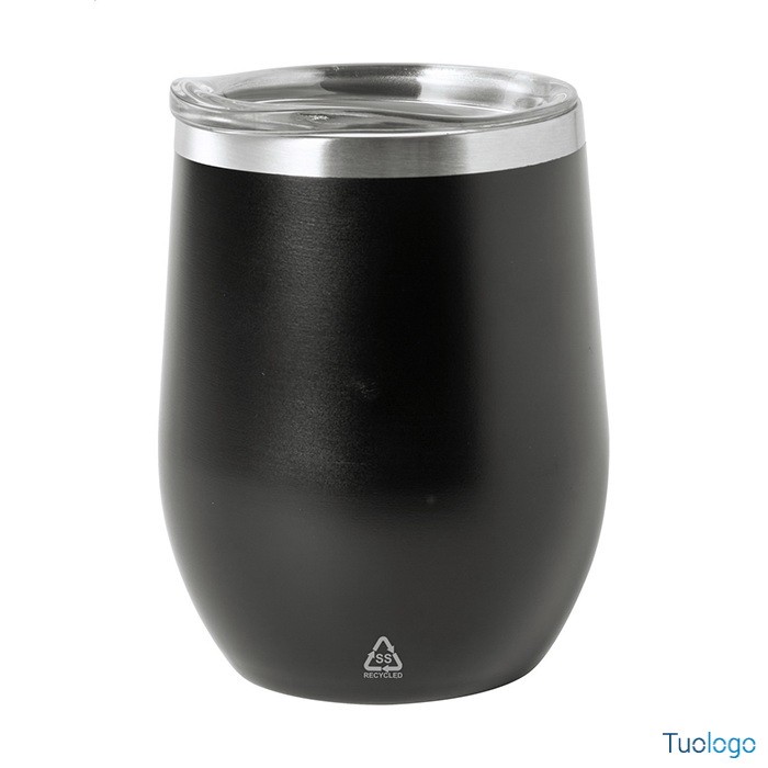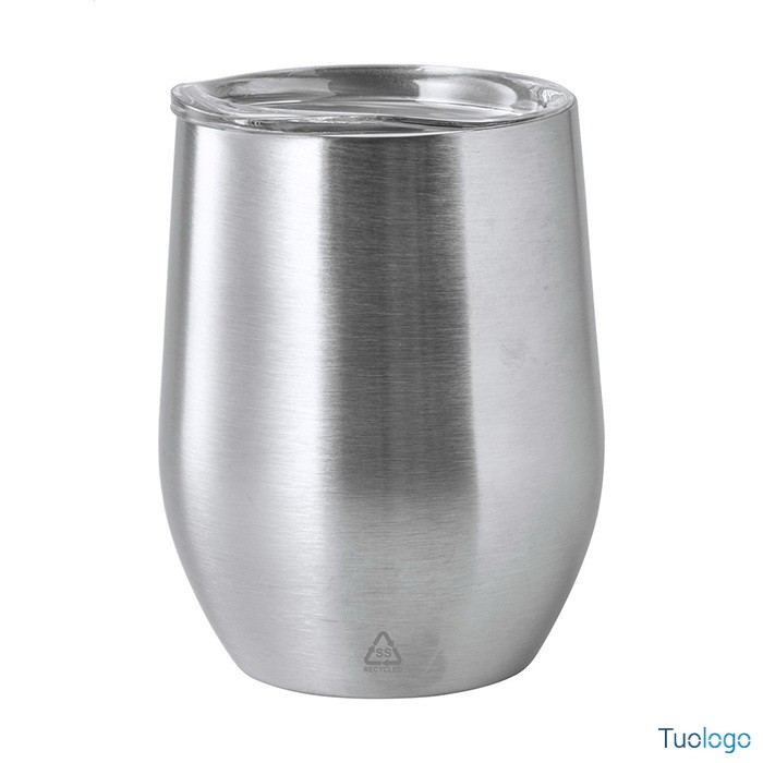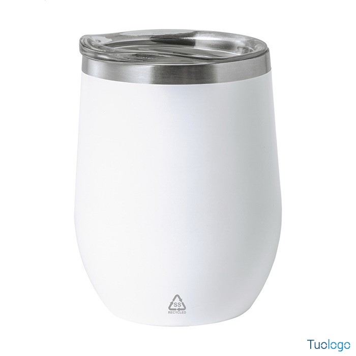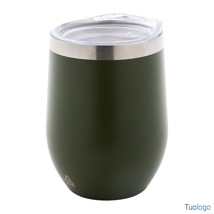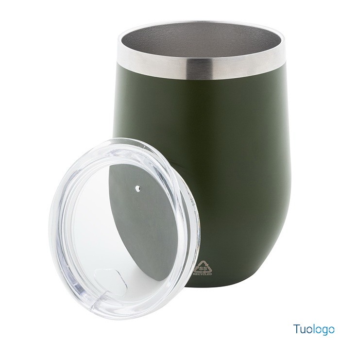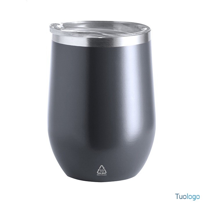 Tazza termica Kod. Tazza termica a doppia parete, in acciaio inox riciclato con coperchio in plastica. Senza manico. Capienza: 350 ml. Dimensioni: diam cm 8,8×11,9.