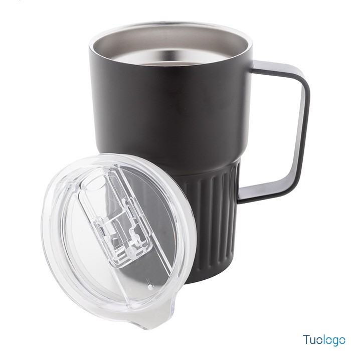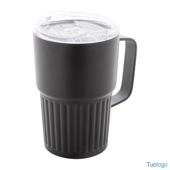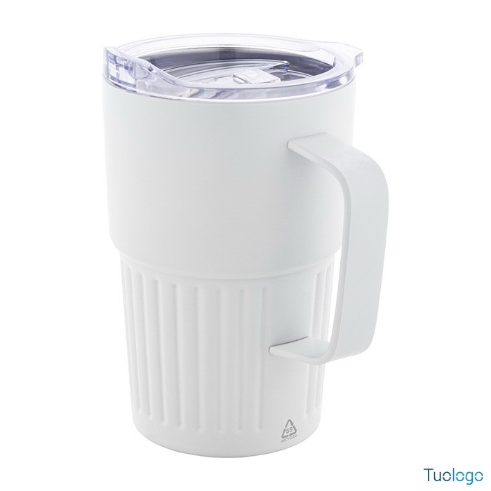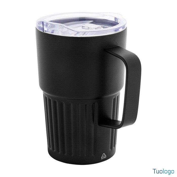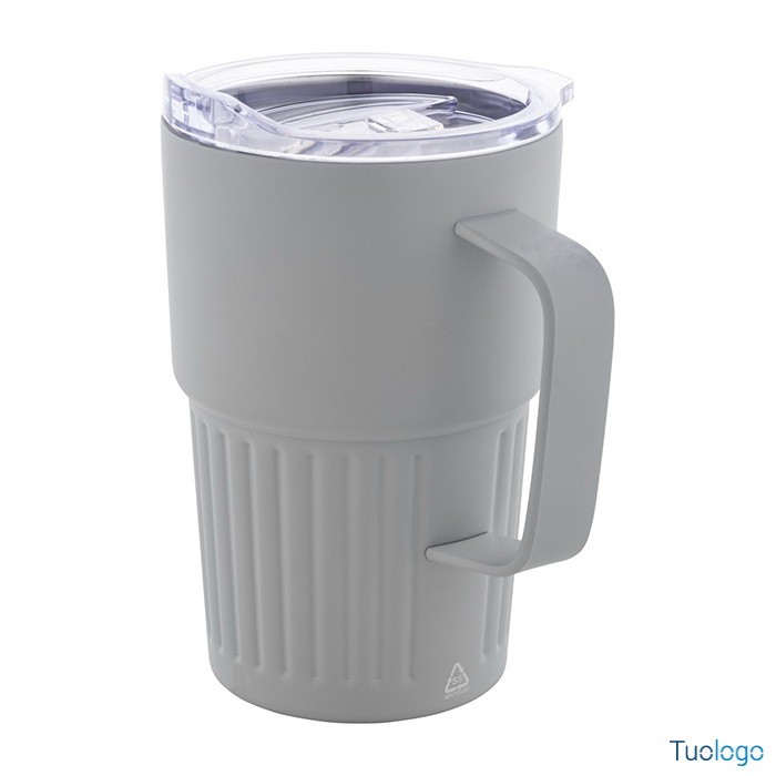 Tazza termica Pusla. Tazza termica a doppia parete in acciaio inox riciclato. Capacità 470 ml. Con coperchio in plastica ABS. Dimensioni: diam cm 8,6×13.