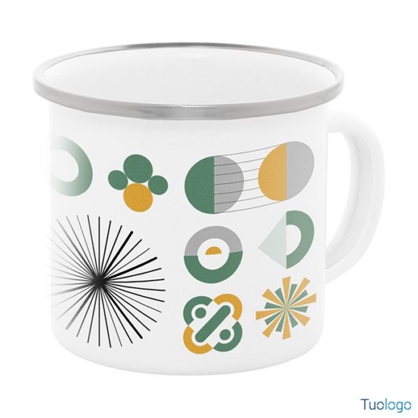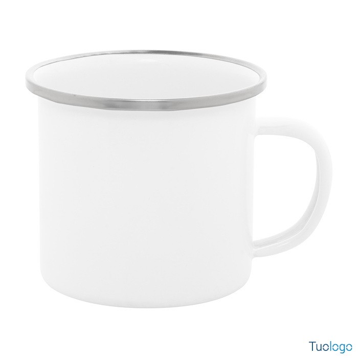 Tazza Vusobin. Tazza vintage da 500ml. per stampa in sublimazione in metallo smaltato con bordo in acciaio inox. Confezione in scatola di cartoncino bianco. Dimensioni: mm 98x90.