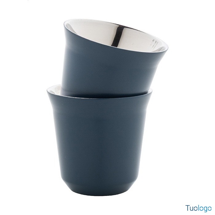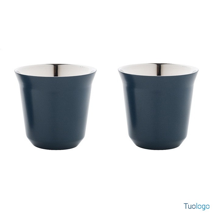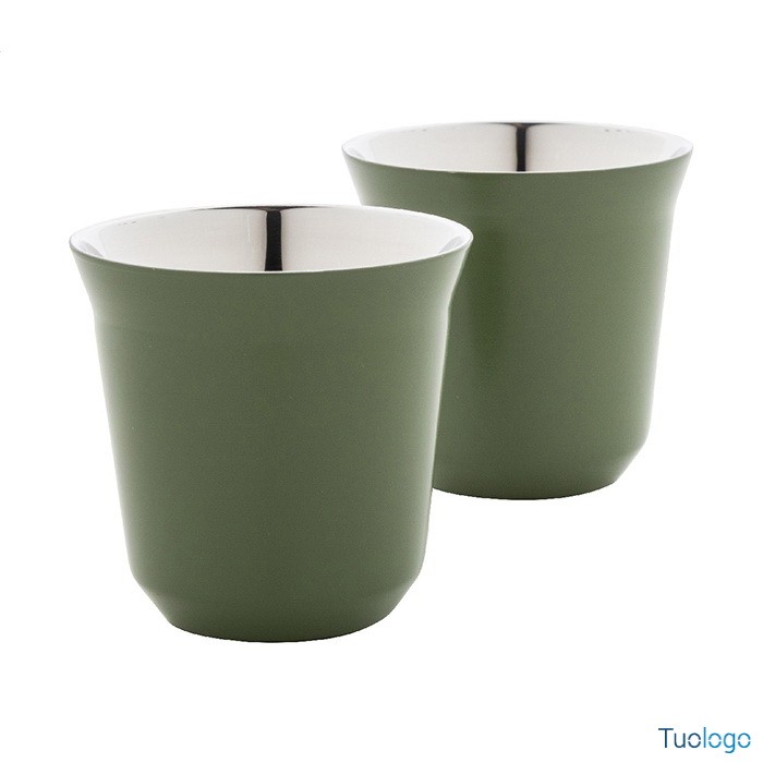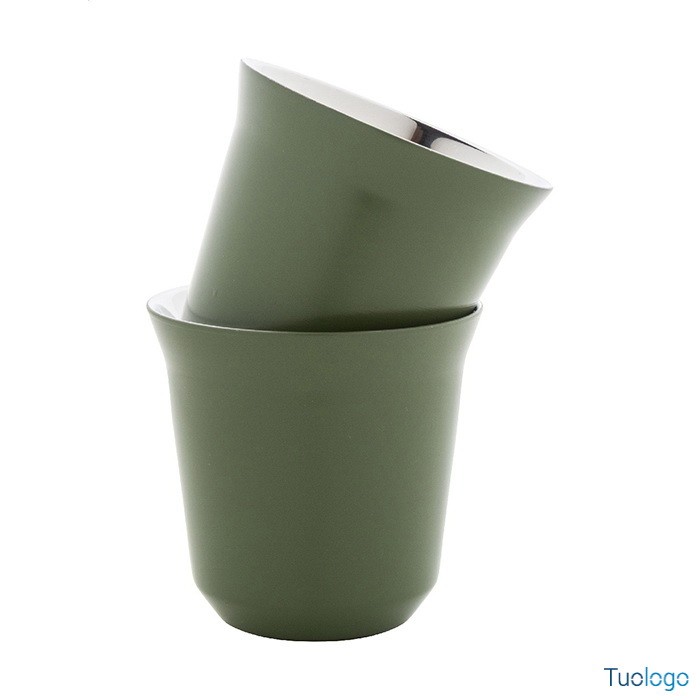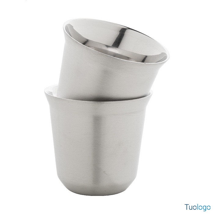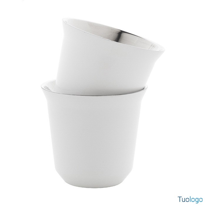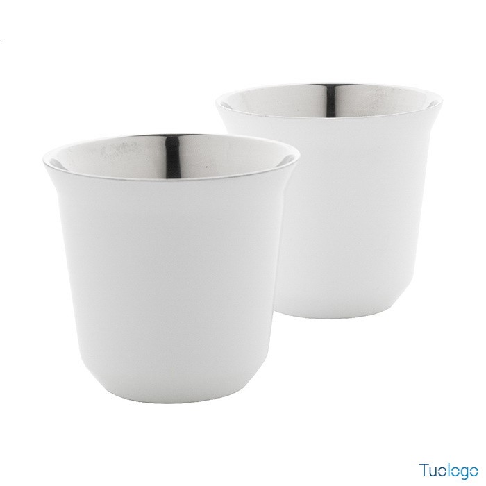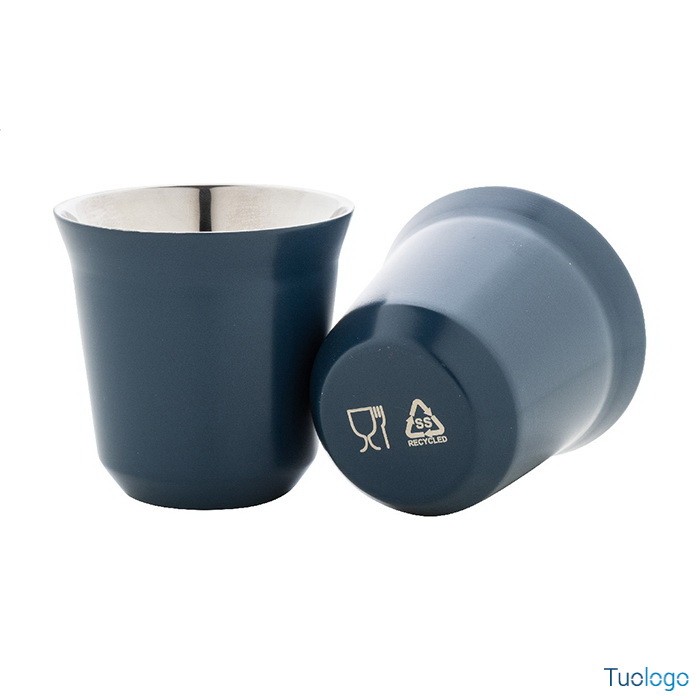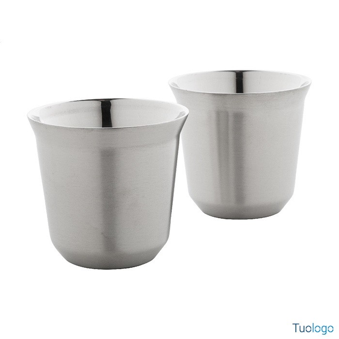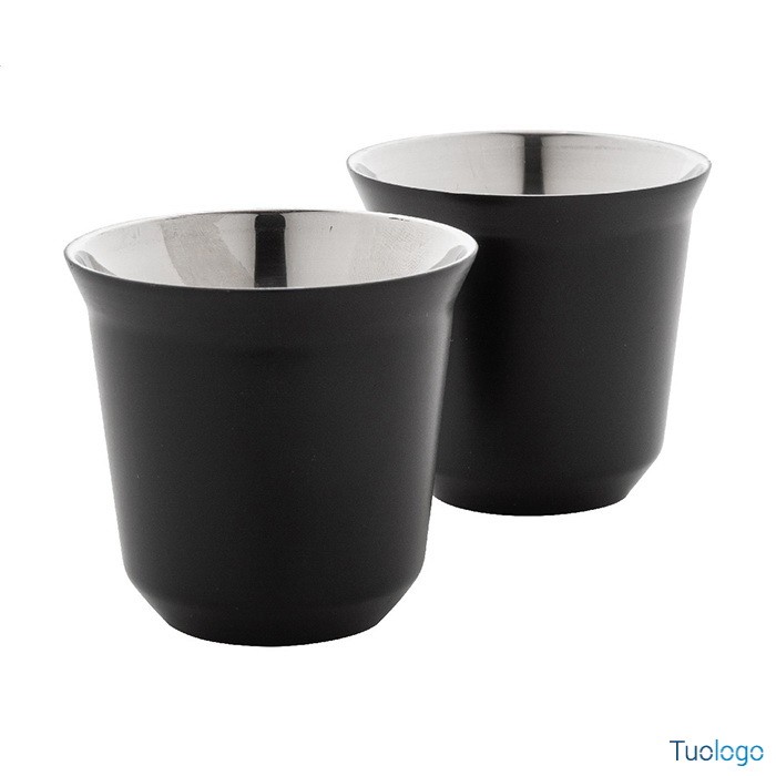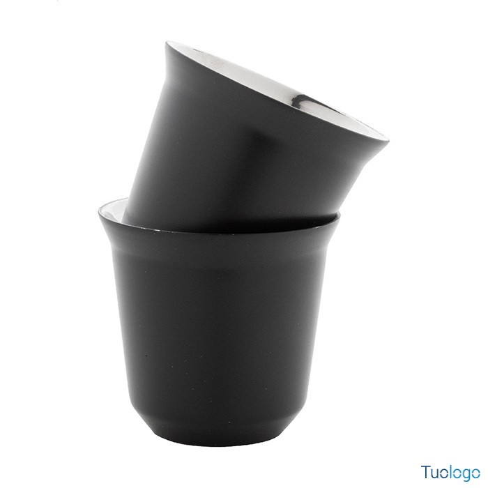 Tazze caffè Stove. Set di 2 tazze per caffè espresso a doppia parete in acciaio riciclato da 80 ml. Set fornito in scatola di cartoncino kraft. Dimensioni: cm 13,3x6,6x6,6.