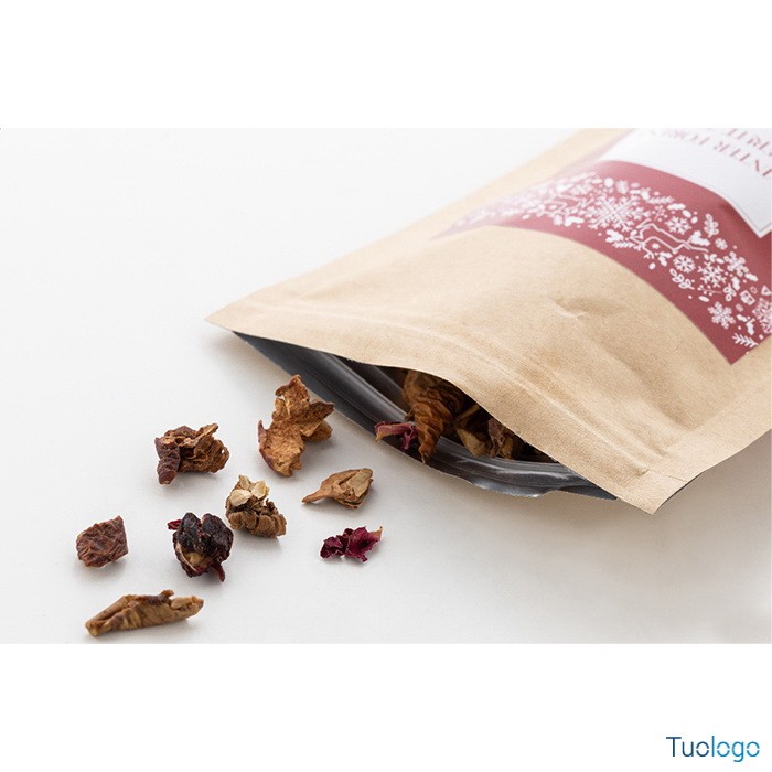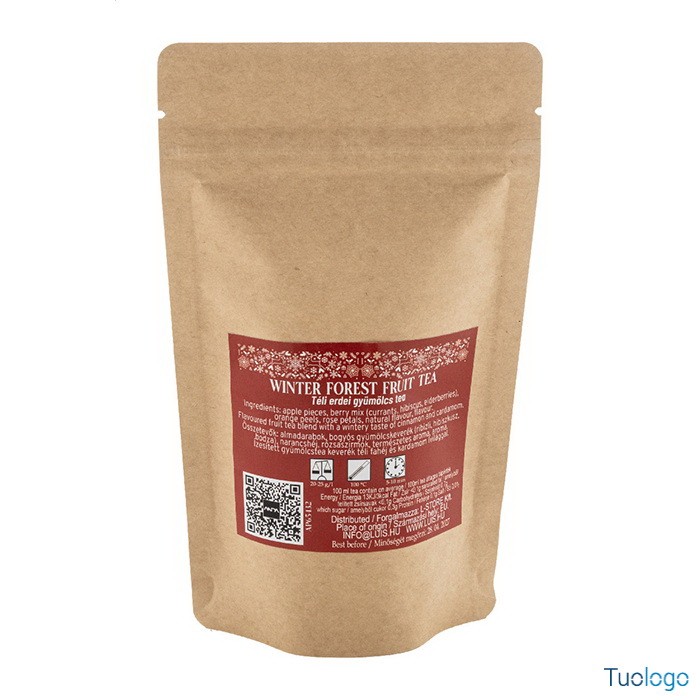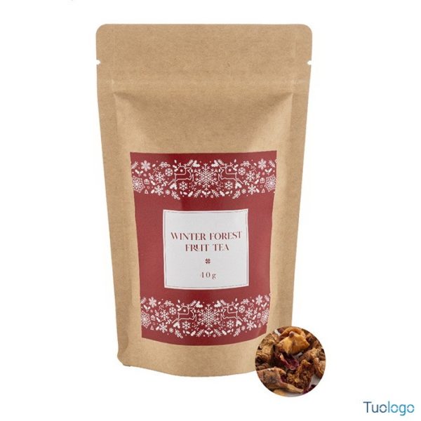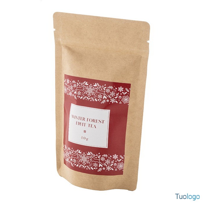 Tè confezionato Tedro. Tè sfuso ai frutti della foresta invernale confezionato in un sacchetto di cartoncino kraft. 40 grammi. Dimensioni: cm 9x18,3x4,7.
