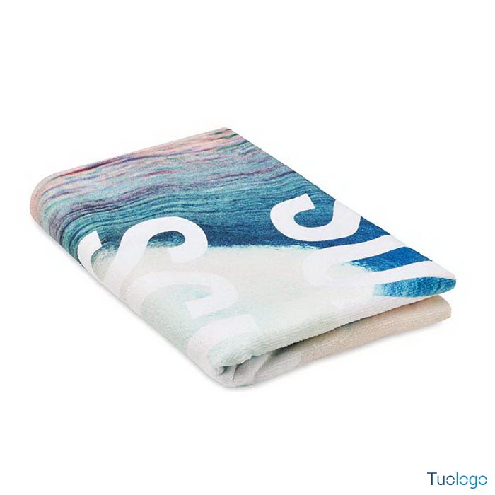 Telo mare Tamazula. 50% cotone, 20% poliestere, 30% poliestere riciclato 350 gr. I prezzi includono la stampa in quadricromia su 1 lato. Confezionato in polybag singola. Dimensioni: cm 70x140. Il lato frontale in velour RPET/poliestere stampato a colori ha trama morbida. Il retro del telo è in spugna di cotone bianco per massima assorbenza. Produzione in Turchia. Il materiale è una fibra di poliestere riciclata al 100% prodotta dal marchio REPREVE® Unifi, Inc. Realizzato con bottiglie d'acqua in plastica post-consumo di provenienza sostenibile.