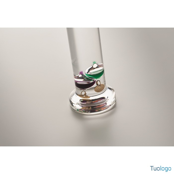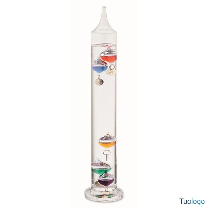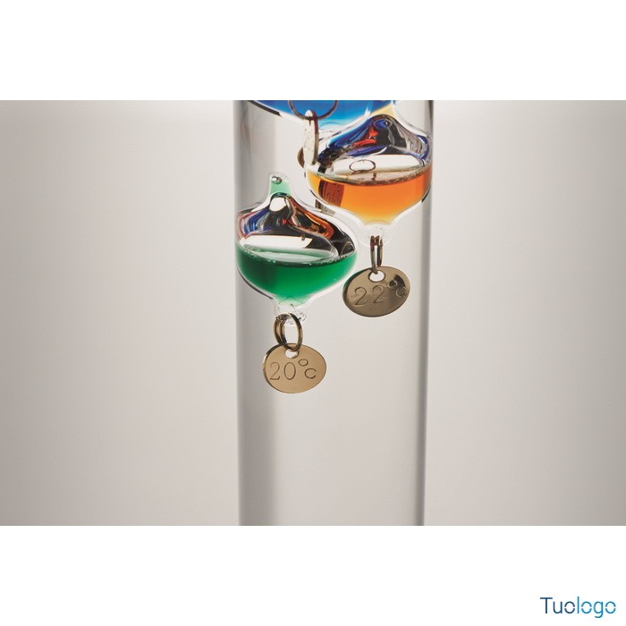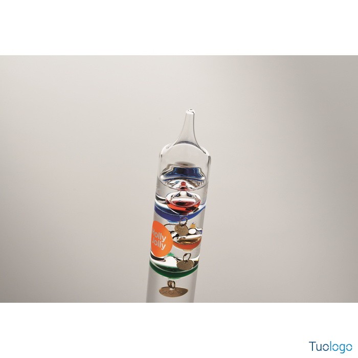 Termometro Lapi. Termometro Galileiano in vetro con cinque globi galleggianti colorati. Ogni globo indica la temperatura. Dimensioni: cm 3,6X28.