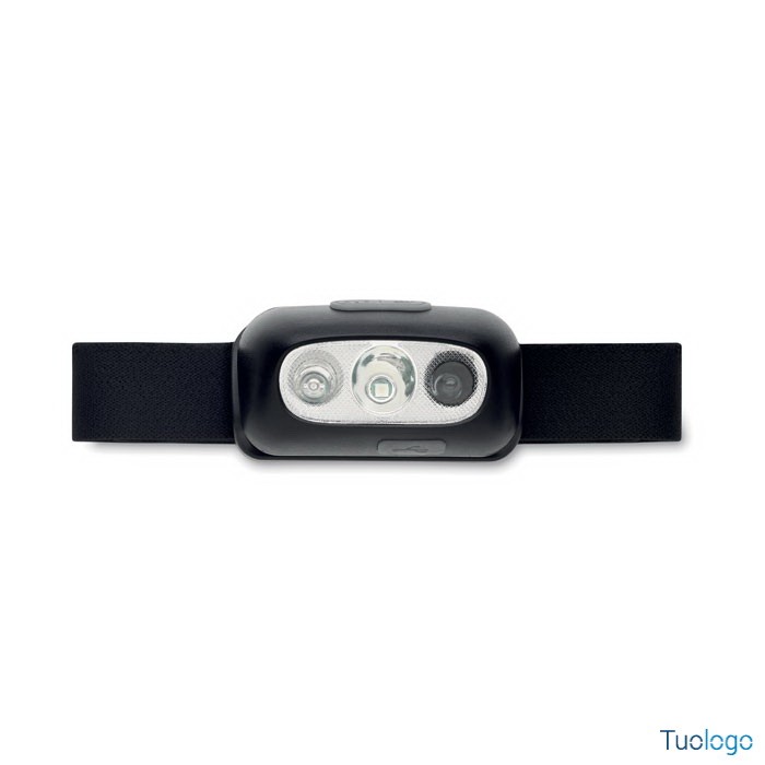 Torcia da testa ricaricabile e regolabile Aquio. Torcia da testa ricaricabile e regolabile con 1 luce LED (50 lumen) e 3 modalità di illuminazione. Batteria ricaricabile da 400 mAh incorporata e cavo di ricarica incluso. Dimensioni: cm 7x4x7.