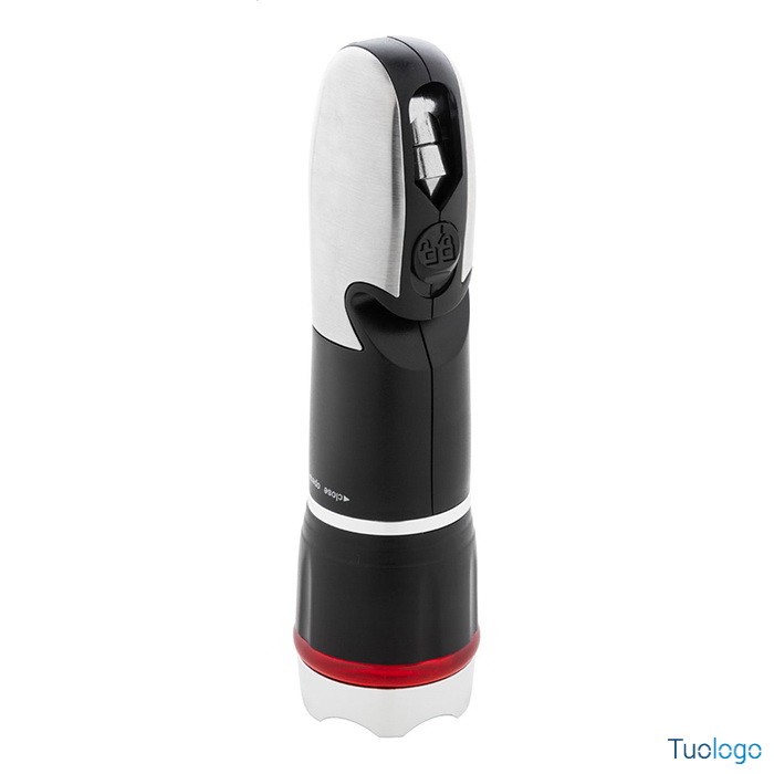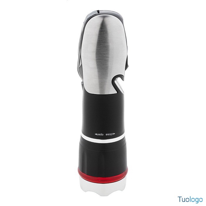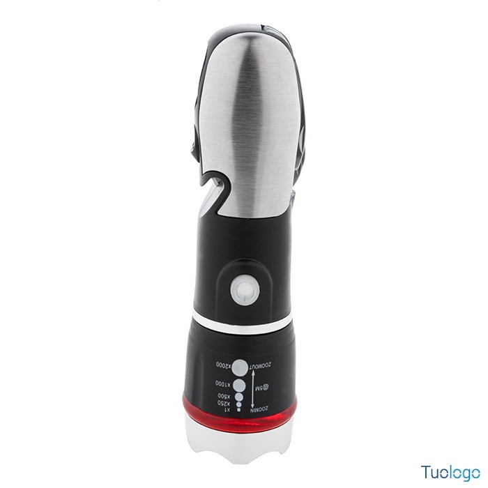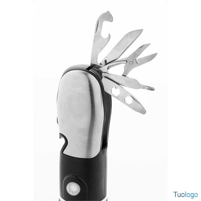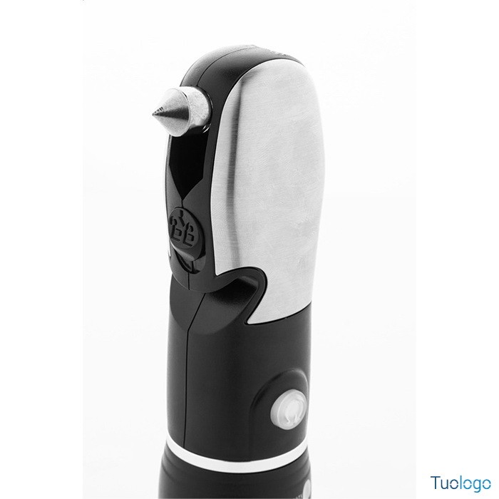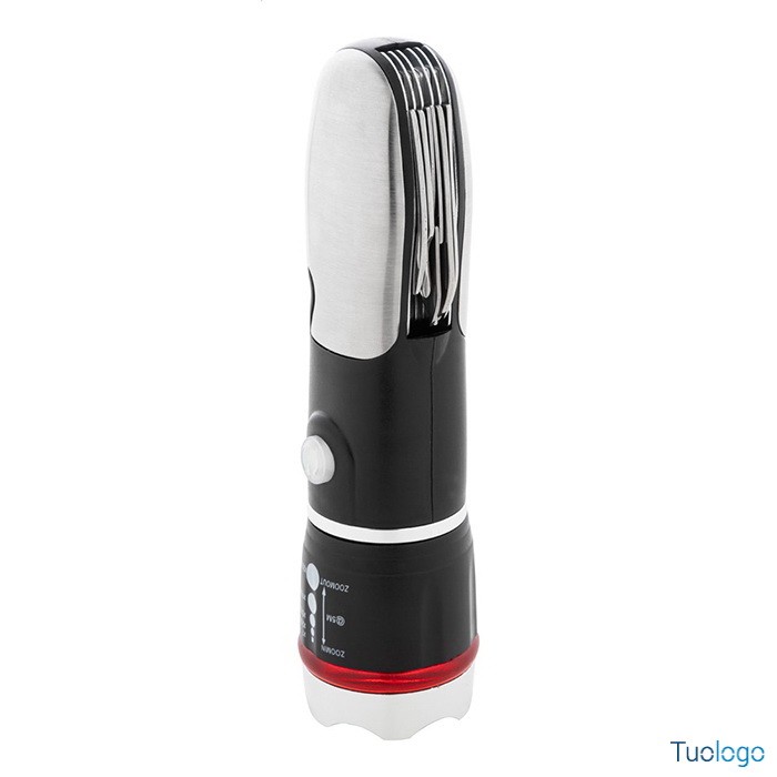 Torcia multifunzionale Fraser. Torcia multifunzionale in ABS e acciaio inox con martello di emergenza,taglia cinture di sicurezza e multi utensile con 9 funzioni. Luce LED zoomabile. Dimensioni: diam cm 4x15.
