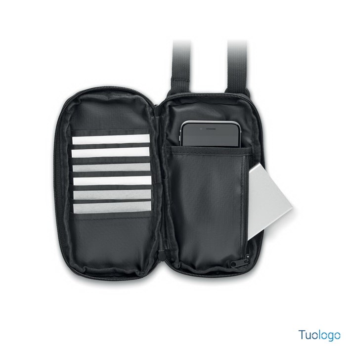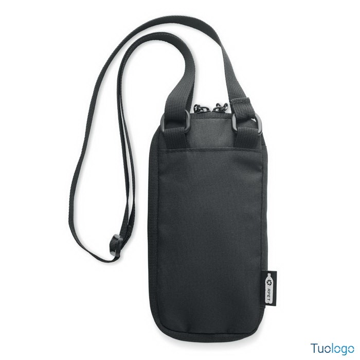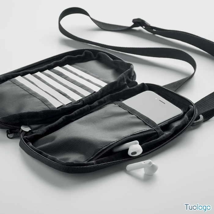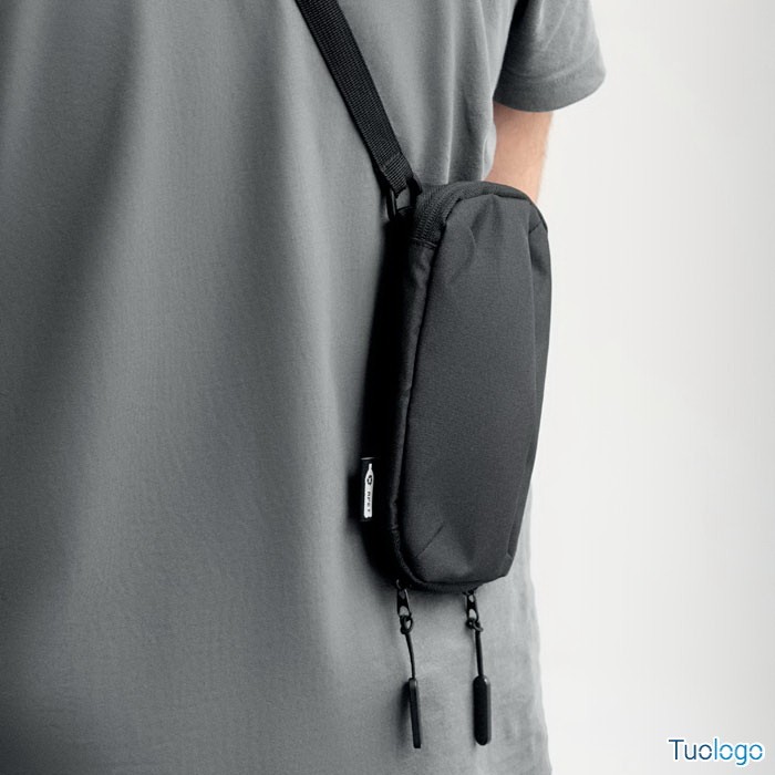 Tracolla porta smartphone. In poliestere 300D RPET, regolabile. Tasca frontale e laterale con cerniera. Scomparto principale con diverse tasche. Dimensioni: cm 10x2,5x20.
