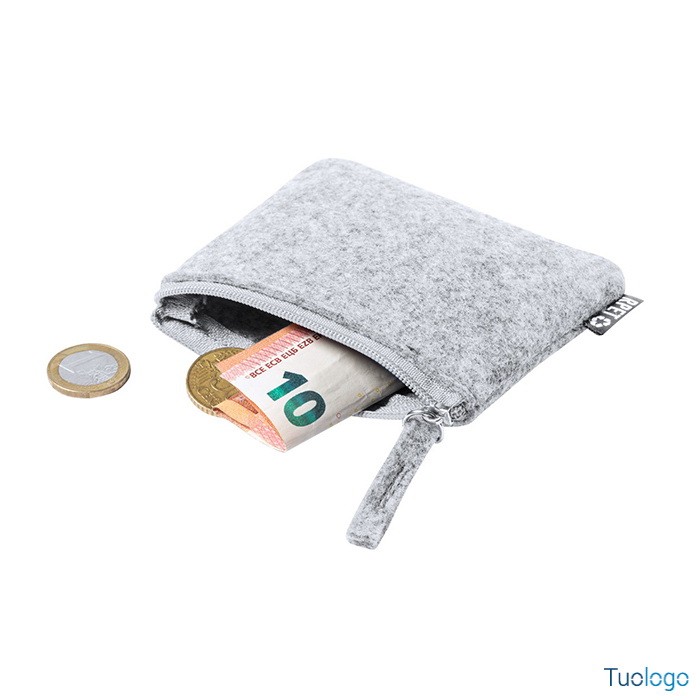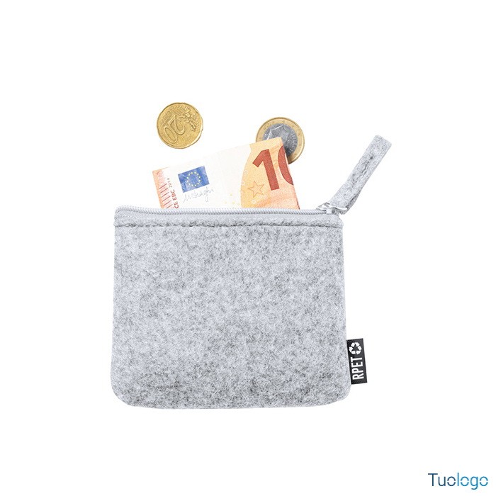 Trousse in RPET Prozelo. Borsellino in feltro RPET con cerniera ed etichetta RPET. Dimensioni: cm 10,5x8x0,5.