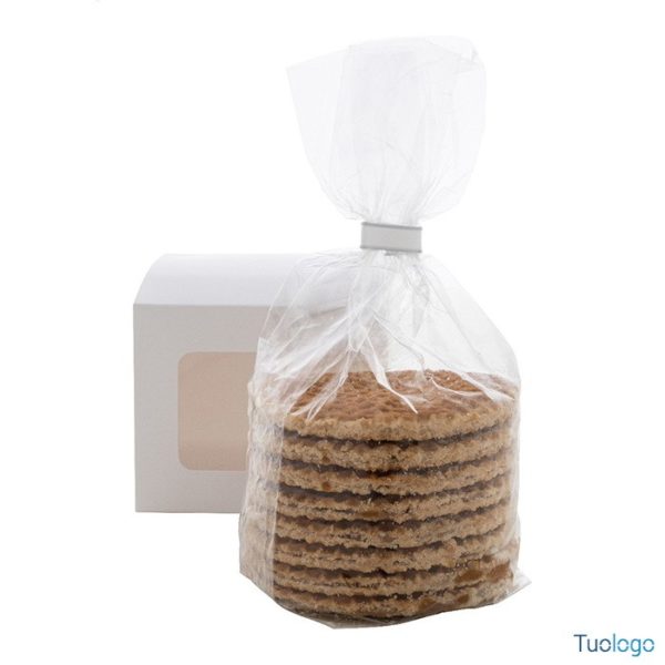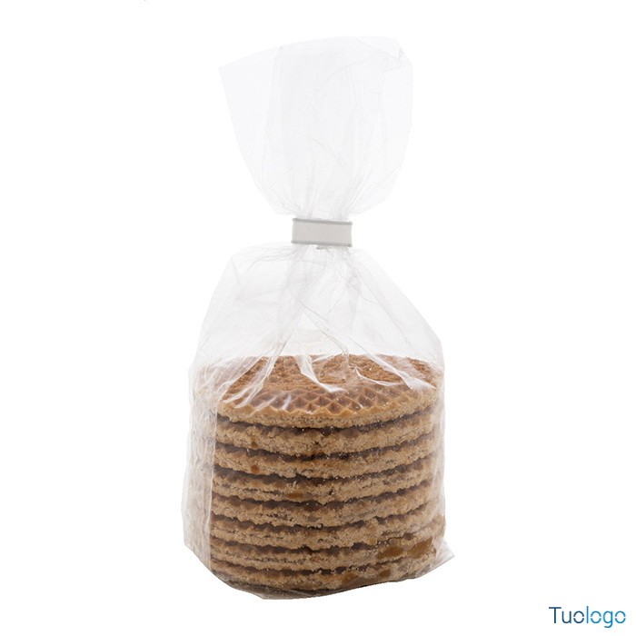 Waffle confezionati Kut. Autentici stroopwafel olandesi confezionati in un sacchetto di plastica. 8 pezzi, 250 grammi.Personalizzabile con un adesivo o con una confezione regalo in carta. Dimensioni: cm 8x6.