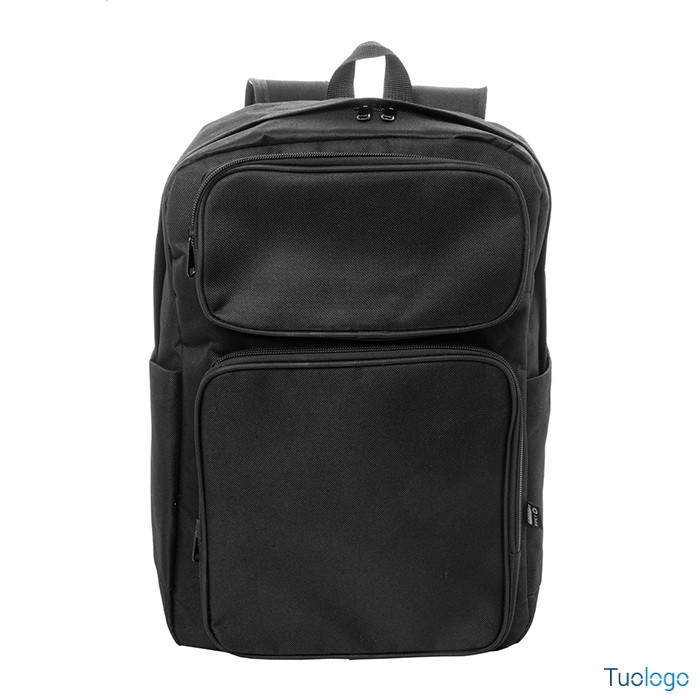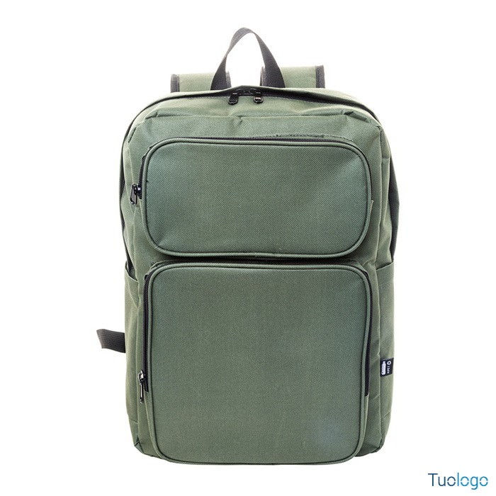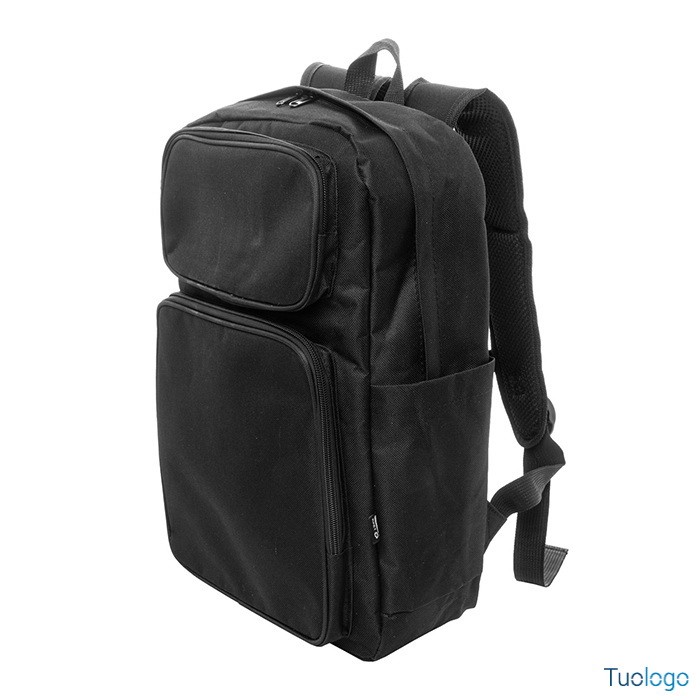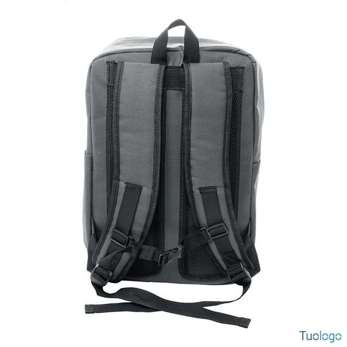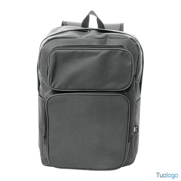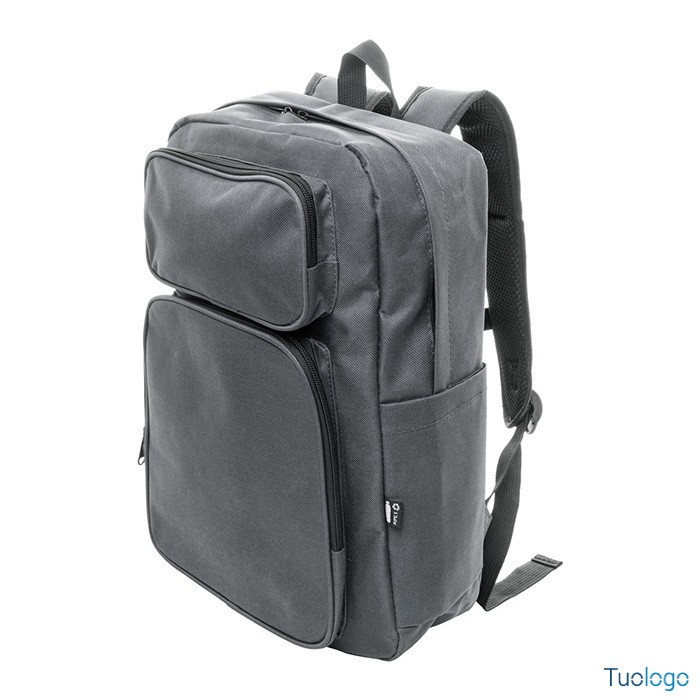 Zaino in poliestere Gasip. Zaino in poliestere 600D RPET con scomparto principale e 2 tasche chiusi da cerniera, tasca laterale, scomparto imbottito per laptop e tablet. Cinghia trolley. Dimensioni: cm 28×42×12.