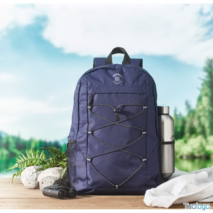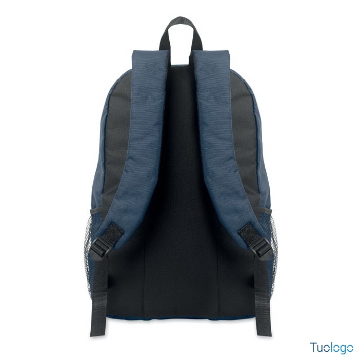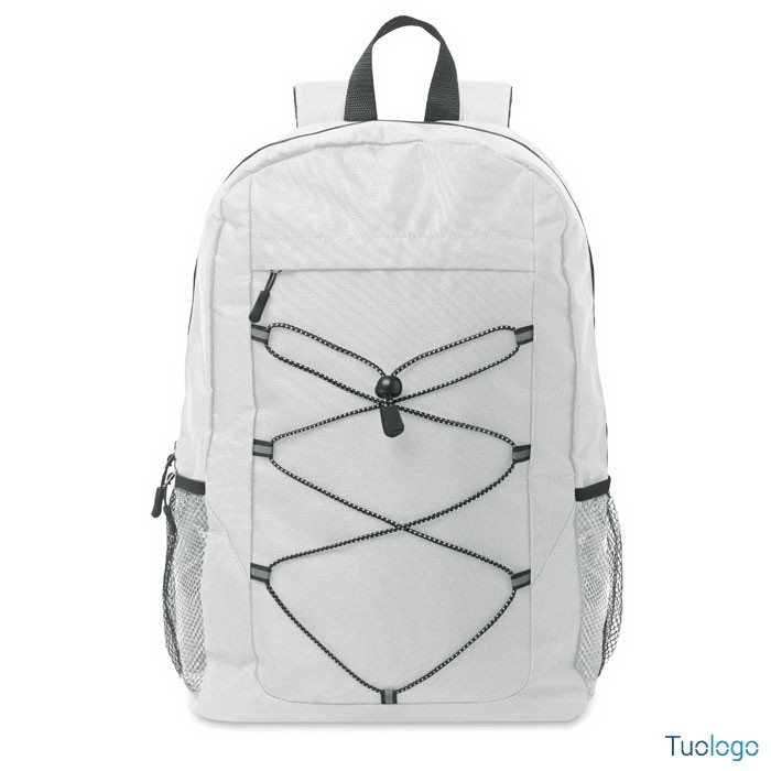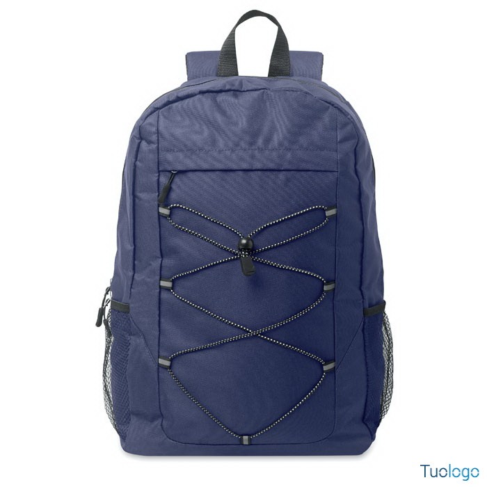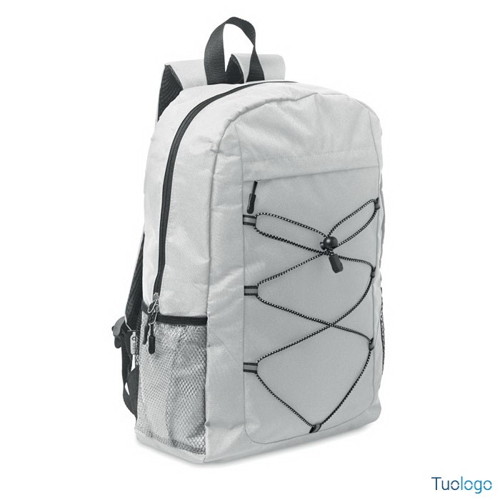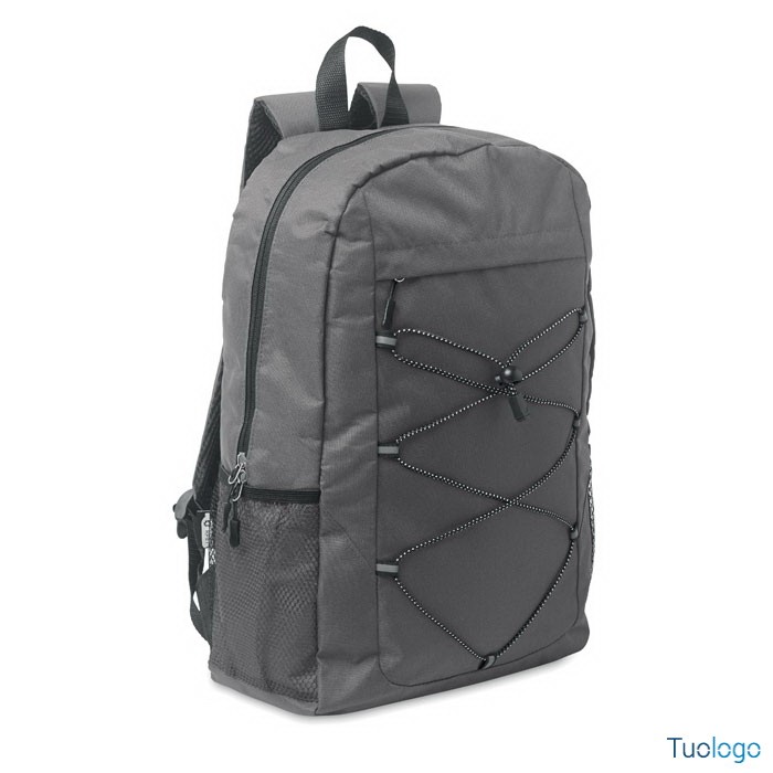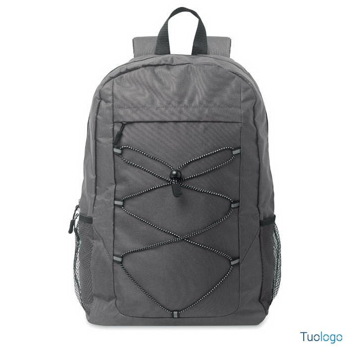 Zaino in poliestere RPET Luzia. Zaino in poliestere 600D RPET con cordino decorativo e pannello frontale con cerniera. Tasche in rete su entrambi i lati. Dimensioni: cm 30x14x45.