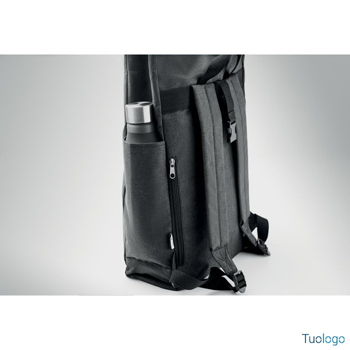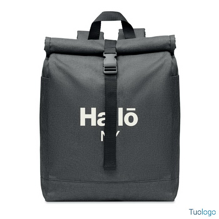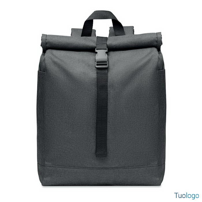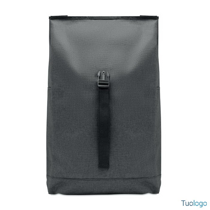 Zaino in RPET Miasino. In poliestere in RPET 600D, 2 toni con chiusura superiore a rotolo. Dimensioni: cm 28x13x50.