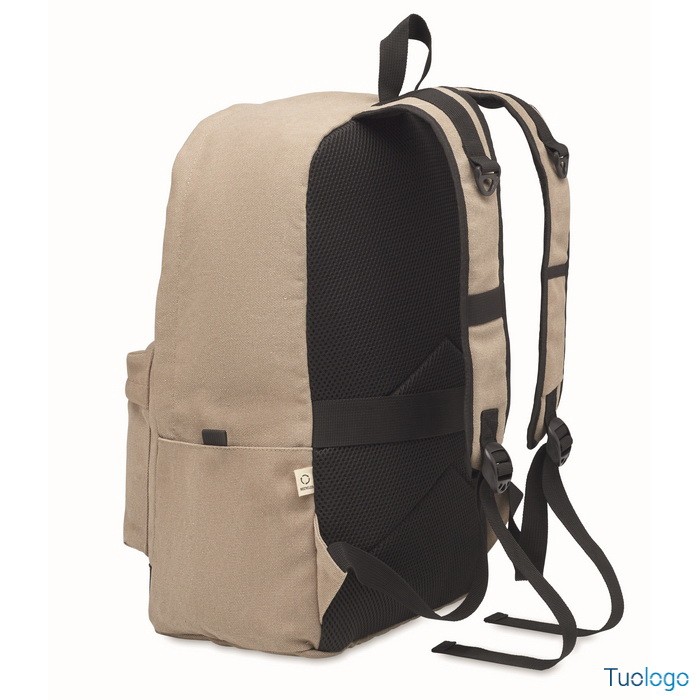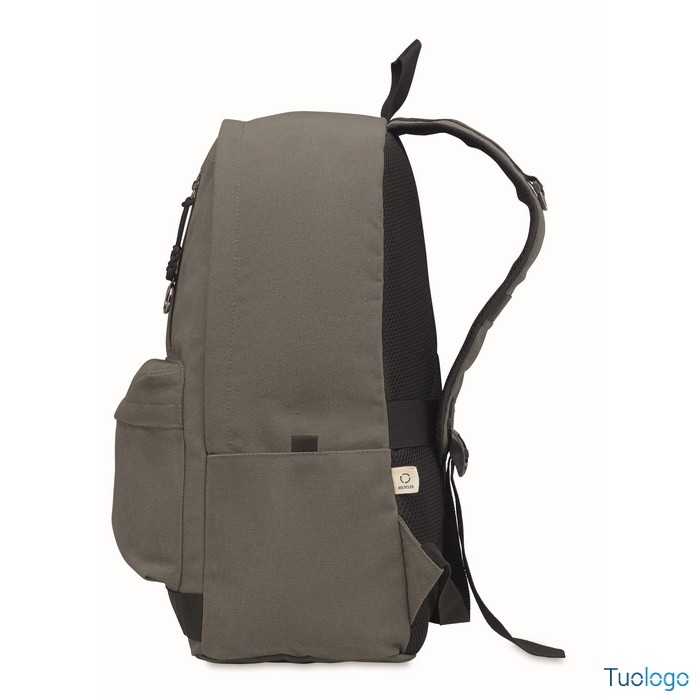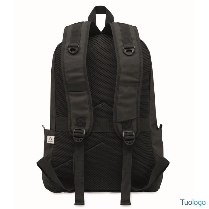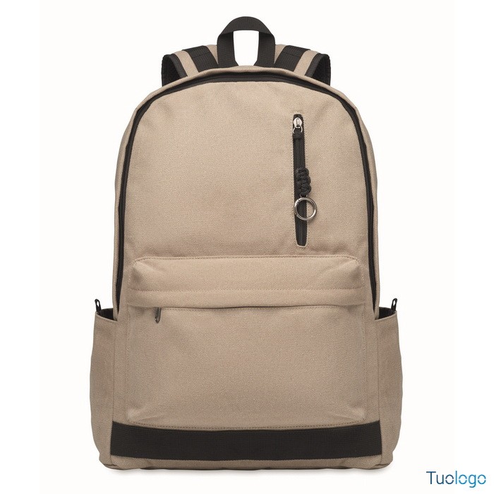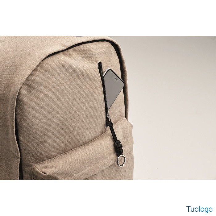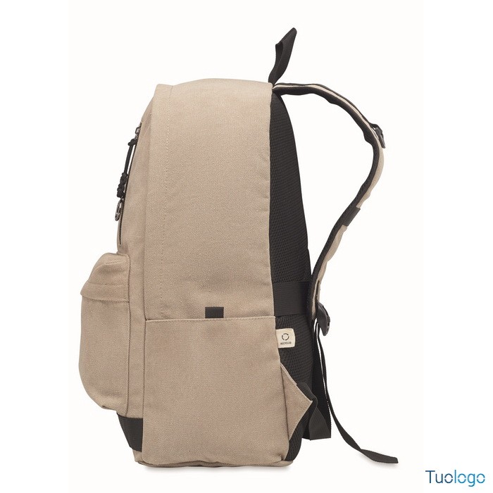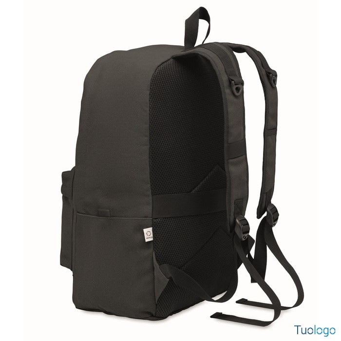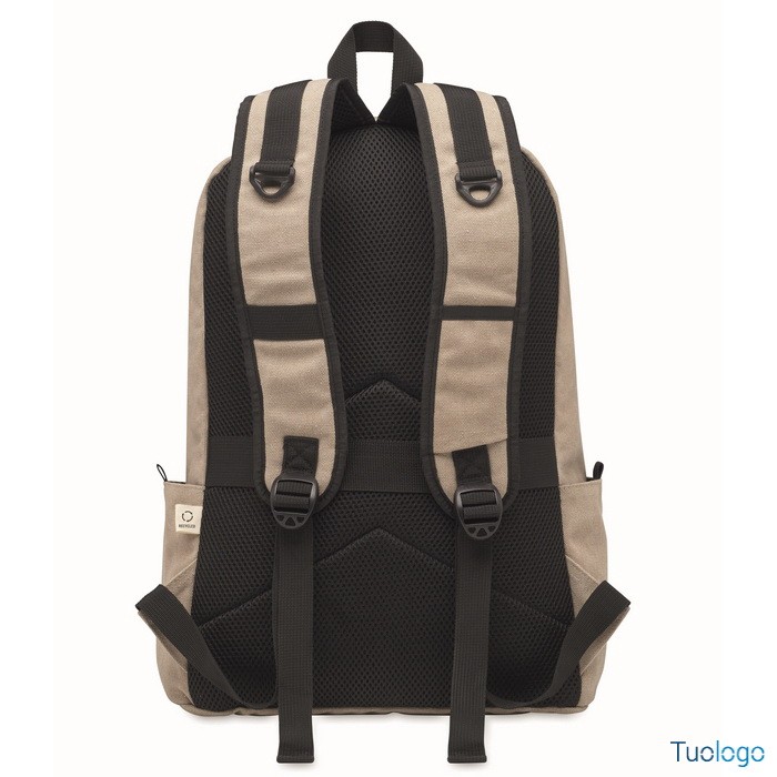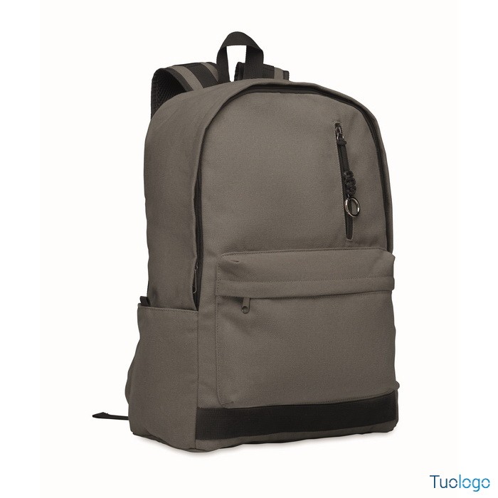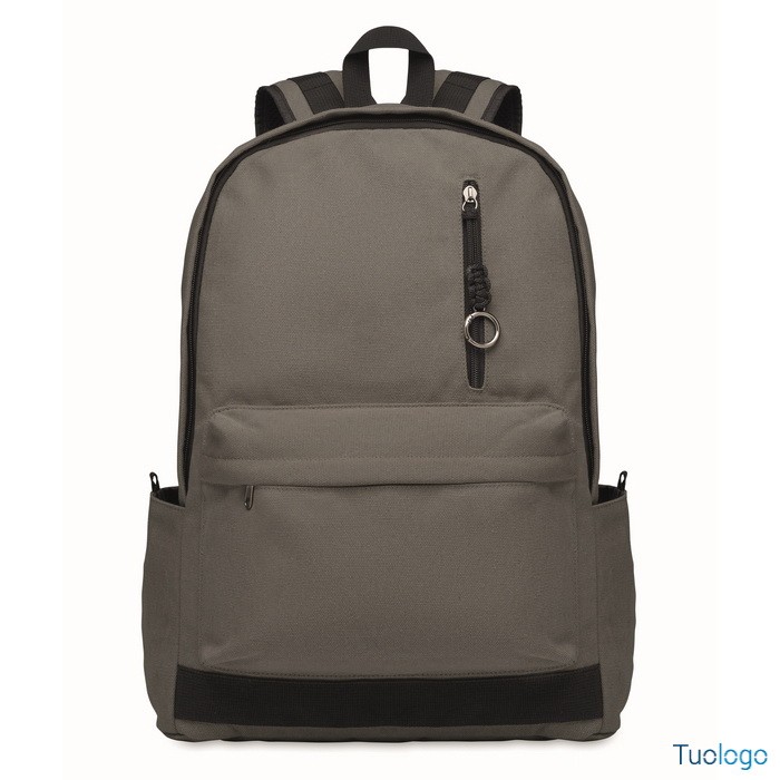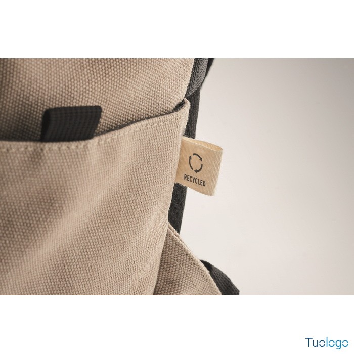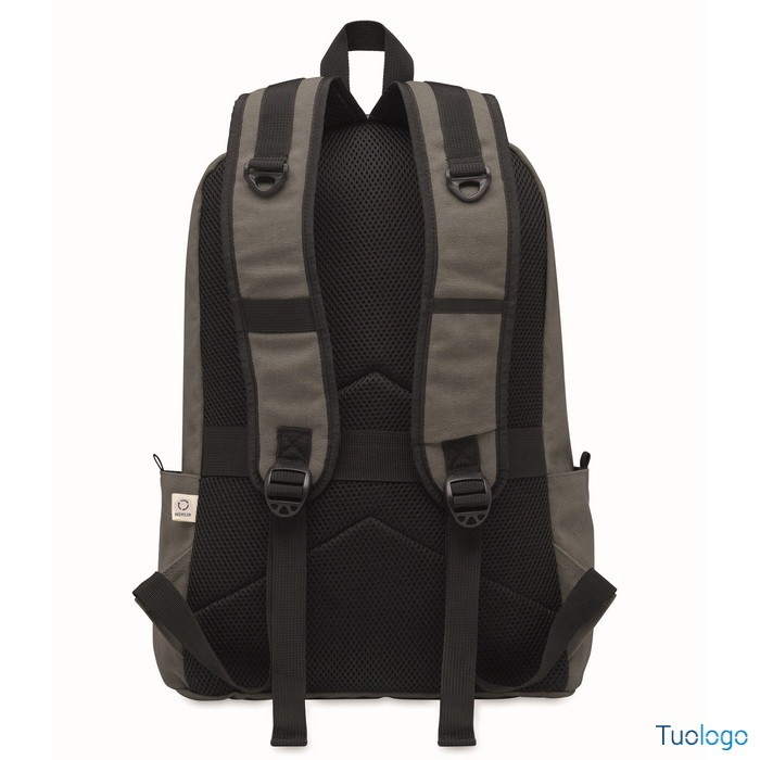 Zaino Leirru. Zaino porta laptop da 15 pollici in cotone riciclato pre-consumo. Ampia tasca frontale con cerniera con scomparto interno per laptop. Dimensioni: cm 30x18x45.