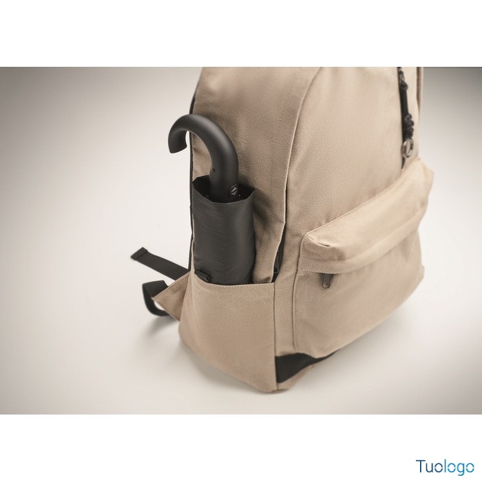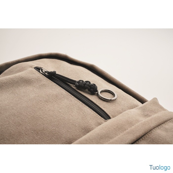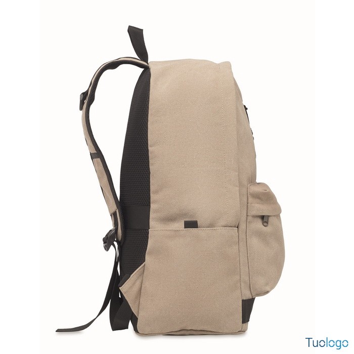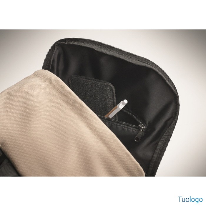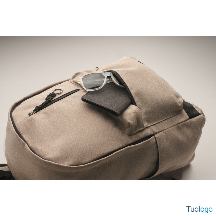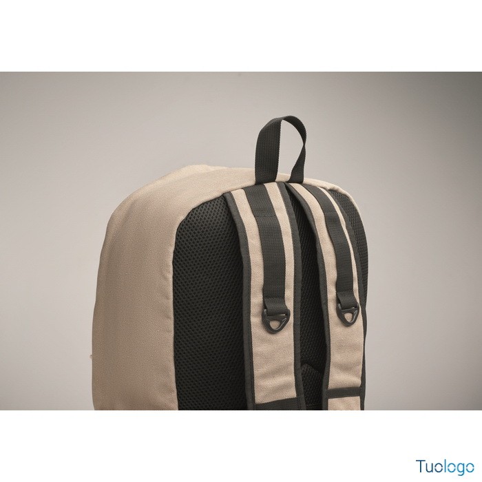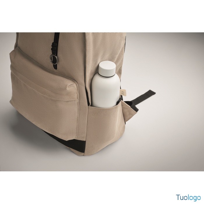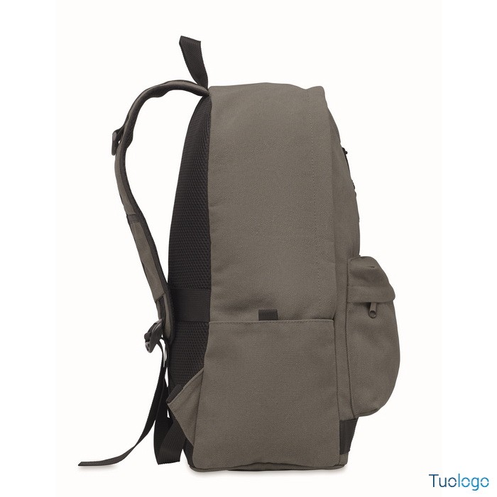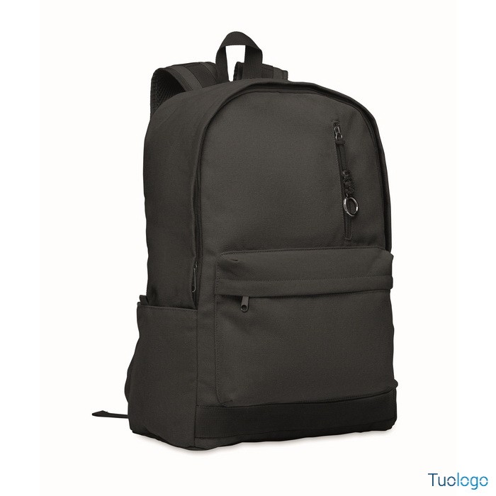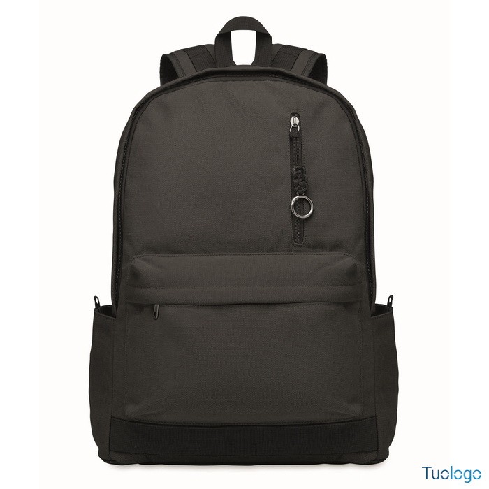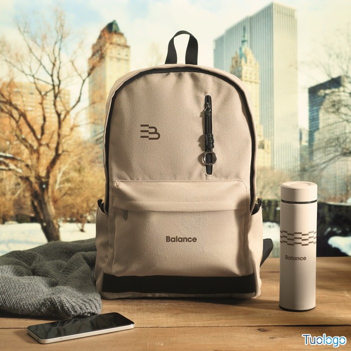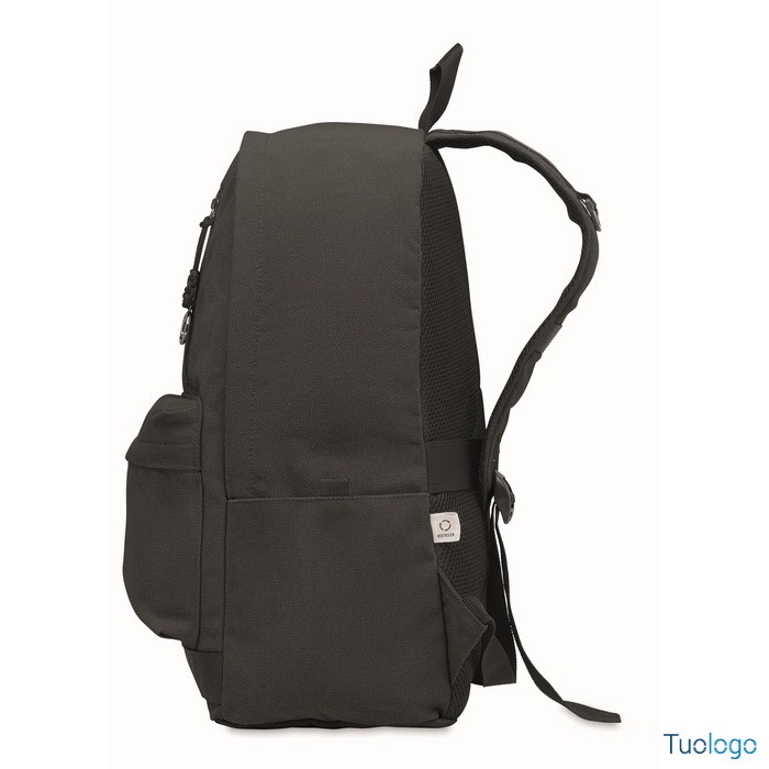 Zaino Leirru. Zaino porta laptop da 15 pollici in cotone riciclato pre-consumo. Ampia tasca frontale con cerniera con scomparto interno per laptop. Dimensioni: cm 30x18x45.