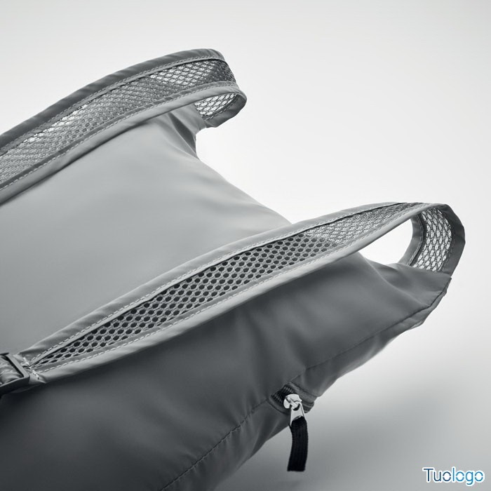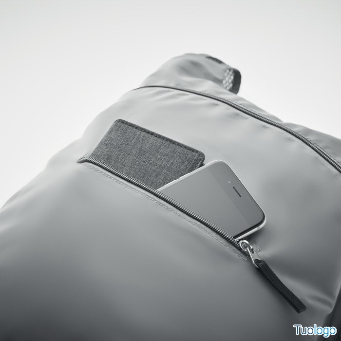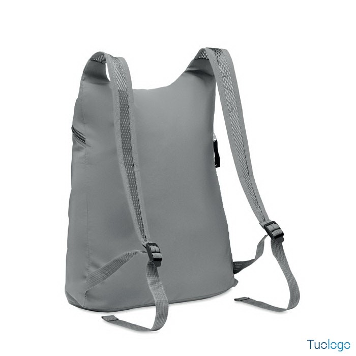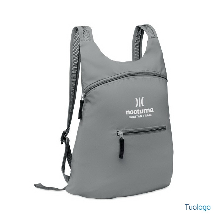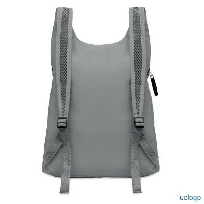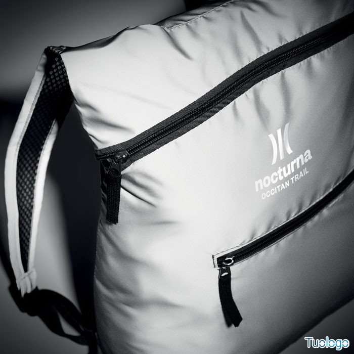 Zaino pieghevole riflettente. In poliestere 190T altamente riflettente, con tasca frontale con cerniera e spallaccacci regolabili e removibili. Dimensioni: cm 36x11x39,5.