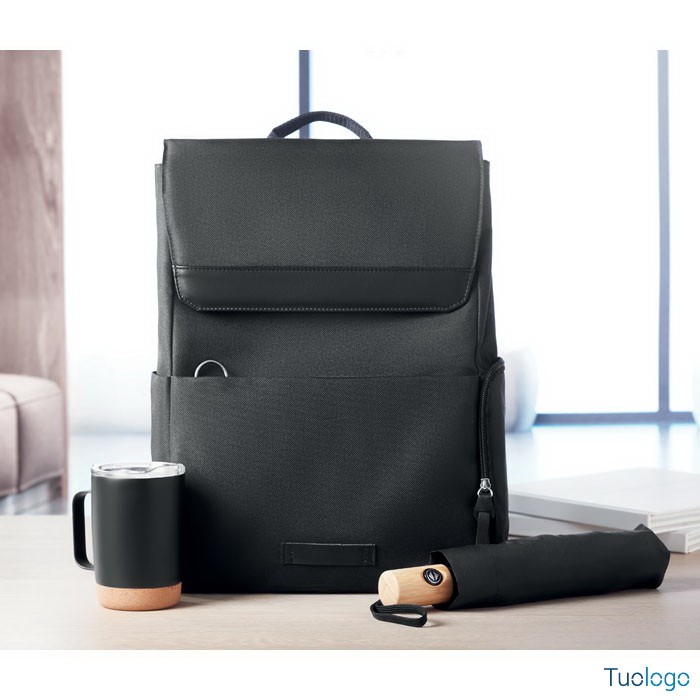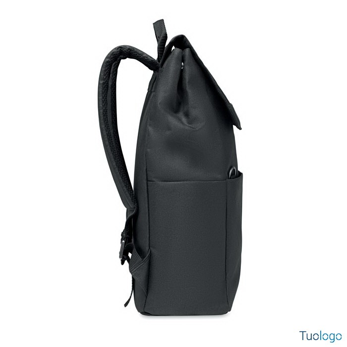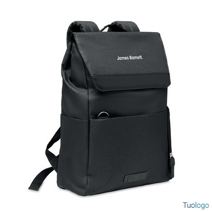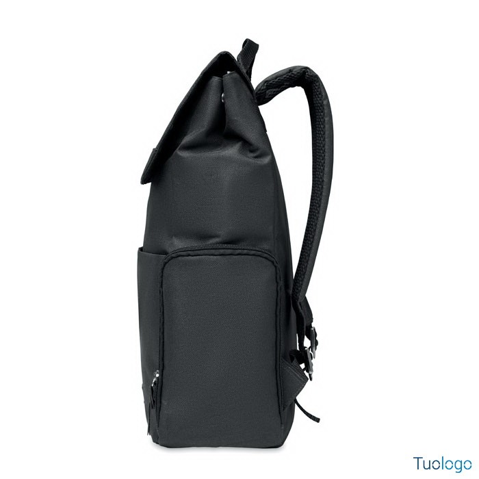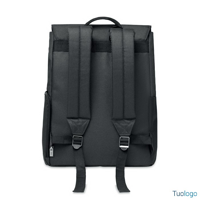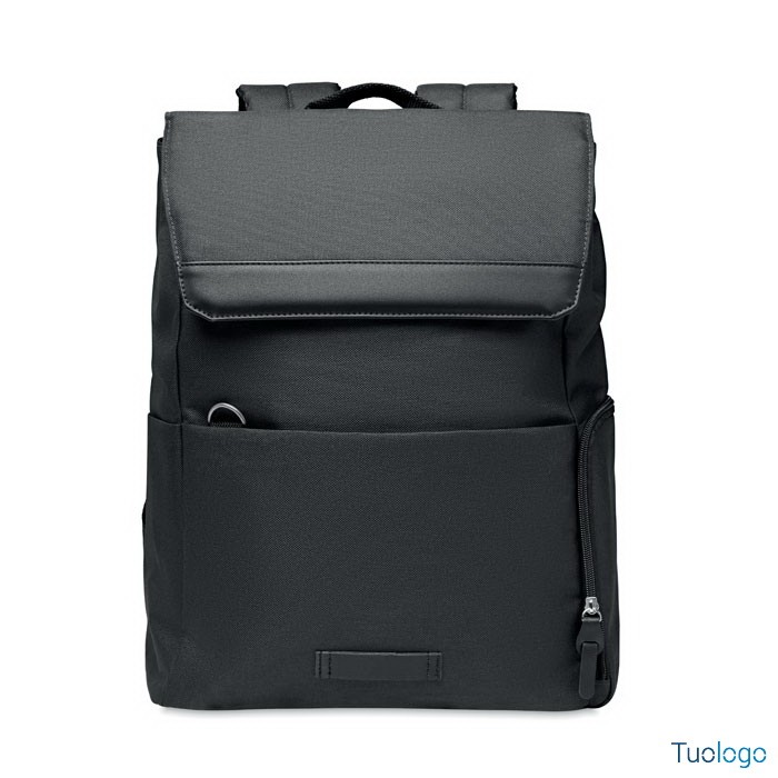 Zaino porta computer Melilli. In RPET 600D con bottone a pressione magnetico, tasche anteriori con cerniera, 2 tasche laterali e scomparto imbottito per computer da 15 pollici. Dimensioni: cm 31x15x44.
