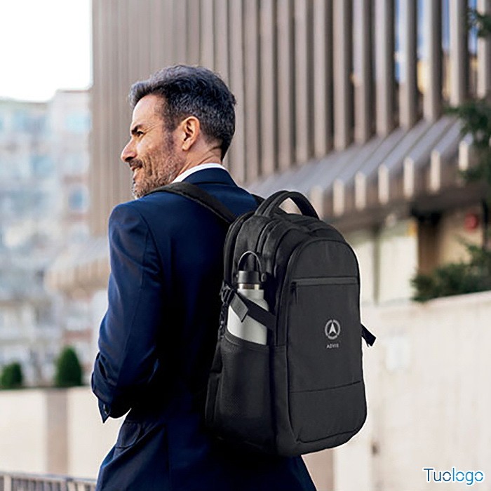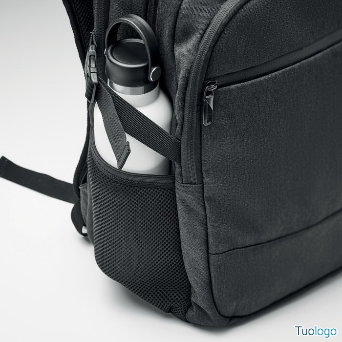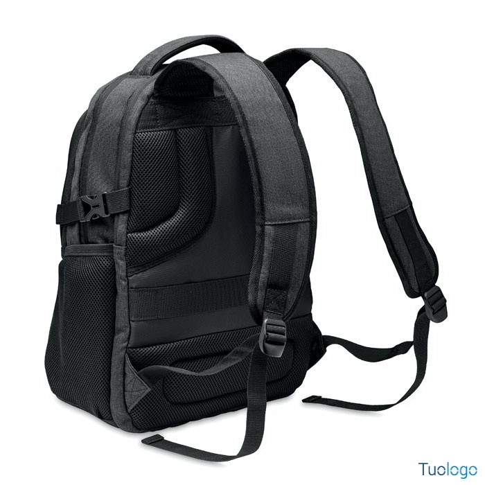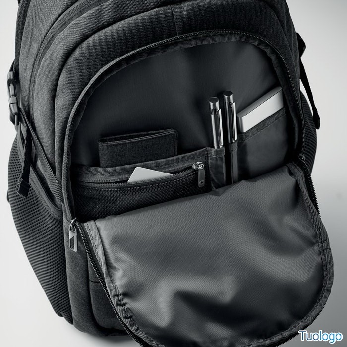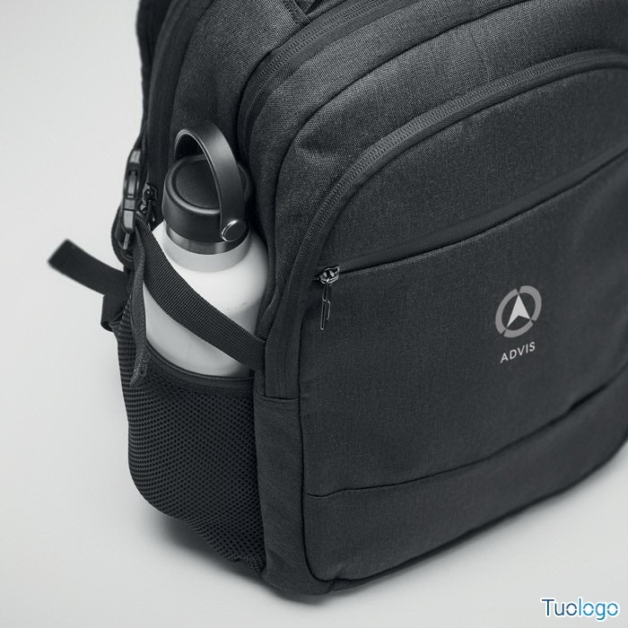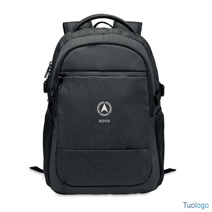 Zaino porta computer RPET. In poliestere 600D RPET.Porta computer 15 pollici. 3 scomparti esterni con cerniera e tasche interne.Dimensioni: cm 45x31x18,5. 2 tasche laterali in rete. Schienale imbottito in rete. Supporto per trolley.