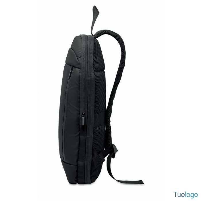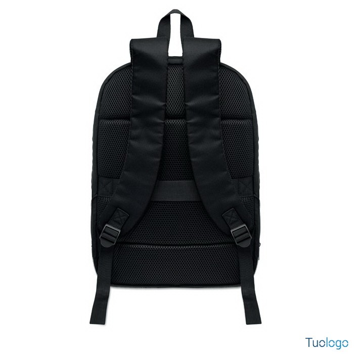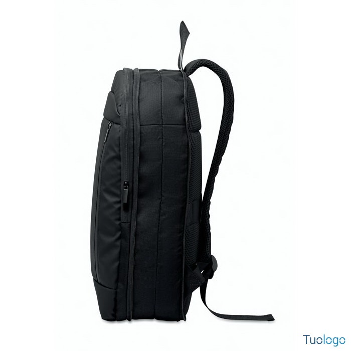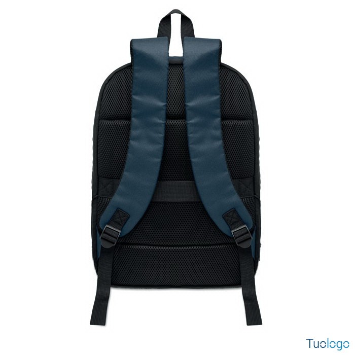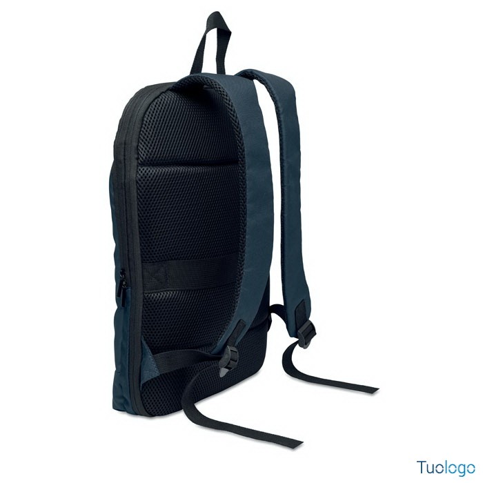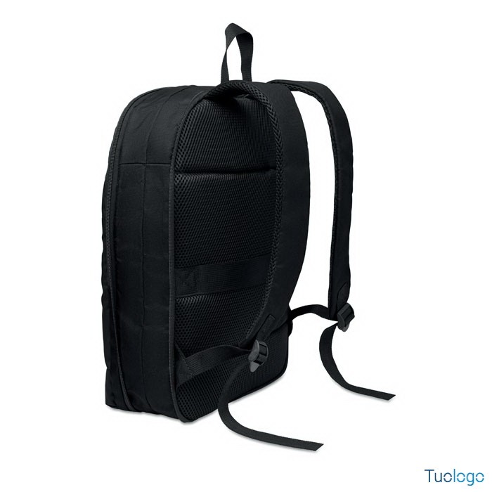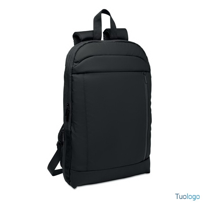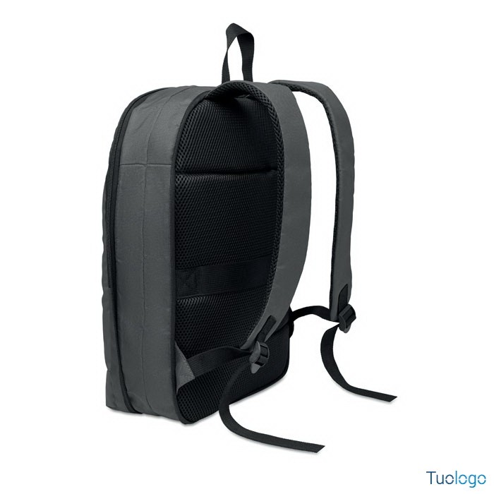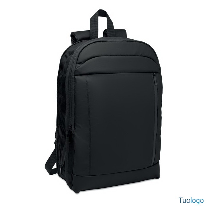 Zaino porta computer Soini. Zaino espandibile in RPET. Tasca nascosta con cerniera e scomparto imbottito per pc portatile, scomparto anteriore, schienale in rete e cinghia per bagagli. Dimensioni: 30x6x44 cm.