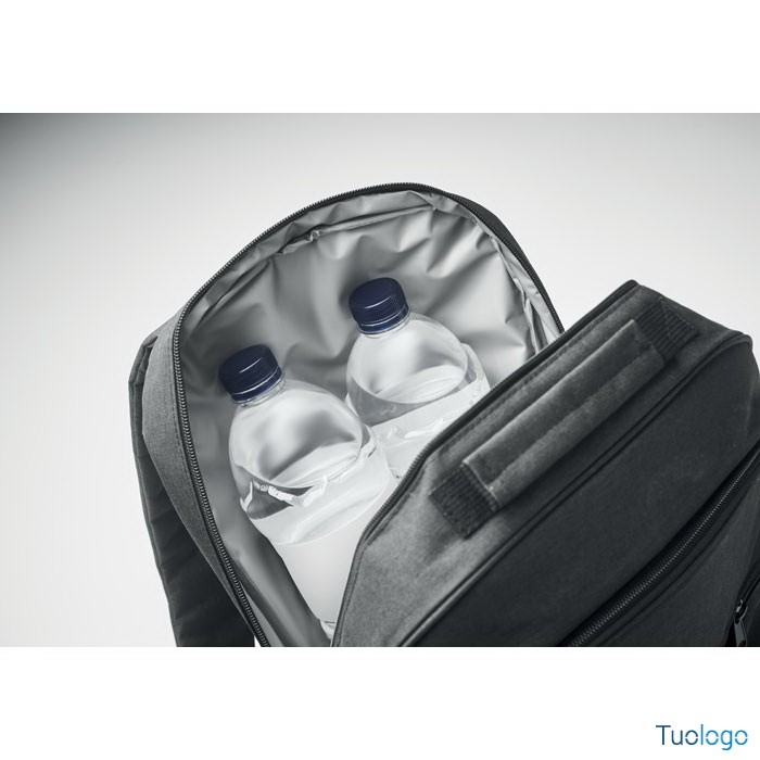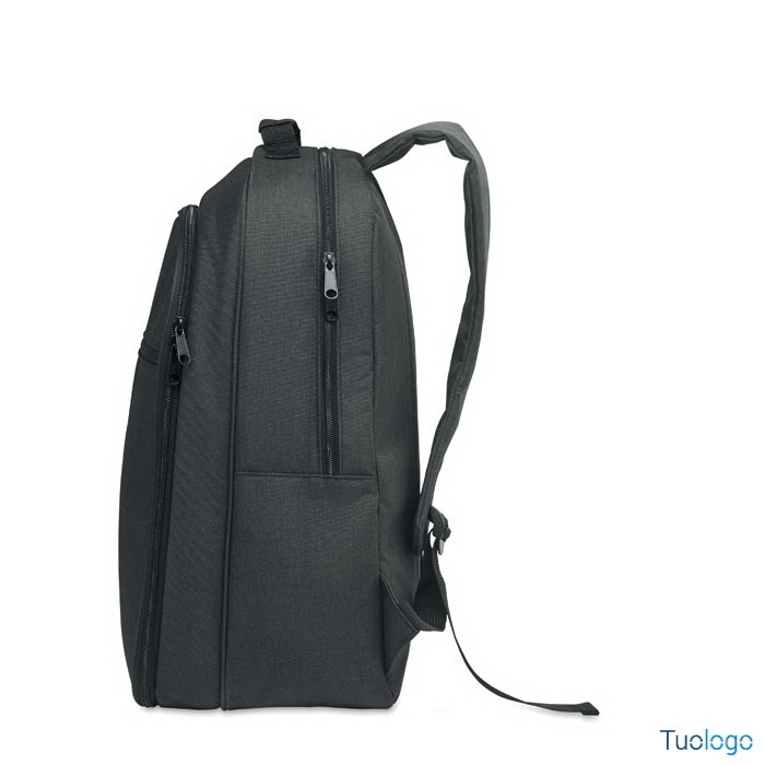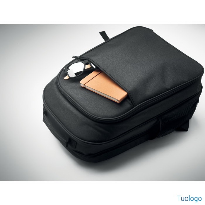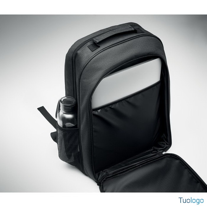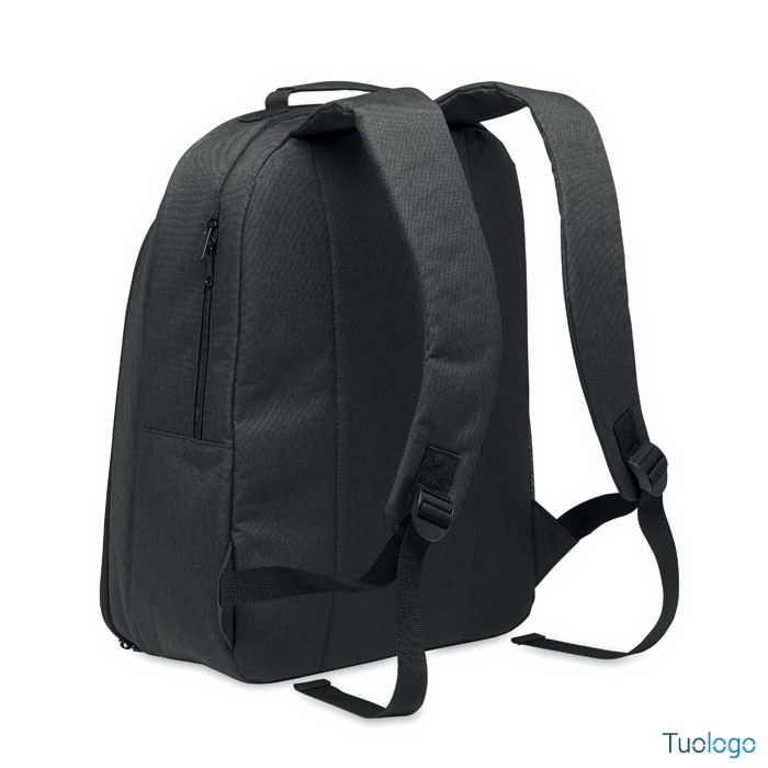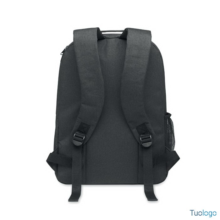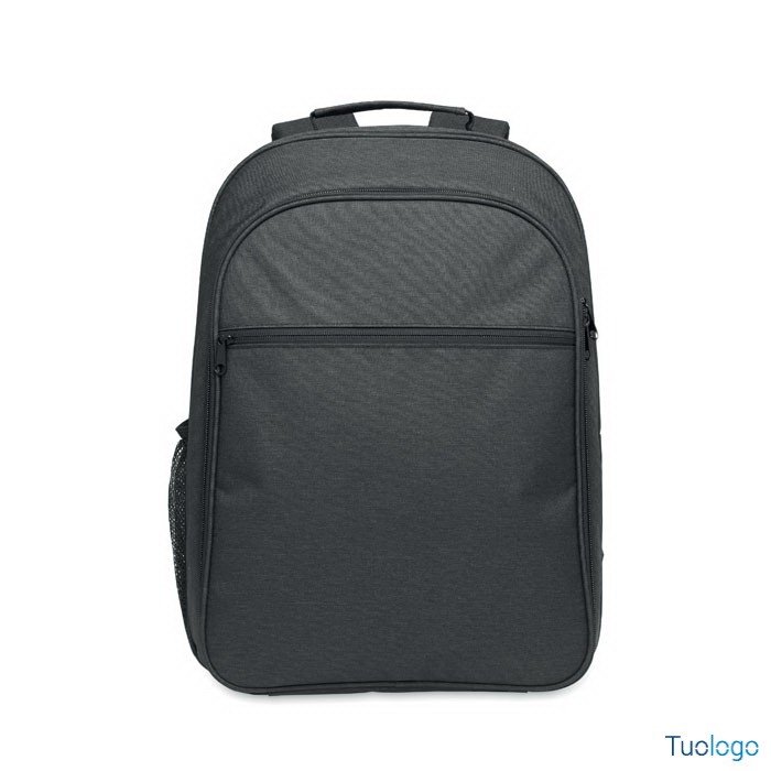 Zaino porta pc RPET Furtei. Zaino refrigerante in 300D RPET con scomparto per laptop da 15 pollici. Tasca frontale con cerniera e scomparto laterale in rete. Dimensioni: cm 45x19x31.