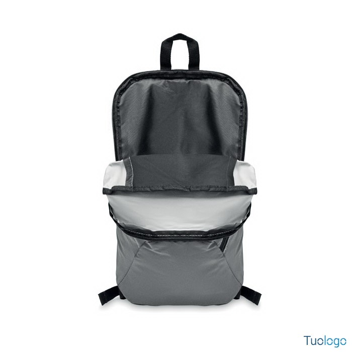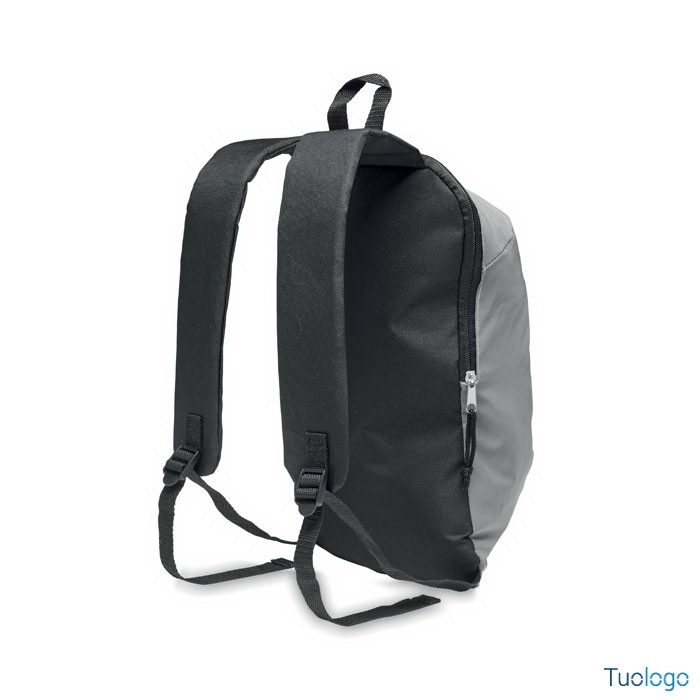 Zaino riflettente. Assicura la massima sicurezza con questo zaino in poliestere altamente riflettente con tasca con zip e imbottitura sulla schiena. In poliesere 600D. Dimensioni: cm 22x10x39.