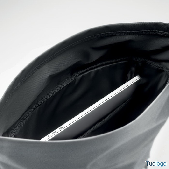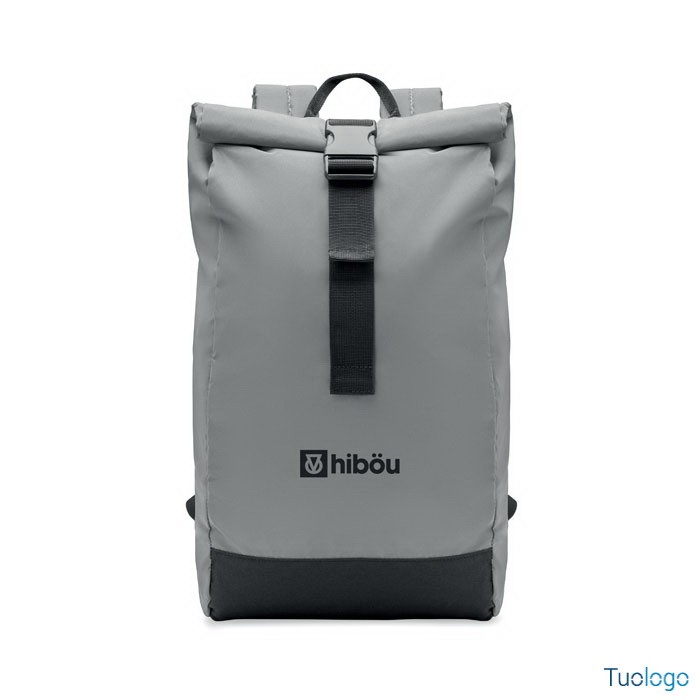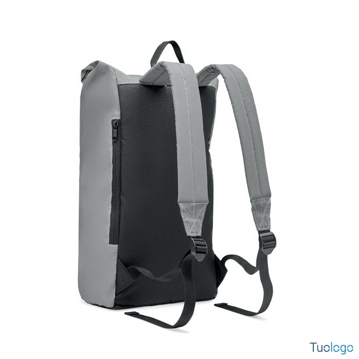 Zaino rolltop riflettente. In poliestere 190T altamente riflettente, porta computer. Lato interno chiusura a gancio e anello. Schienale, spallacci e fondo imbottiti. Dimensioni: cm 26x13x66. Tasca frontale con cerniera.